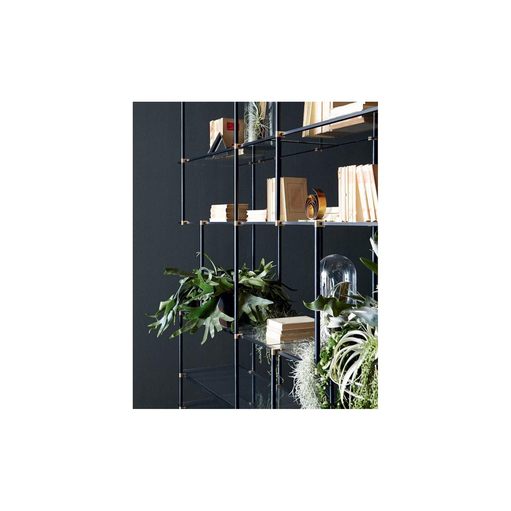 Shelving system with champagne or black anodised aluminium structure. Set of vertical lacquered supports in the colours grey, mustard, red or pink, on request (see fixed versions). 10mm extralight tempered glass shelves. Available also smoked “grigio Italia” glass.