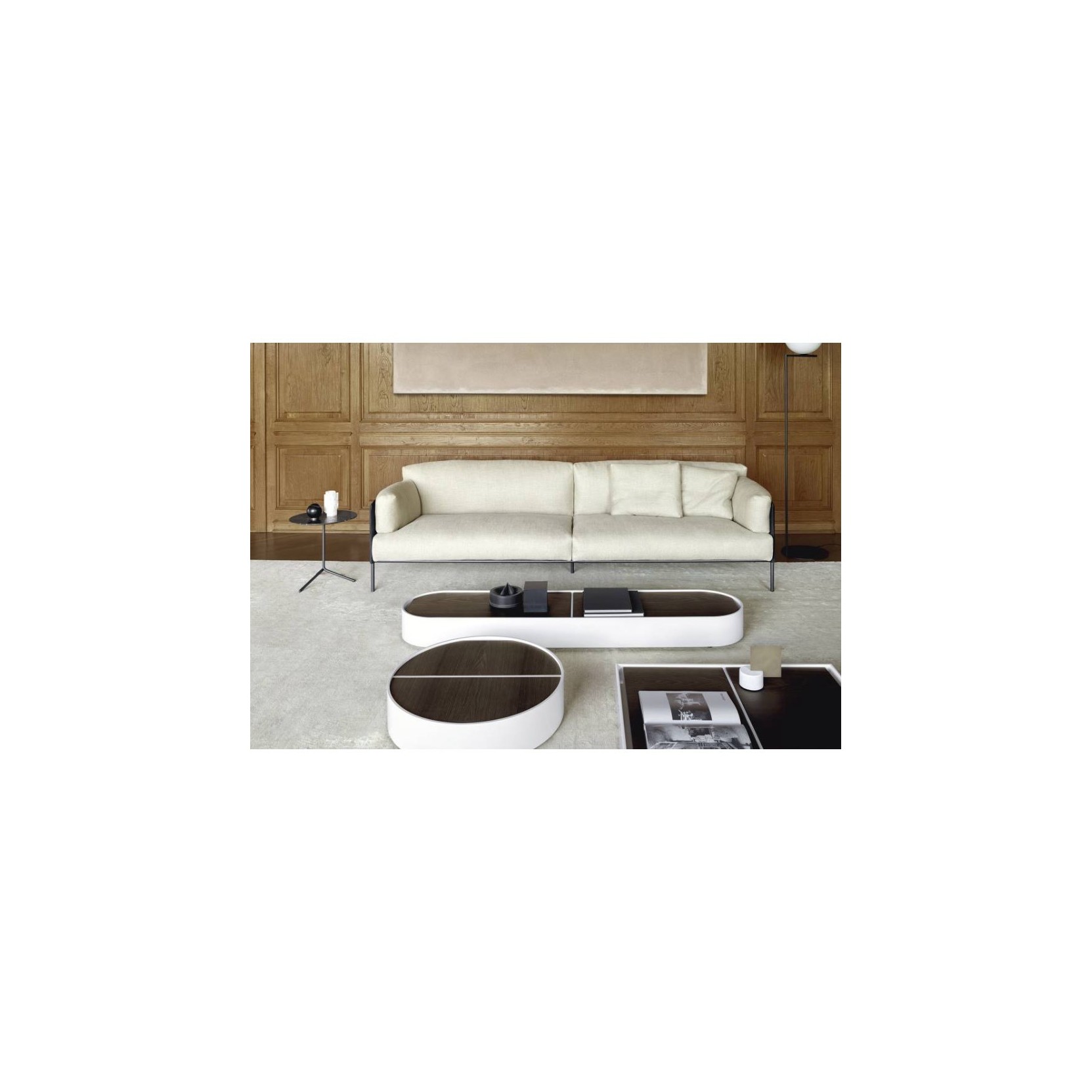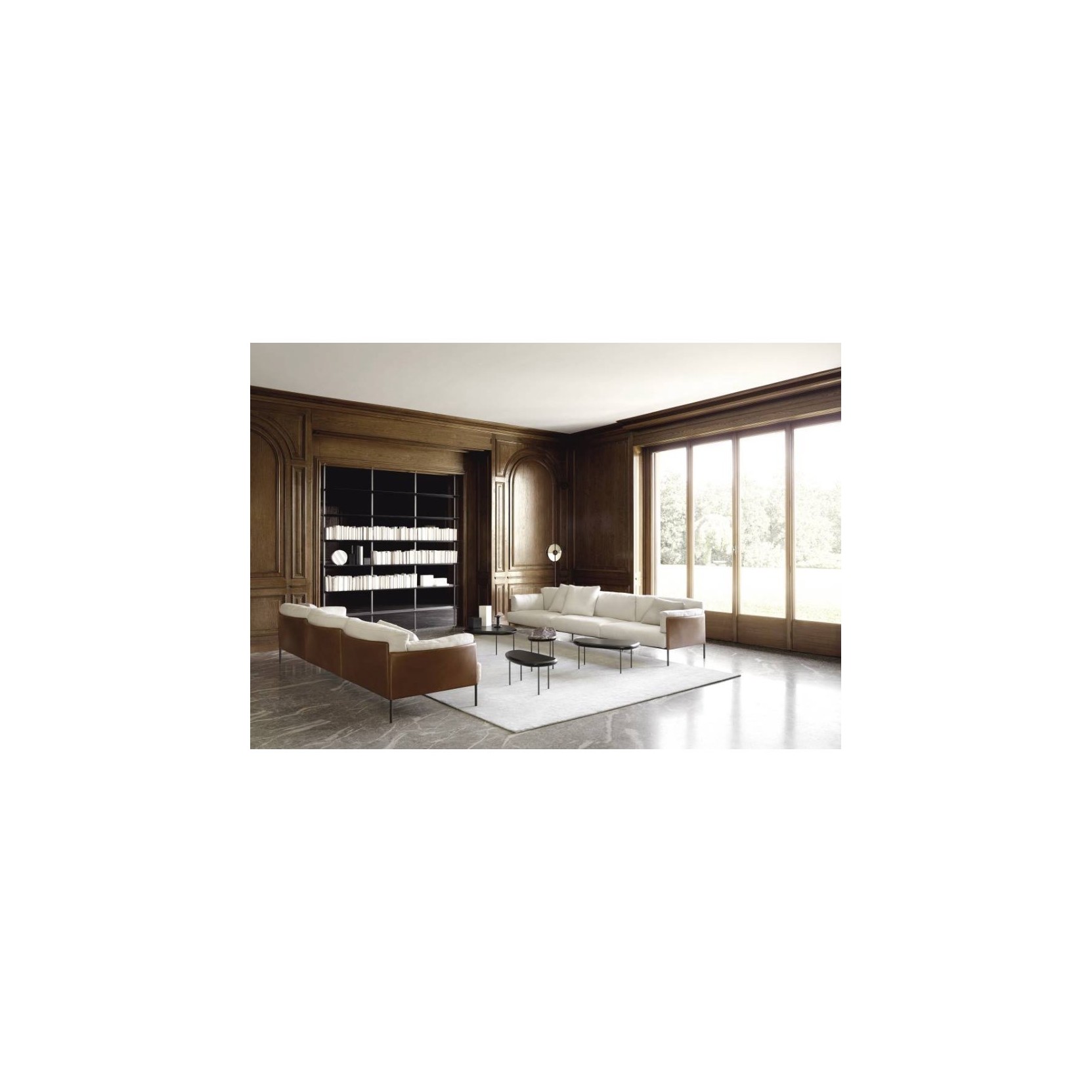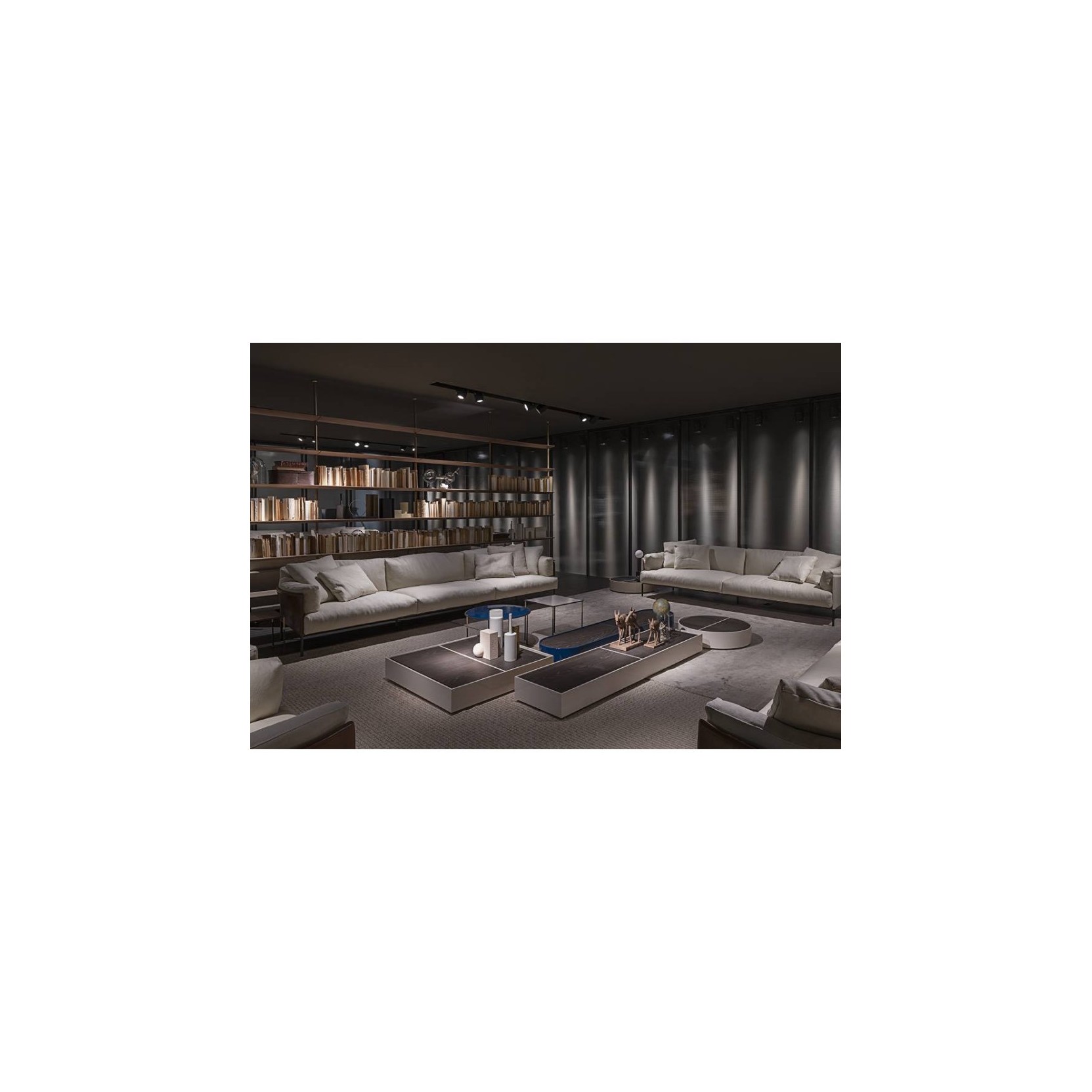 designs Greene, a sofa in fixed measures, defined by gentle curves for a relaxed and casual proposal: a structured yet soft perimeter welcomes ample cushions while standing on slender feet, restating once again the attention toward every small detail.