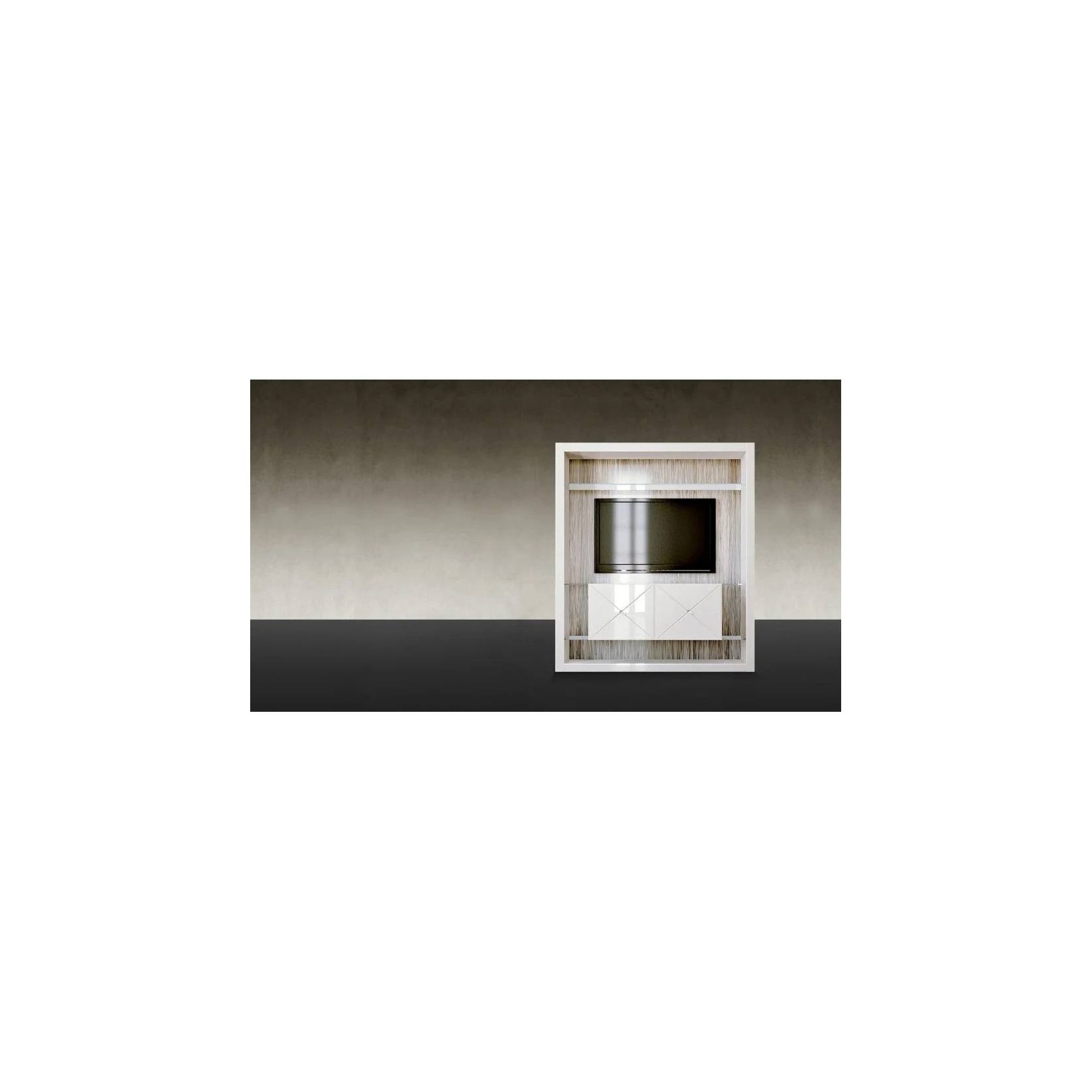Modular bookcase in shiny lacquered wood with application of bevelled lacquered glass or in shiny ebony wood with backs in Dune pattern design glass. Optional LED lighting, wood or glass doors in various sizes with possibility of engravings and handles. TV-unit module with double door storage in shiny lacquered wood with bevelled lacquered glass applications. can be joint to the Libreria to create various types of compositions. The collection includes the modules DUNE LUCHE H140: modular elements that can be connected together, with doors and/or back with Dune design glass.