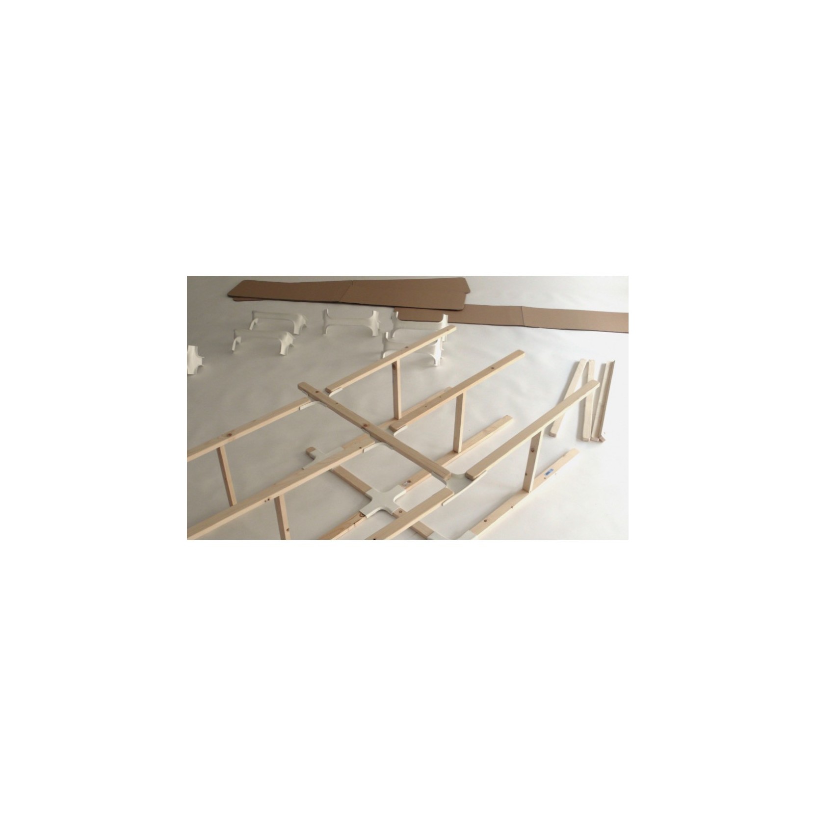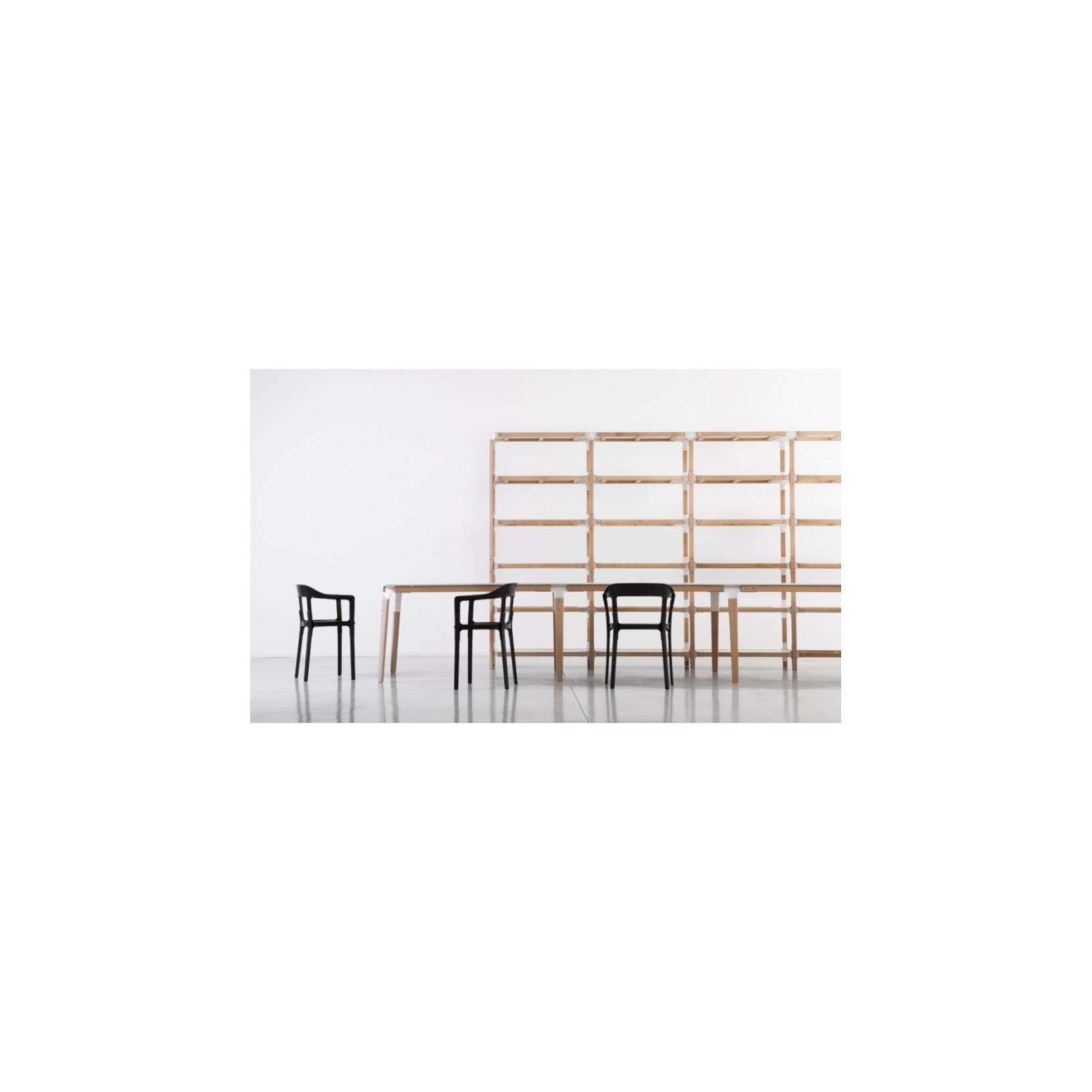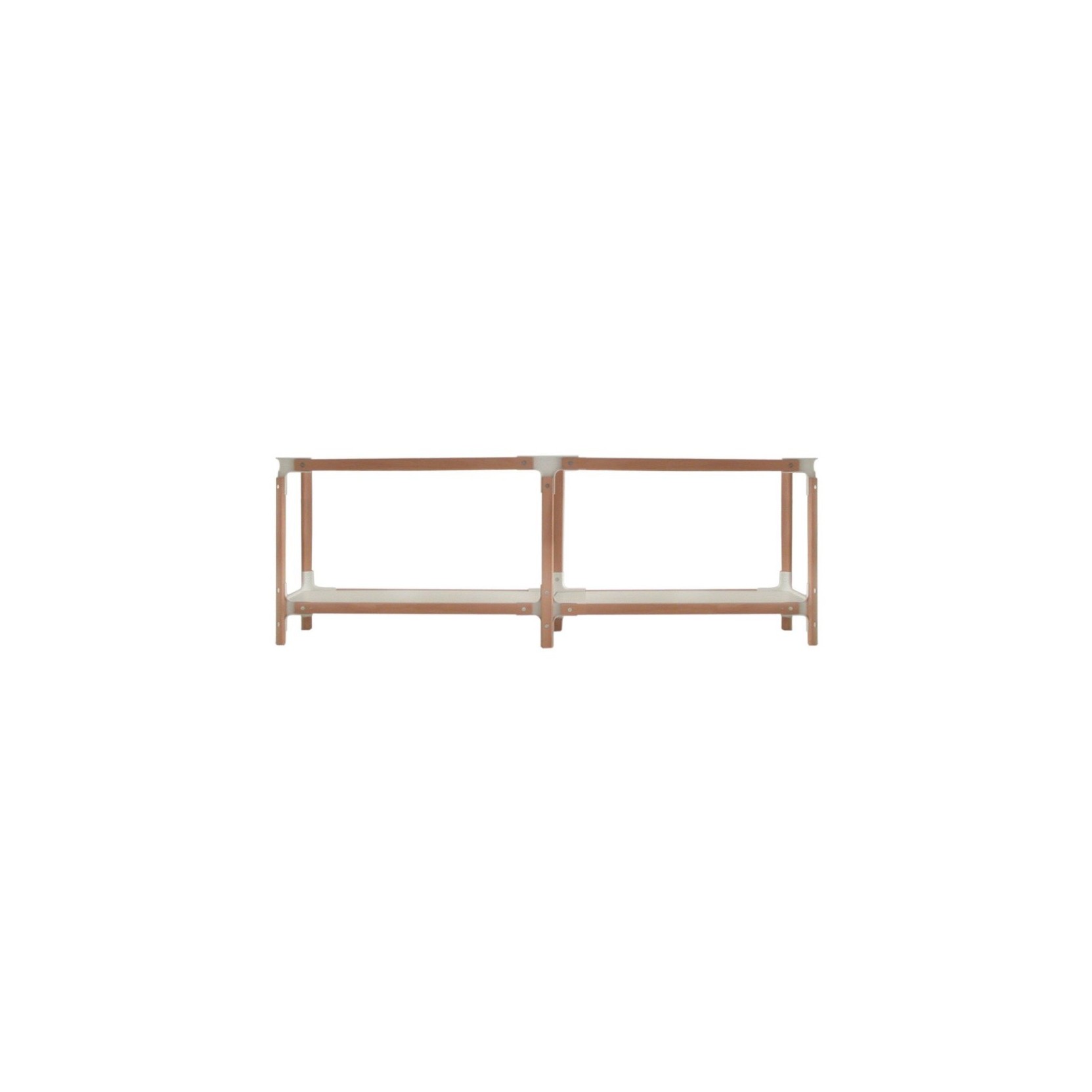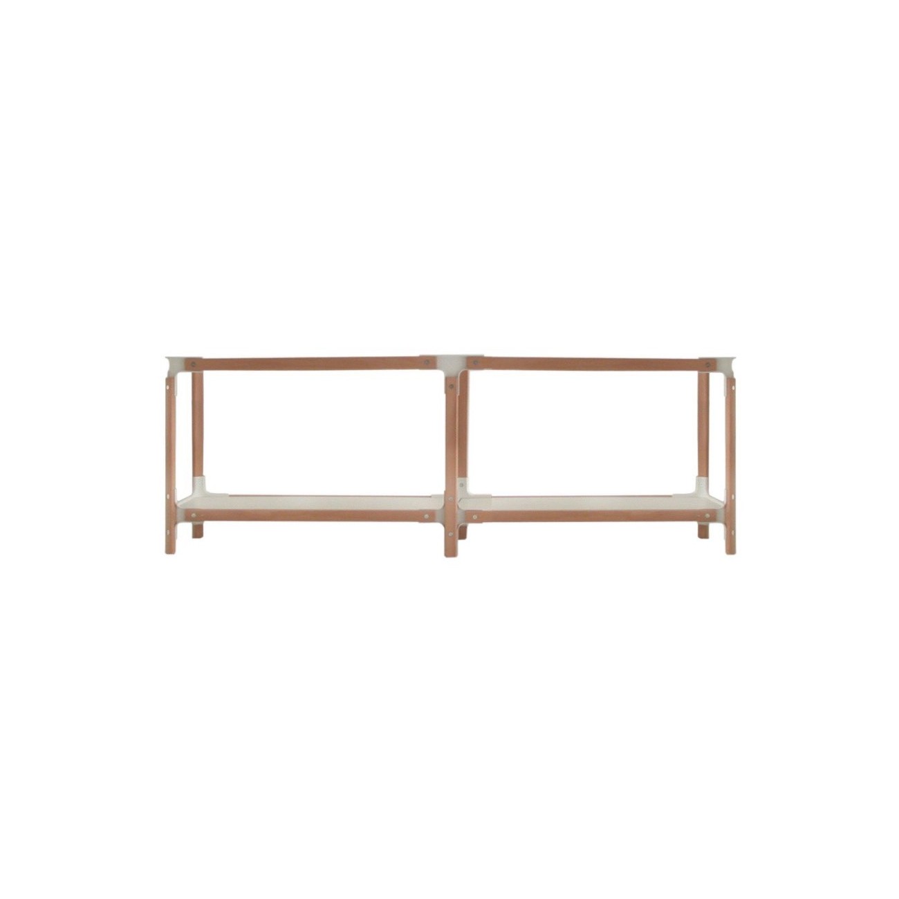 Shelving system. Material: uprights and crosspieces in solid beech (natural or painted). Joints in steel plate painted in polyester powder. Shelves in painted MDF. Available in different dimensions