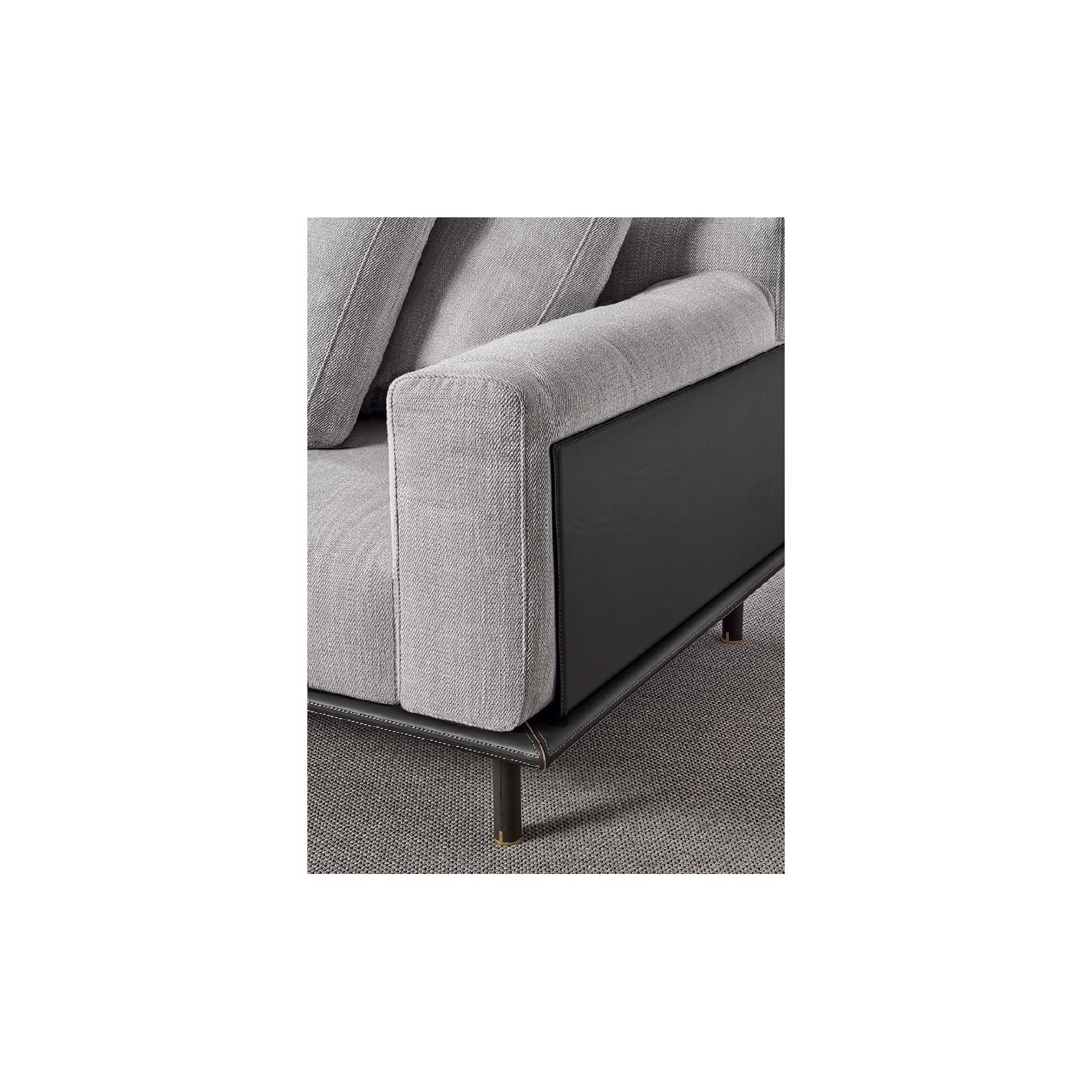 Sofas distinguished by elegant proportions, soft cushions and geometric lines are embellished by sophisticated construction details: side panels and a base covered in saddle leather are made precious by double-stitching and brass profiles.