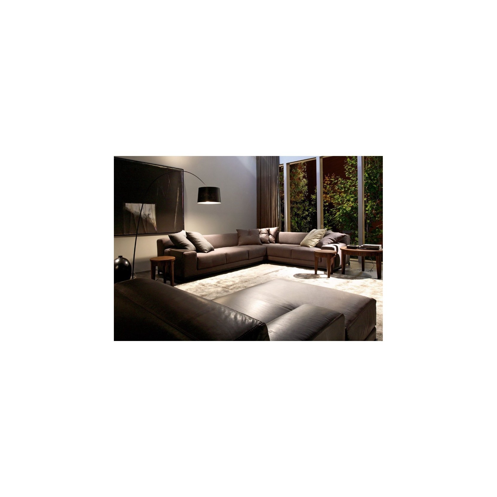 A real comfort island made of linear or curvilinear sofas and modular units, end units, corner units, a chaise longue and a pouf. The characteristics of the whole line is the absence of back cushions, large armrests and the matt black metal base showing a contemporary and metropolitan look.