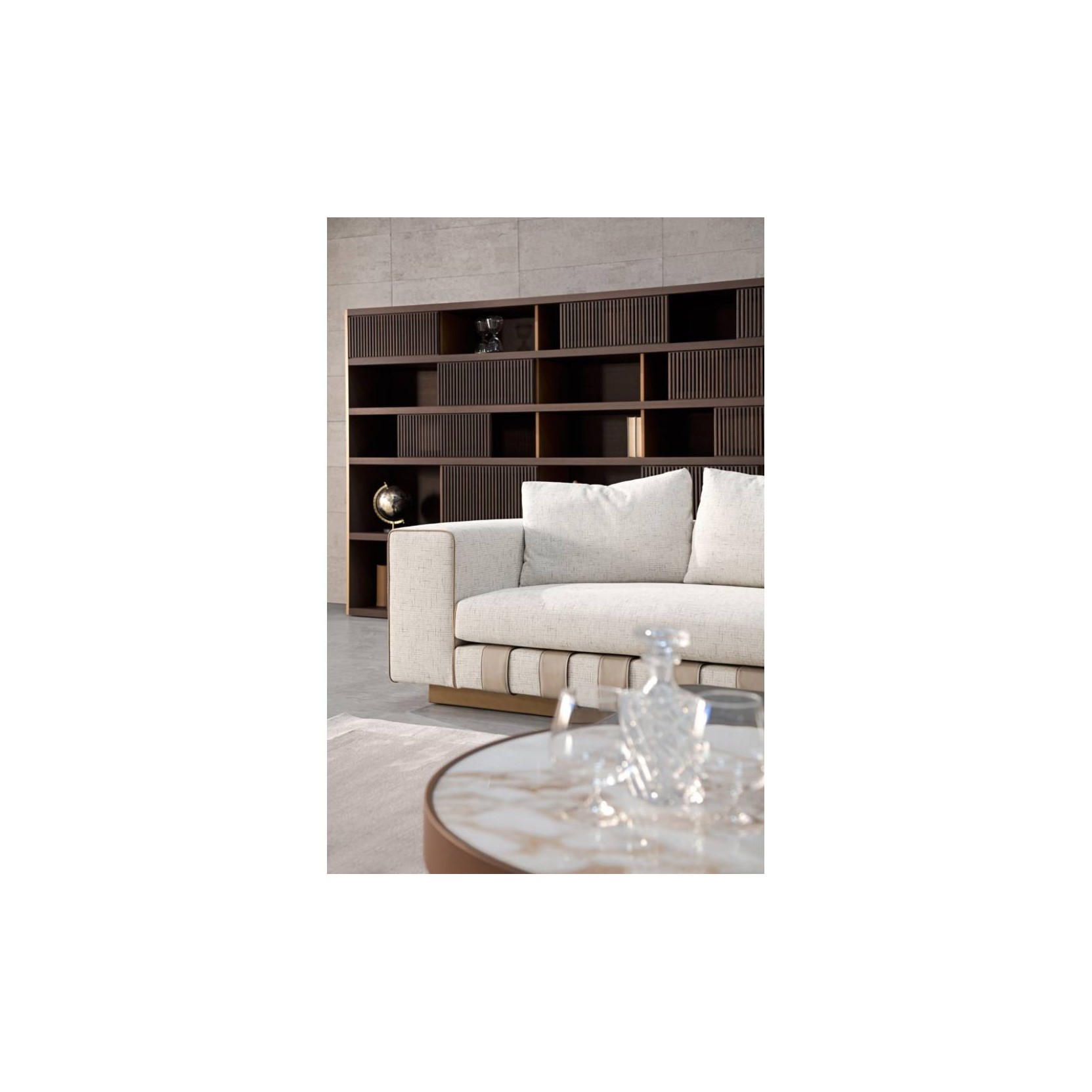 Rigorously elegant lines are suddenly overturned by an original decorative detail: eclectic leather bands, placed at regular intervals, envelop the silhouette of the Milano sofa, for a touch of sophistication and charm. A wooden base lifts the sofa off the ground, making it more harmonious and lighter looking. The vast combination of coverings and customisable leather bands available results in a truly tailor made sofa.