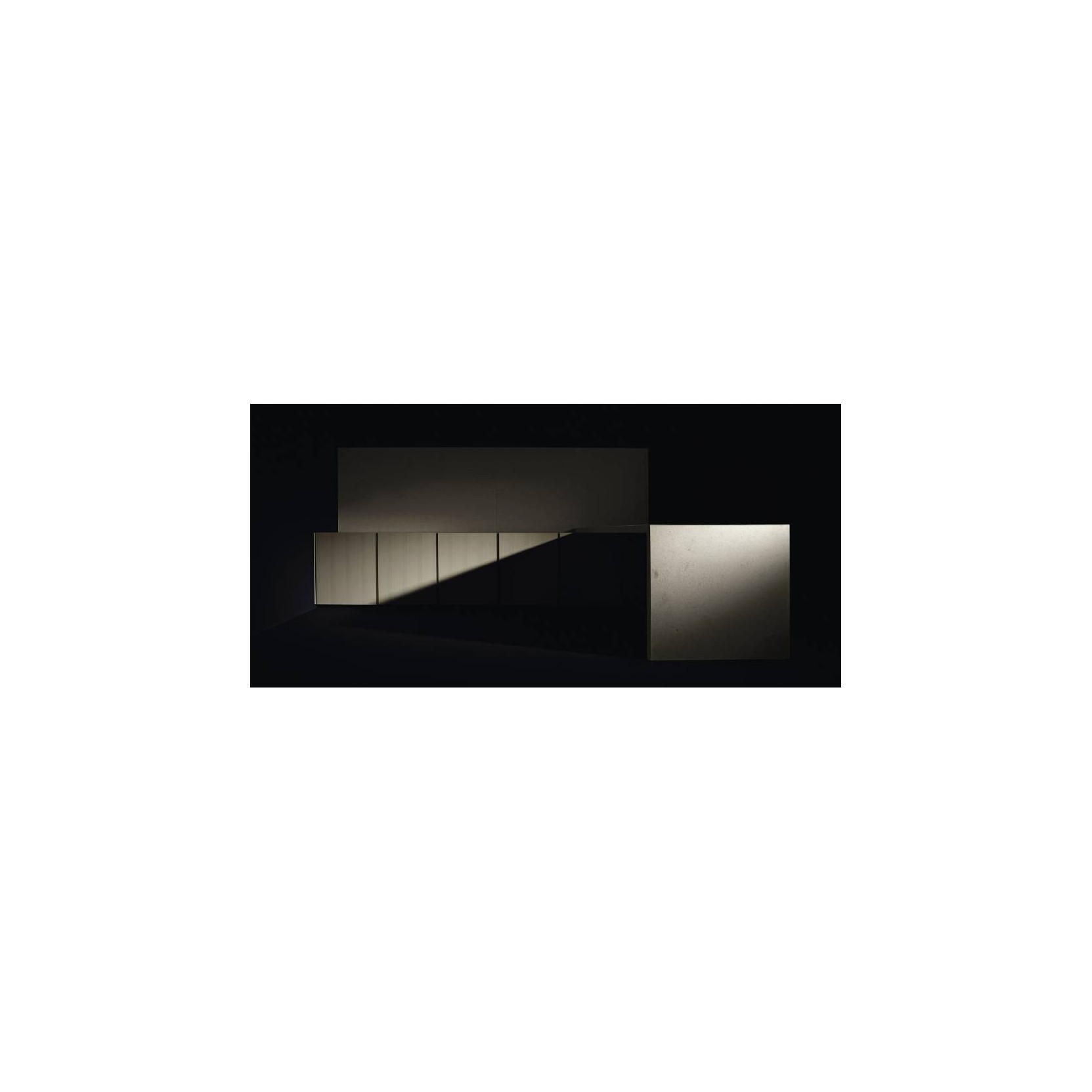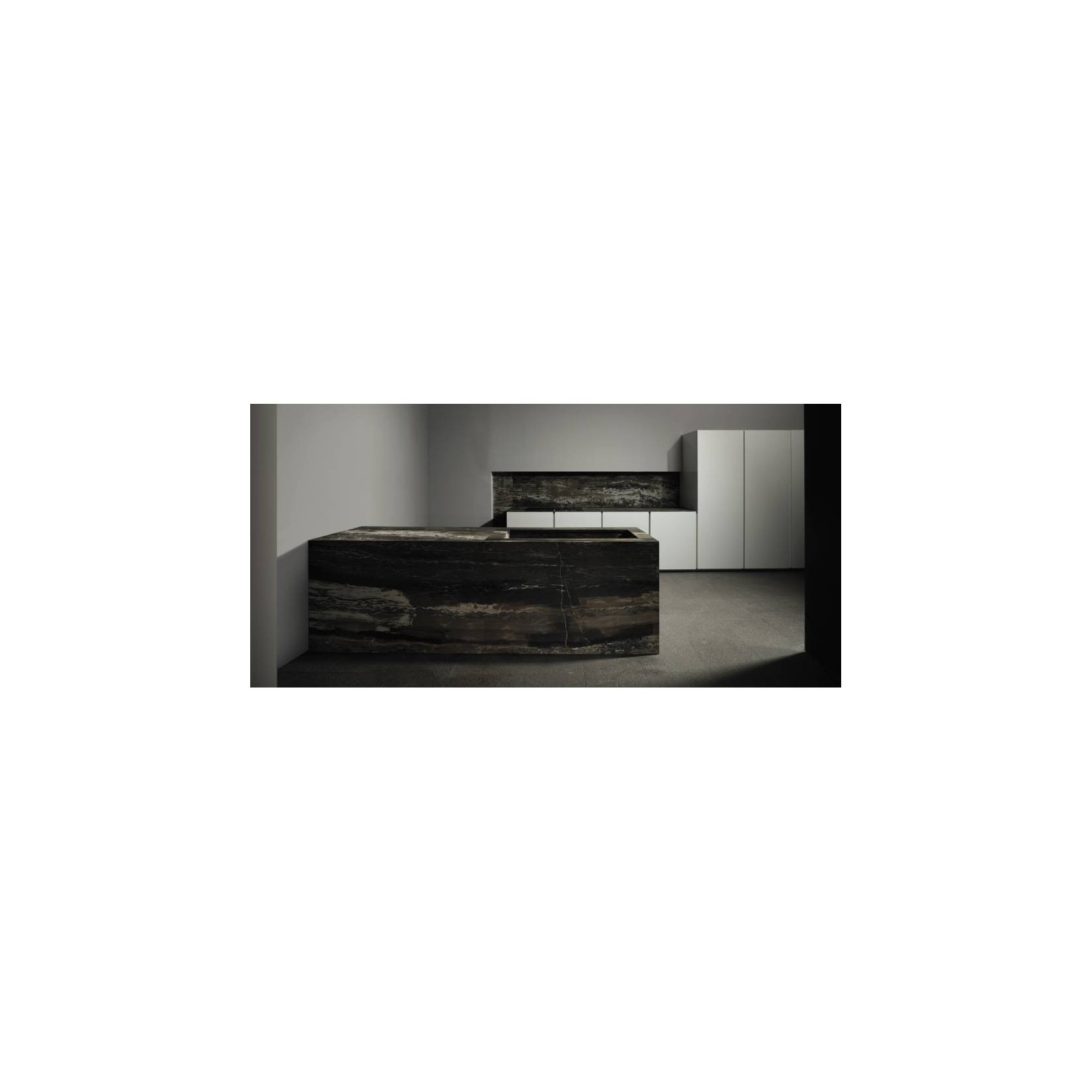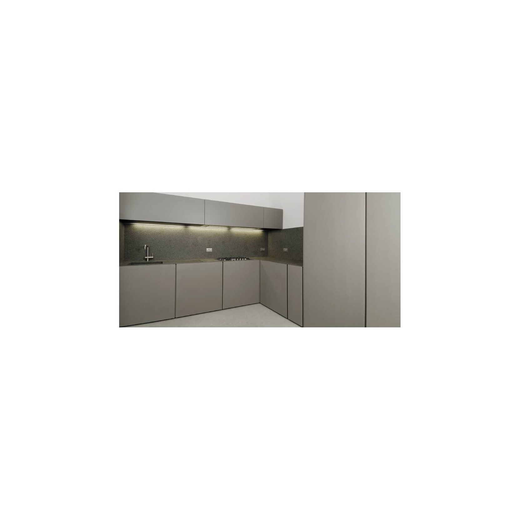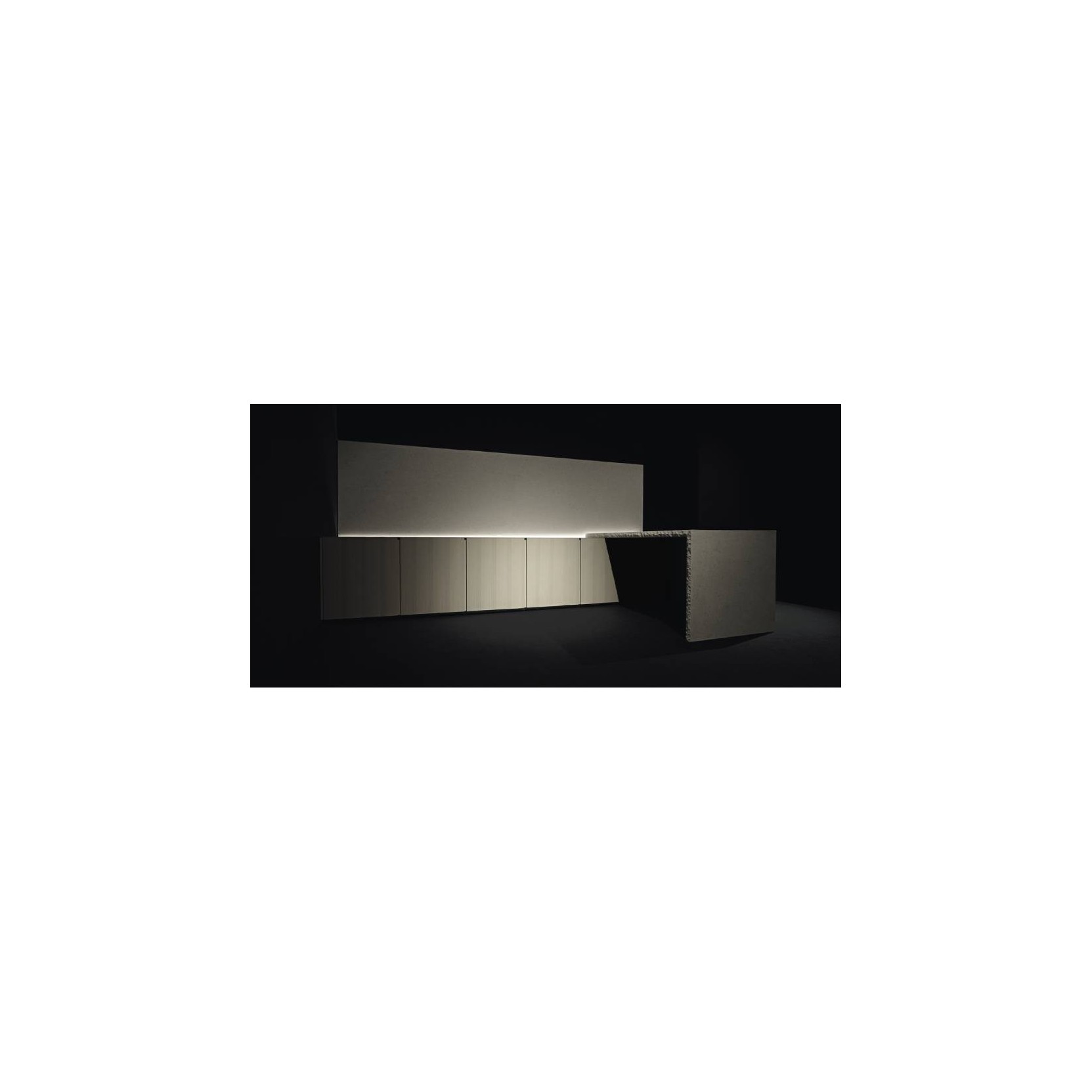 Inca has vertical profiles evoking a rhythm that defines the kitchen space. the worktop is hidden behind the doors so that a single horizontal line visually binds the different materials and finishes. the 45° edge worktop and doors transform the kitchen into a series of connected volumes rather than two dimensional arranged planes. tall units have the same vertical profiles.