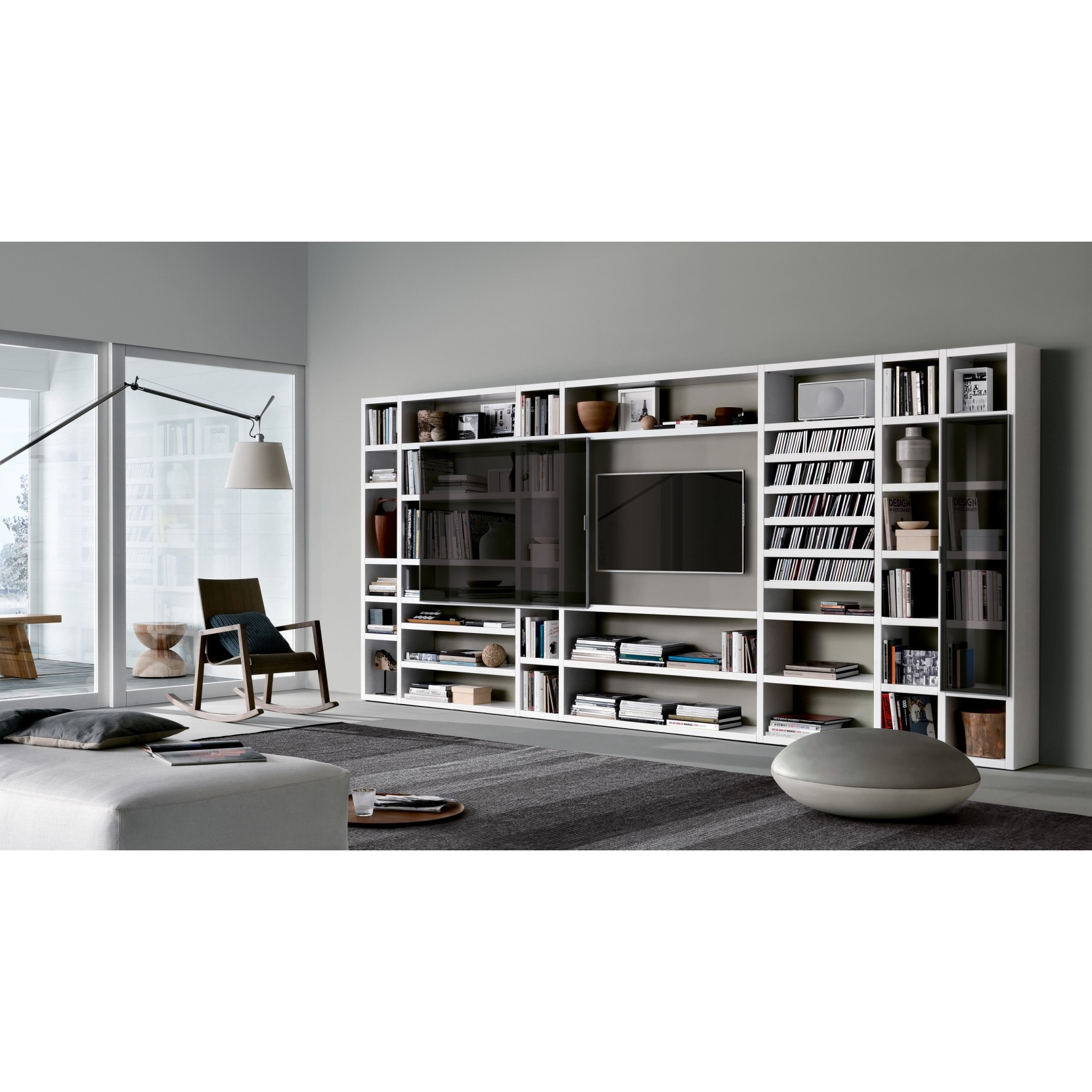 The system includes a wide range of modules in different types and sizes, with wall units featuring flap, hinged, or sliding doors, as well as drawers tailored to meet diverse storage needs. Available in the Fusion version, combining visible or lacquered wood particleboard surfaces, or in the Listellare version, crafted from fine cross-grained poplar blockboard, Crossing stands out for its structural lightness and exceptional stability. The elements are distinguished by thick panels that convey a sense of solidity and material richness, while special integrated LED lighting systems enhance the user experience and highlight the elegance of its forms. Finishes range from matte lacquer to glossy colors, as well as natural wood and veneers, allowing for tailor-made and highly aesthetic space designs.
