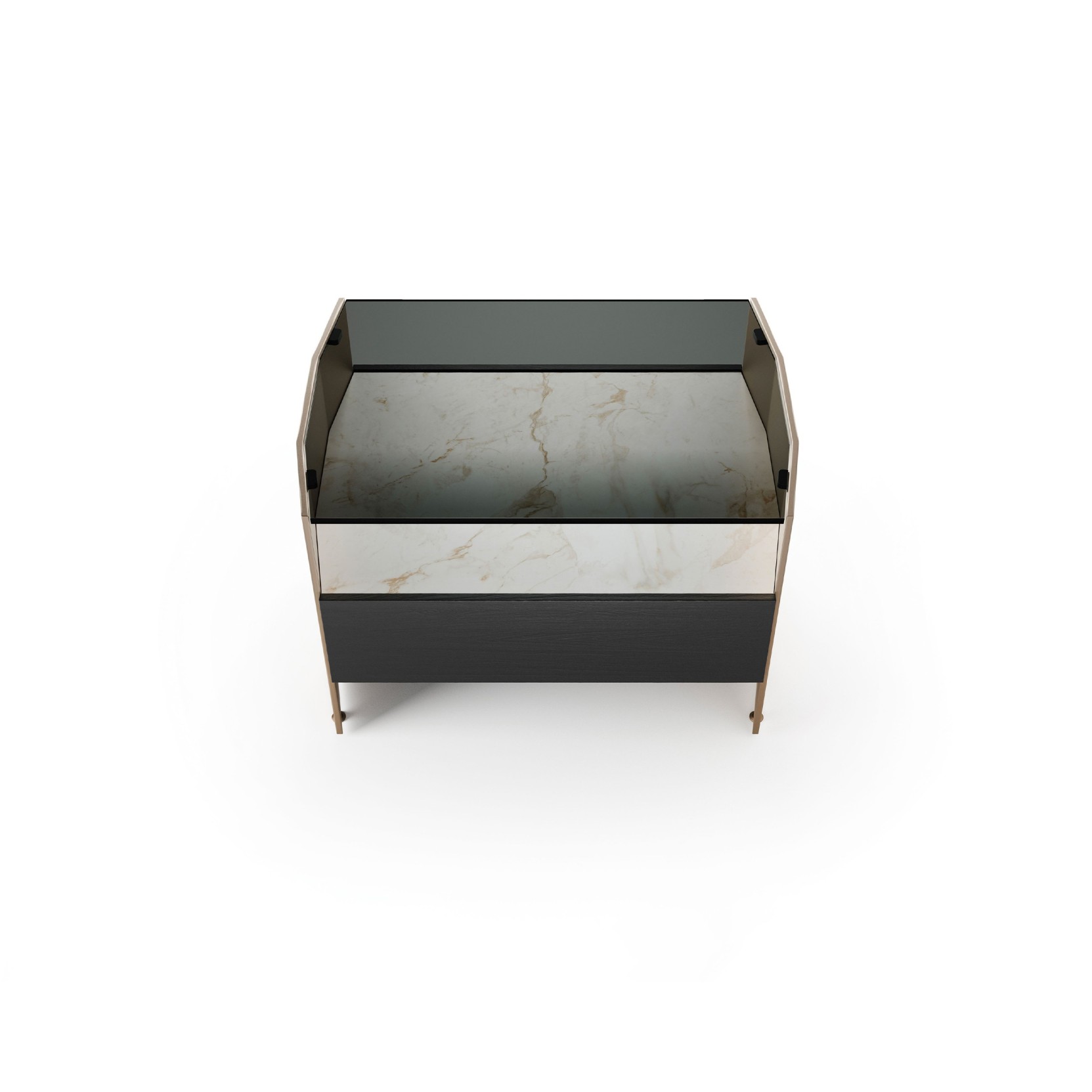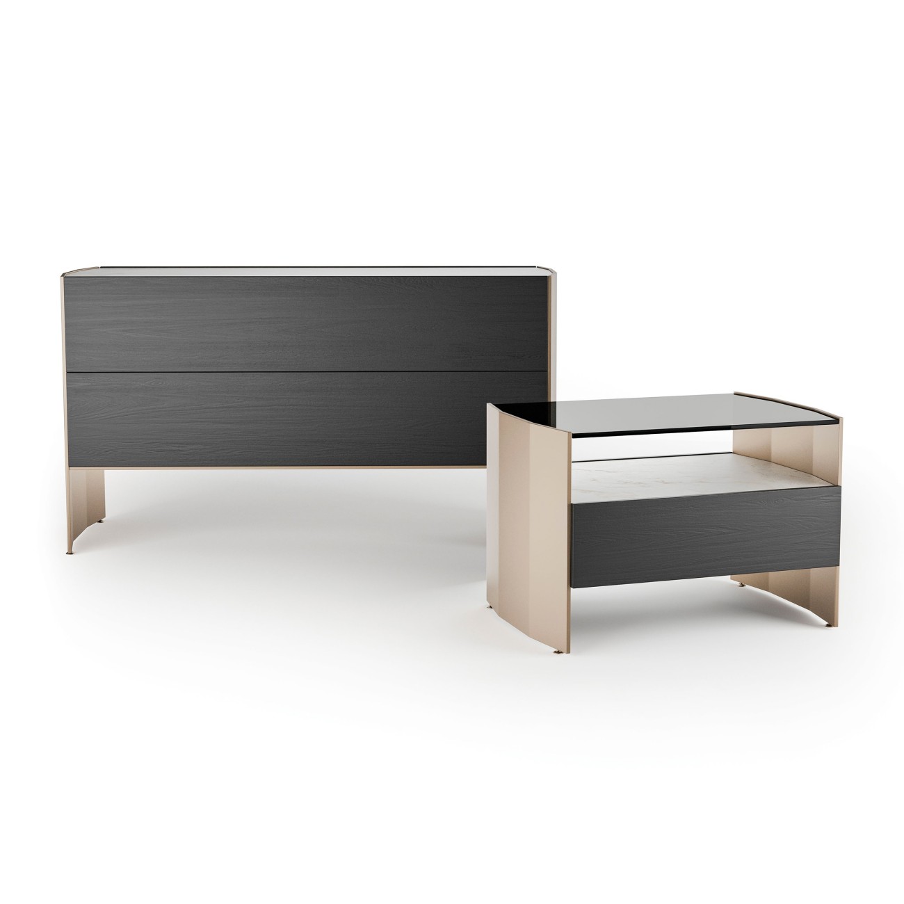 Functionality is just as important: the dresser features two drawers with an interior finish in Primo Fiore laminated wood, while the nightstand is equipped with a 12 mm glass shelf and a drawer with the same interior finish. Additionally, there is the option to choose a fixed front, ideal for dual-sided use, maintaining the balance between aesthetics and practicality. The sculpted sides are made of matte-painted aluminum in Bronze and Gunmetal finishes, while the outer structure and drawers come in matte or glossy wood finishes, such as Black Oak, Olmo Grey, Tobacco, and Eucalyptus. The interior of the drawers is finished with Primo Fiore laminated wood and features soft closing guides with full extraction. The sculpted top, 19 mm thick in wood finishes or 20 mm thick in marble, adds a touch of elegance, while the glass shelf, available in extra-clear or smoked transparent, adds lightness and delicacy.