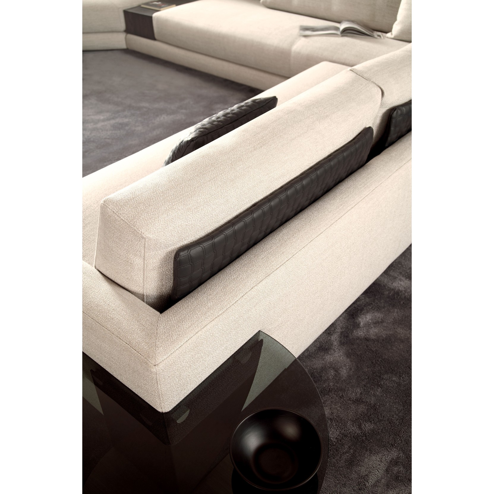 The system includes central, terminal, and corner modules – with armrests or integrated surfaces – that can be arranged in linear or corner compositions. Structure in plywood covered with molded flexible polyurethane. Feet in Gunmetal matte finish, H. 80 mm. Seat cushions in differentiated-density polyurethane foam covered in polyester fiber. Back cushions in polyester fiber and sterilized feather, with integrated metal frame for enhanced support. Removable cover available in fabric, faux leather or leather. Optional bicolor version with contrasting rear cushion cover and quilted detail on leather or nubuck finishes. Armrests available in three sizes: L.100 mm, L.300 mm, or with integrated surface in wood veneer – finishes include: Black Oak, Grey Elm, Tobacco, Eucalyptus, Ebony – matte or glossy. The Argo collection also includes independent bookcase units, made of 38 mm thick wood particles, available in matte/gloss lacquer or wood veneer finishes: Black Oak, Grey Elm, Eucalyptus, Ebony, Canaletto Walnut, and Tobacco.