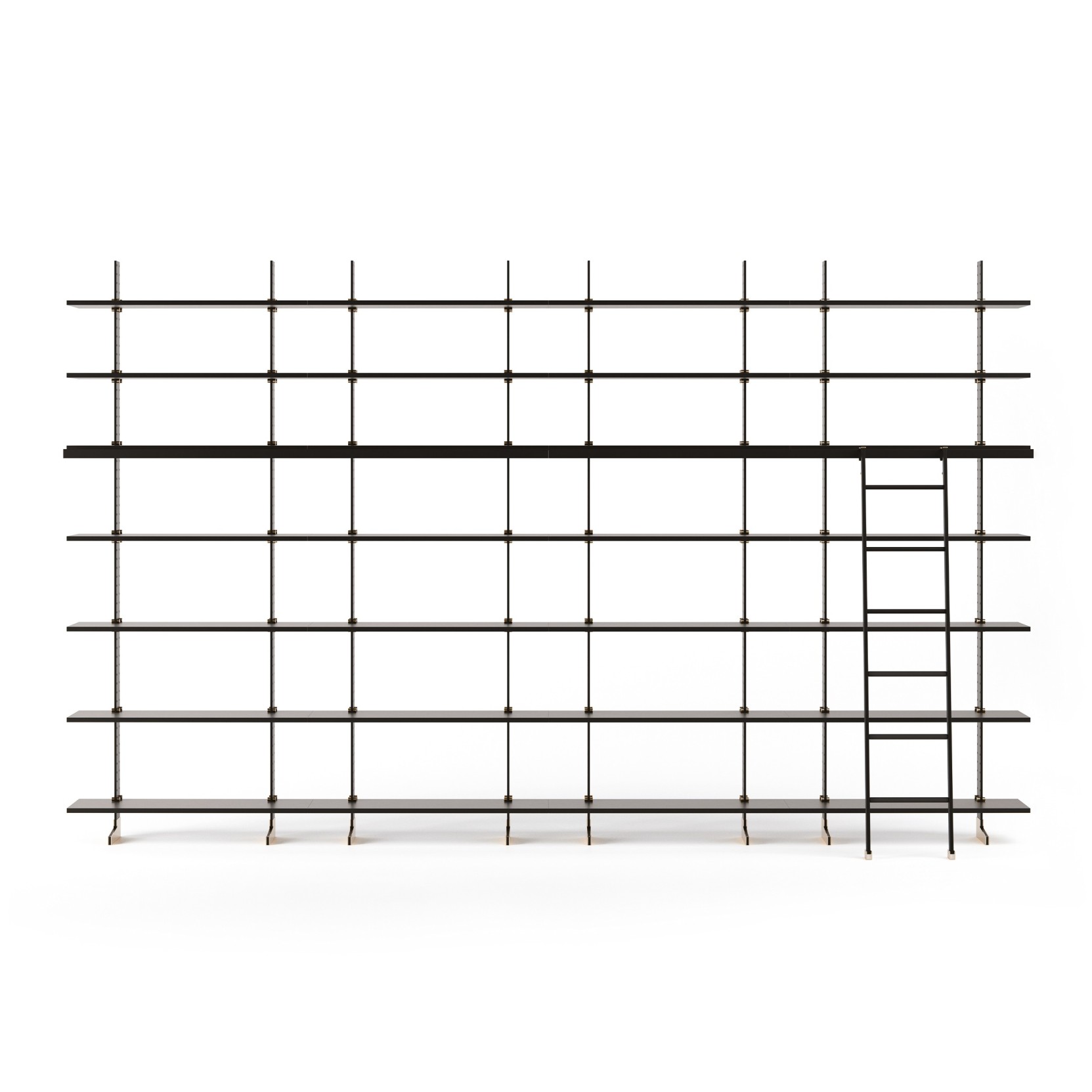 The structure revolves around a black epoxy-painted steel upright, perforated every 40 mm to allow maximum layout flexibility. The shaped steel base with chromed brass tips and chrome-plated steel wall brackets underline its architectural precision. Shelves, available in two depths, come in either matte lacquer or brushed wood veneer, serving as writing surfaces, TV stands or audiovisual equipment platforms. A black lacquered metal ladder with chromed brass details completes the system, expressing a timeless elegance. Horizontal modularity is achieved through the side-by-side alignment of single elements, transforming this historical piece into a flexible and enduring furnishing solution.