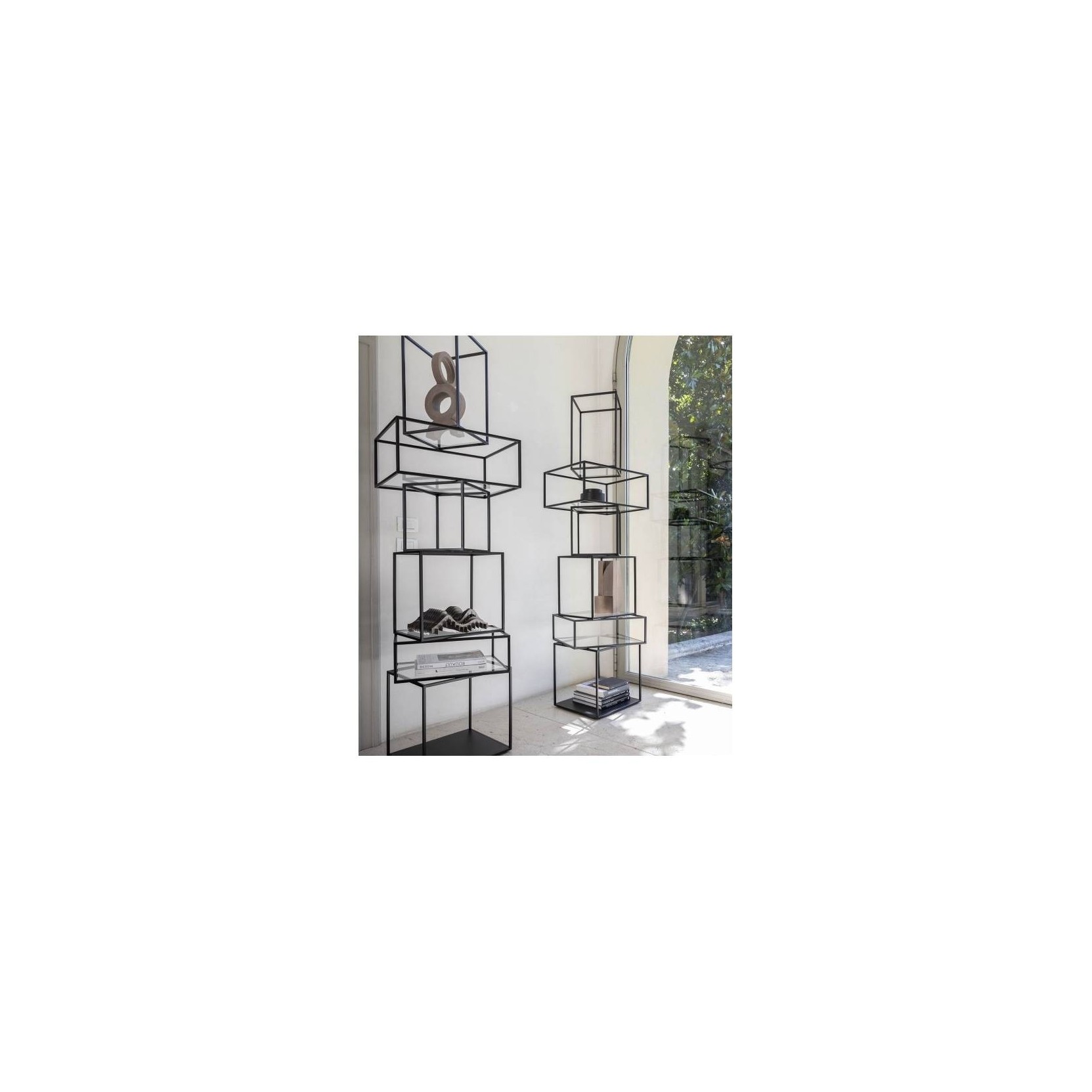 Babylon is a freestanding open container in black painted metal, complete with glass shelves. From simple and light lines to display objects and books, it fits in any room of the house.