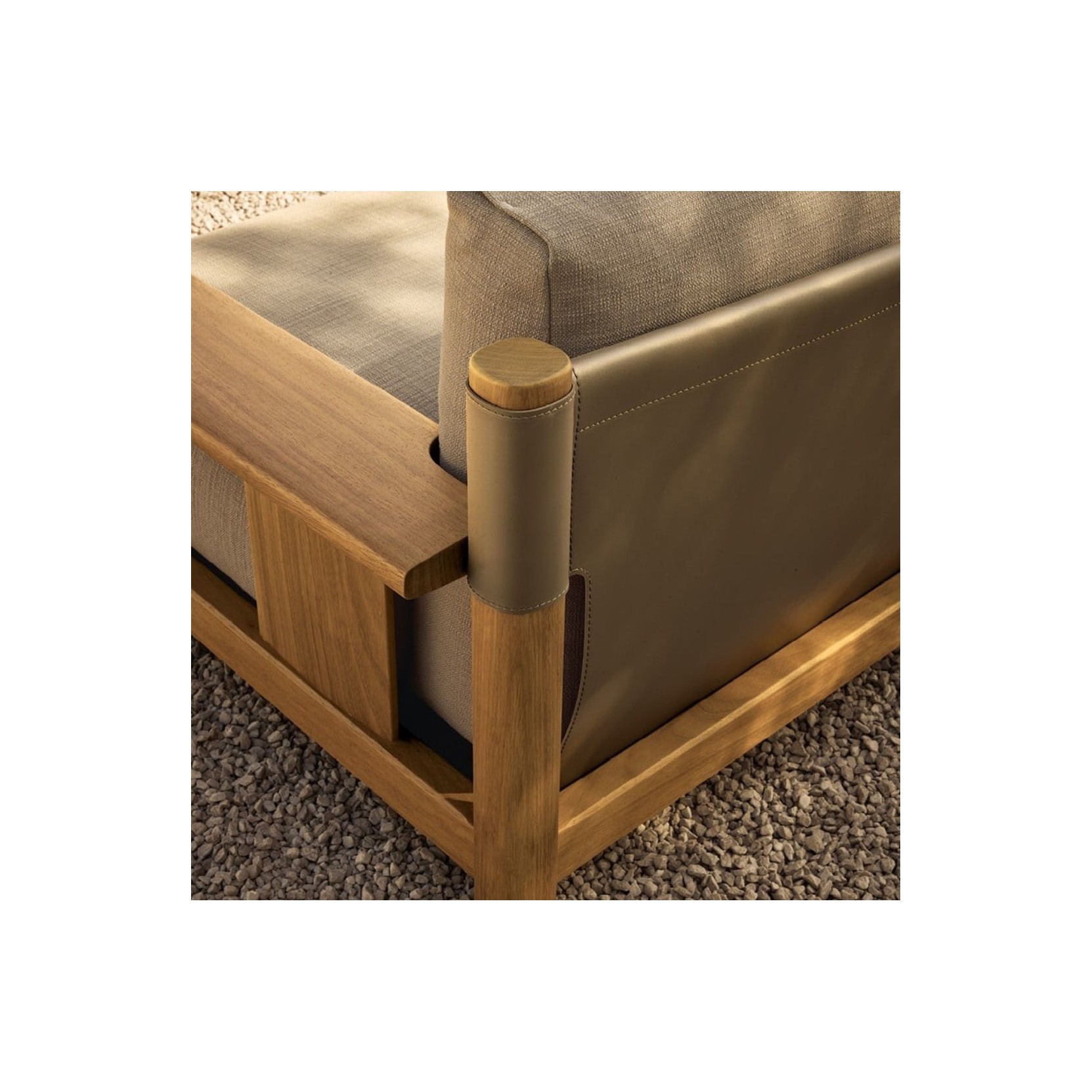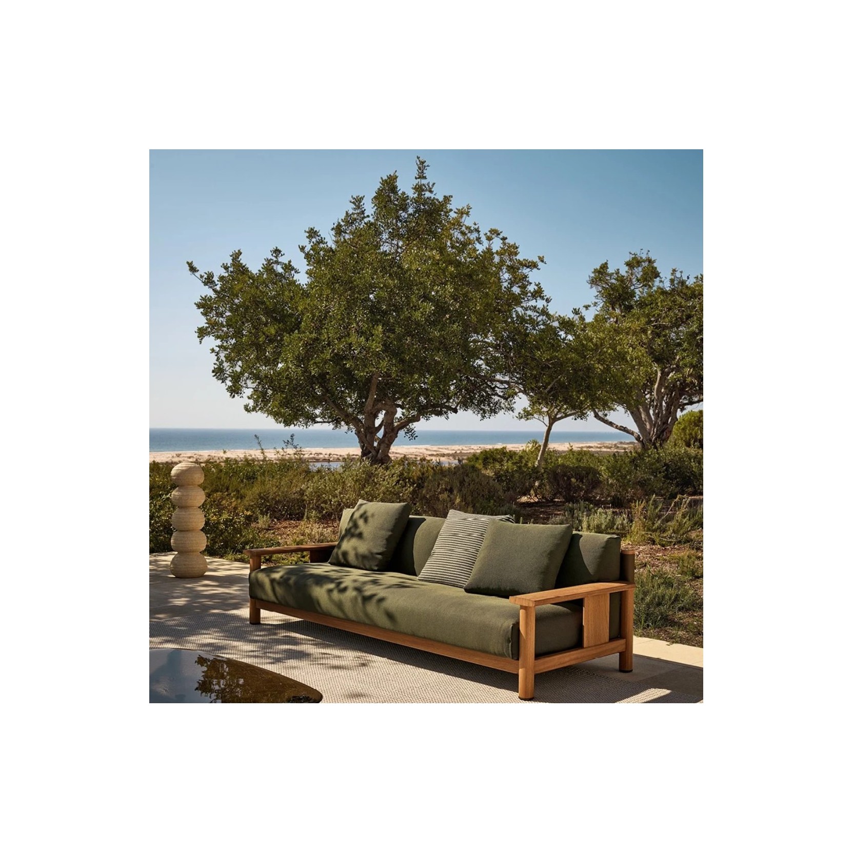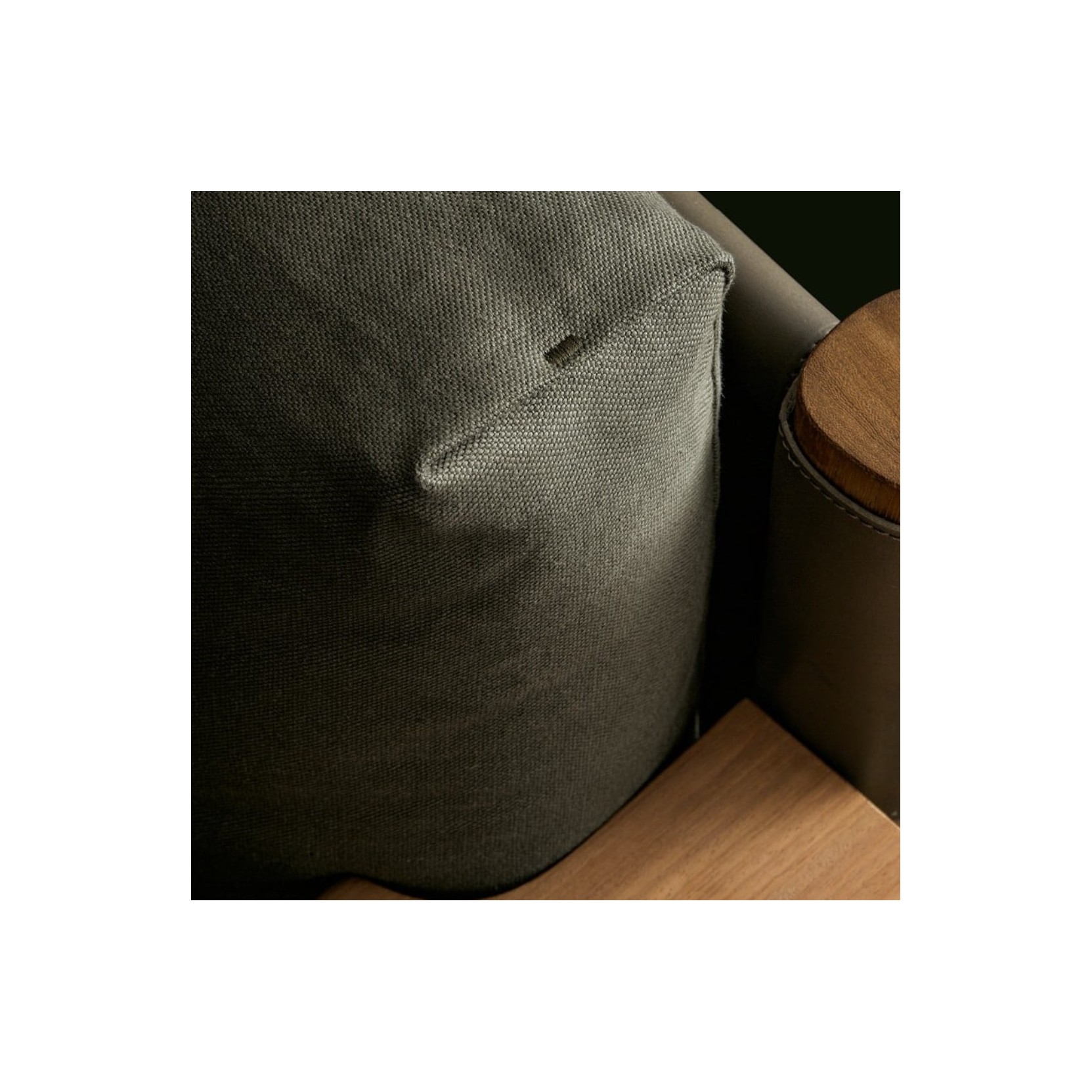 The sofa features a structure made of solid natural iroko or solid black stained iroko, with a backrest in EVA stained in various colours. The seat cushion and backrest are made of recycled polyester PET with a polyurethane insert for optimal comfort. An optional cushion made from recycled polyester PET is available. The pre-cover is made of polyester fibre, and decorative drawstring stitching adds a refined detail to the design. The cover is removable, made of fabric, for ease of cleaning and maintenance.