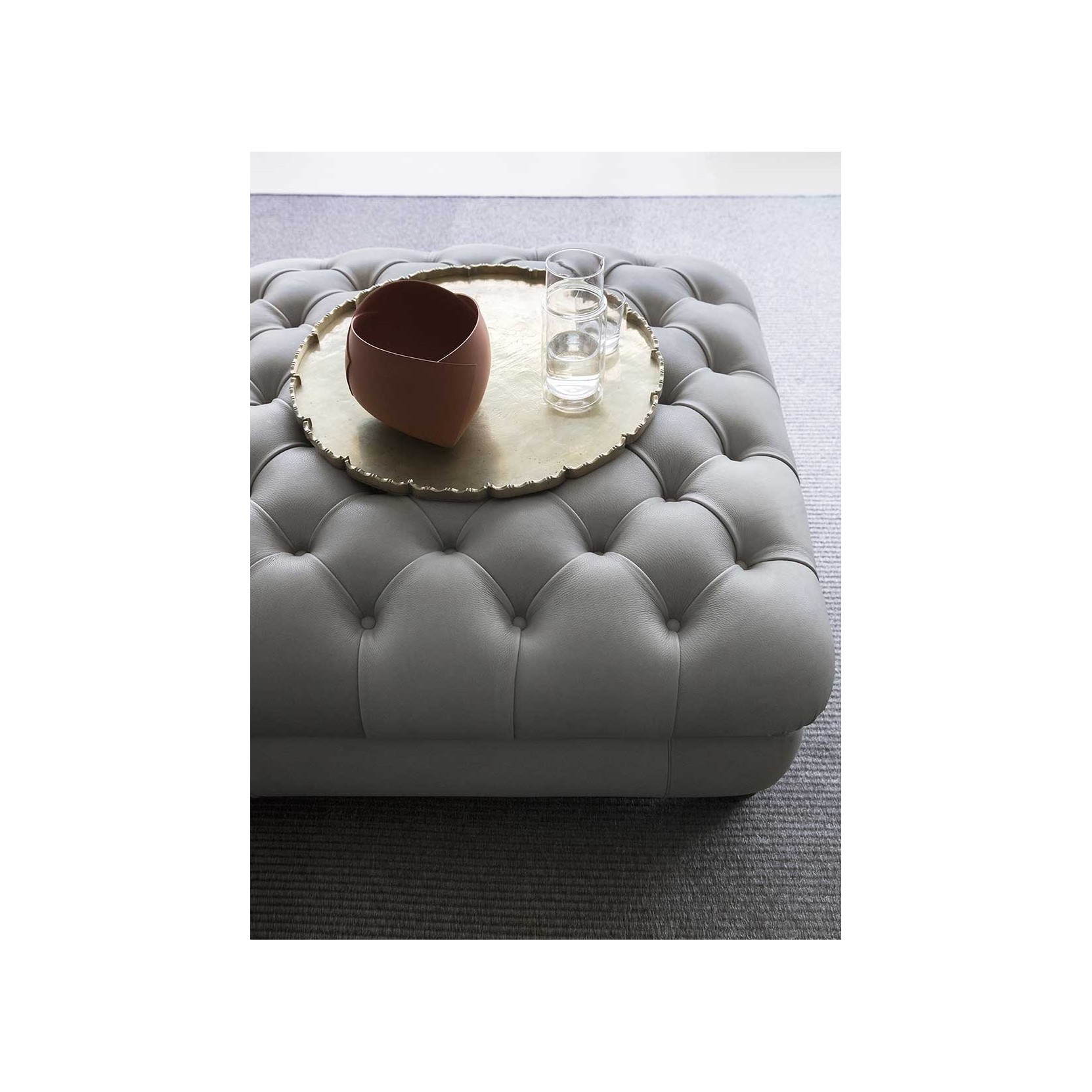 Chester One is the evolution of the classic pouf, reinterpreting Renzo Frau’s iconic 1912 design with a new vision of comfort and contemporary elegance. The solid beechwood frame ensures durability, while the suspension system—featuring hand-tied steel biconical springs secured with jute straps—provides elasticity and resilience. The padding is crafted from premium materials: hand-shaped vegetal horsehair for the backrest and armrests, rubberized horsehair for the seat, and a cushion filled with goose down and polyurethane foam for enveloping support. The feet are available in different styles: spherical or high, in dark walnut-stained or black-lacquered beechwood, or in wood covered in leather. The Pelle Frau® upholstery, offered in ColorSphere®, Heritage, Nest, Soul, and Velvety, adds a refined touch, while the entirely hand-stitched capitonné detailing and a row of leather-covered studs along the back highlight the craftsmanship of the piece. The cover is non-removable to preserve the integrity of the design.