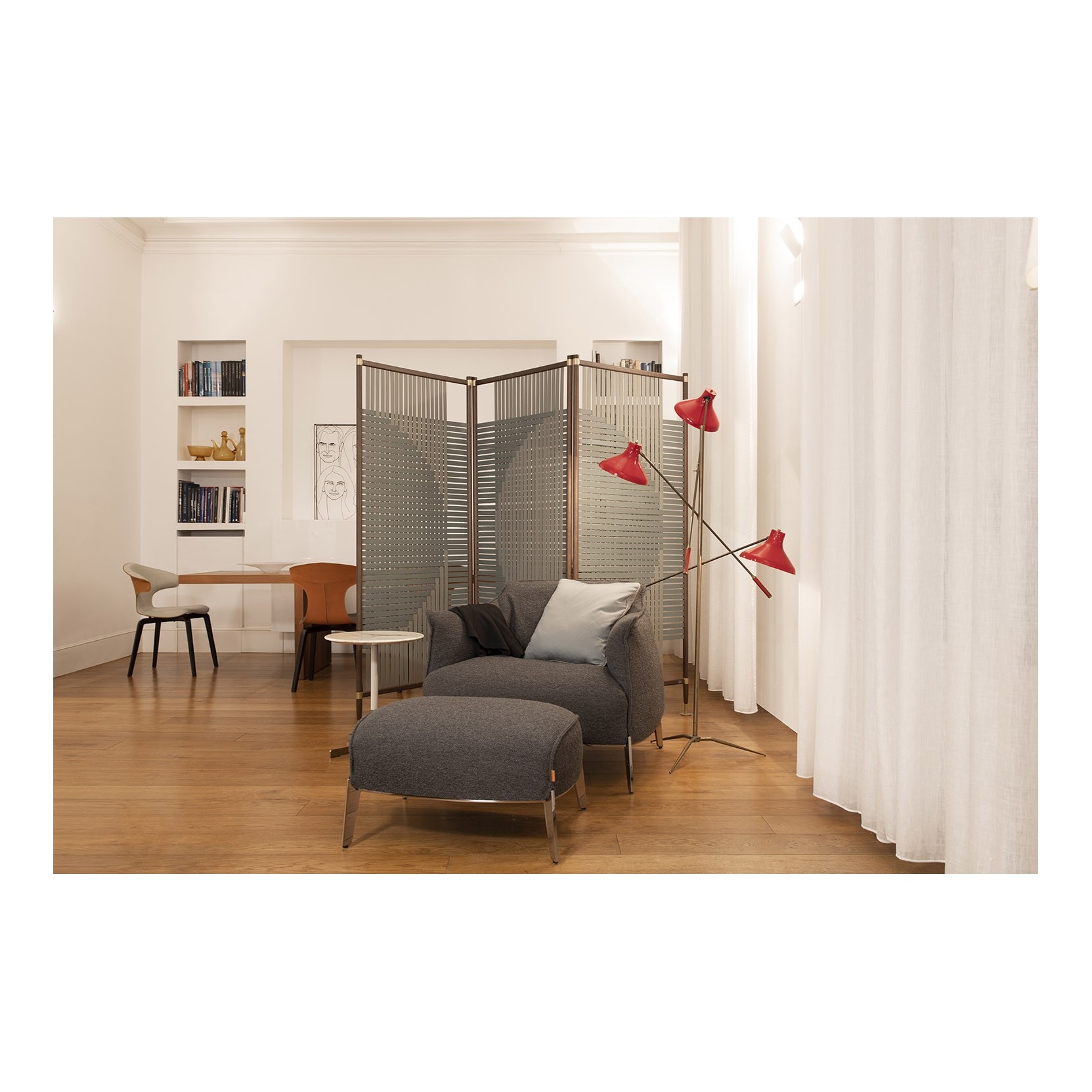 The Plot partition is available in different configurations, including 2, 3, and 4-module models. The design stands out for the geometric pattern chosen for weaving the leather bands: in the Round version, the weaving evokes the shape of a circle, while in the Square version, the pattern is inspired by the diamond shape. The structure is made of aluminum tubes veneered with moka-stained ash, with metal corner joints finished in matte brass. The lower part of the structure rests on metal feet with a matte brass finish, attached to conical metal tips painted in brown. The upholstery in Pelle Frau® ColorSphere® consists of woven bands attached to the metal tubes, available in predefined color combinations: the first color identifies the vertical band, while the second one identifies the horizontal band. Color combinations include, for example, Topo/Seppia, Noisette/Maquillage, and Iris/Carrubo.