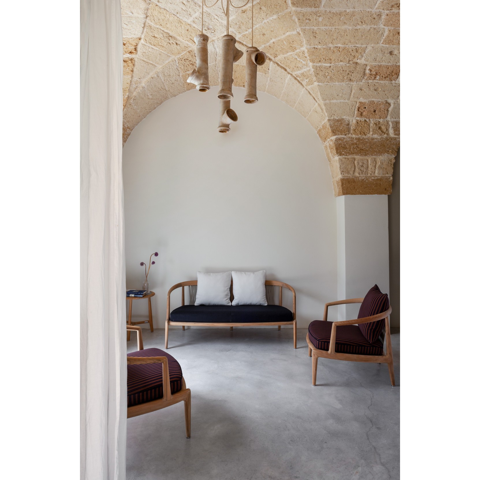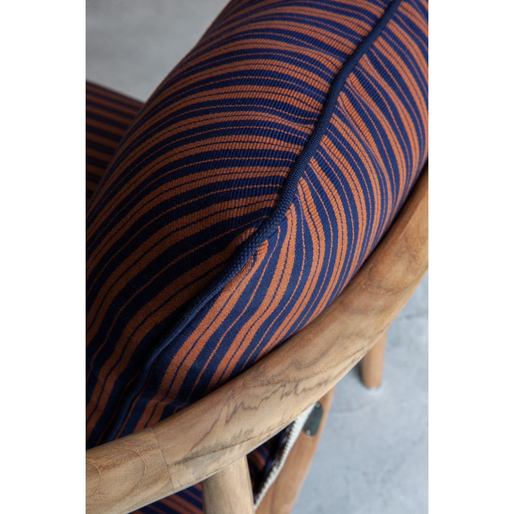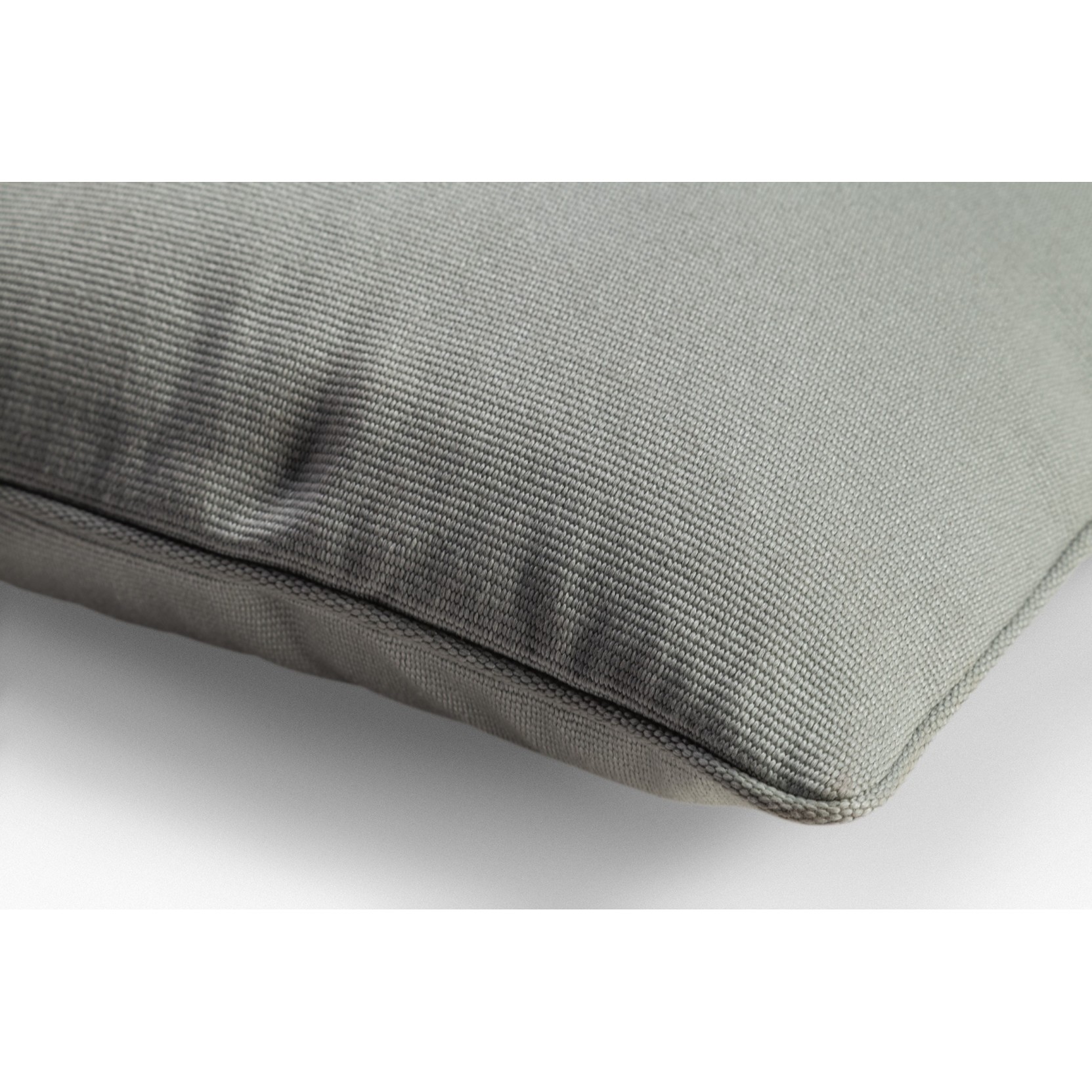 The cushions are available in three sizes: 47x47 cm, 54x47 cm, and lumbar cushion. The internal composition is made of polyester fiber filling, simulating down, with a water-repellent polyester cover. The upholstery options include Pelle Frau® Outdoor, Outdoor Fabric A, Outdoor Fabric B, and C.O.M. The profile of the cushions is finished with a perimeter piping that complements the chosen upholstery fabric. The cushions are removable, and to check the available fabrics, please refer to the "Product-Fabric Matching Chart".