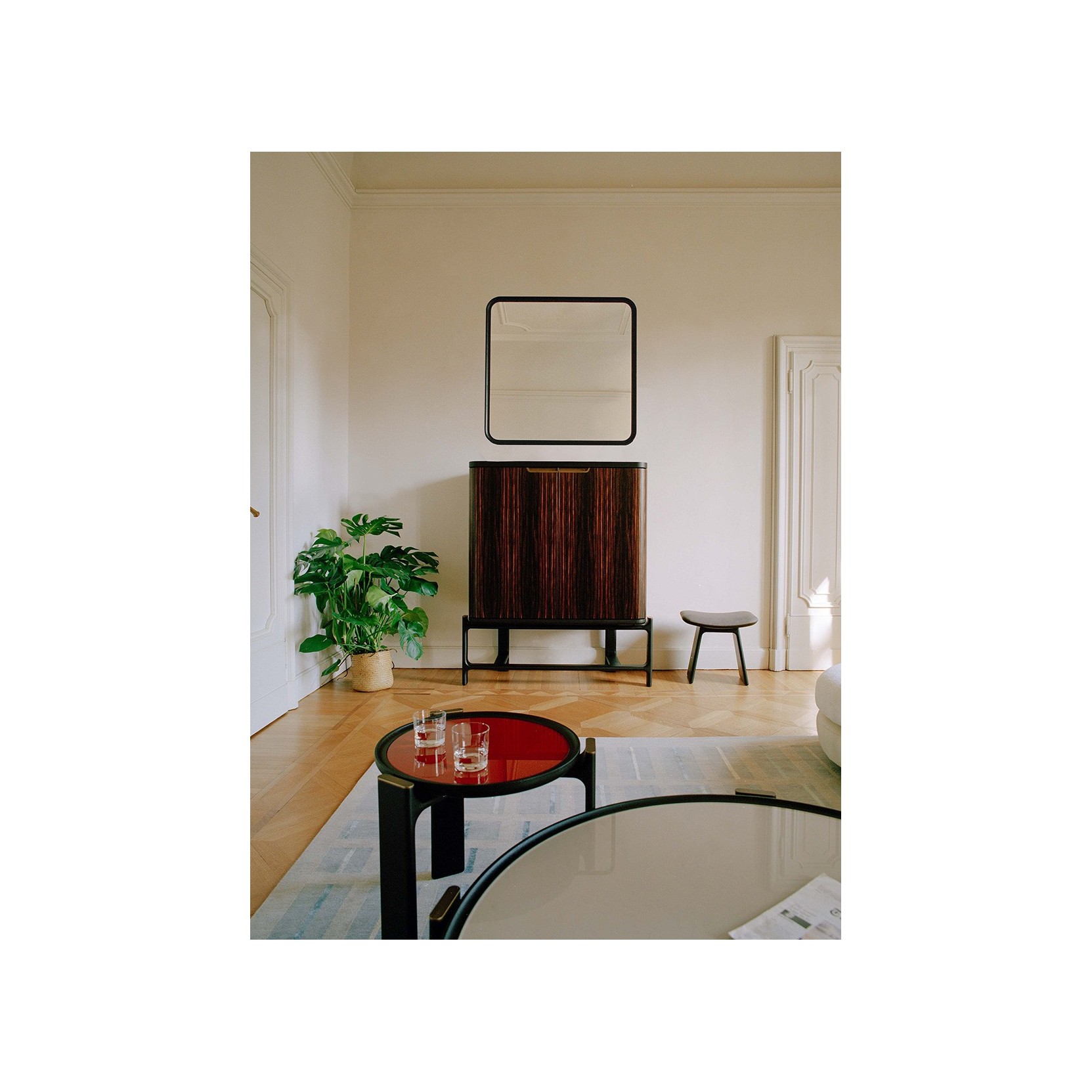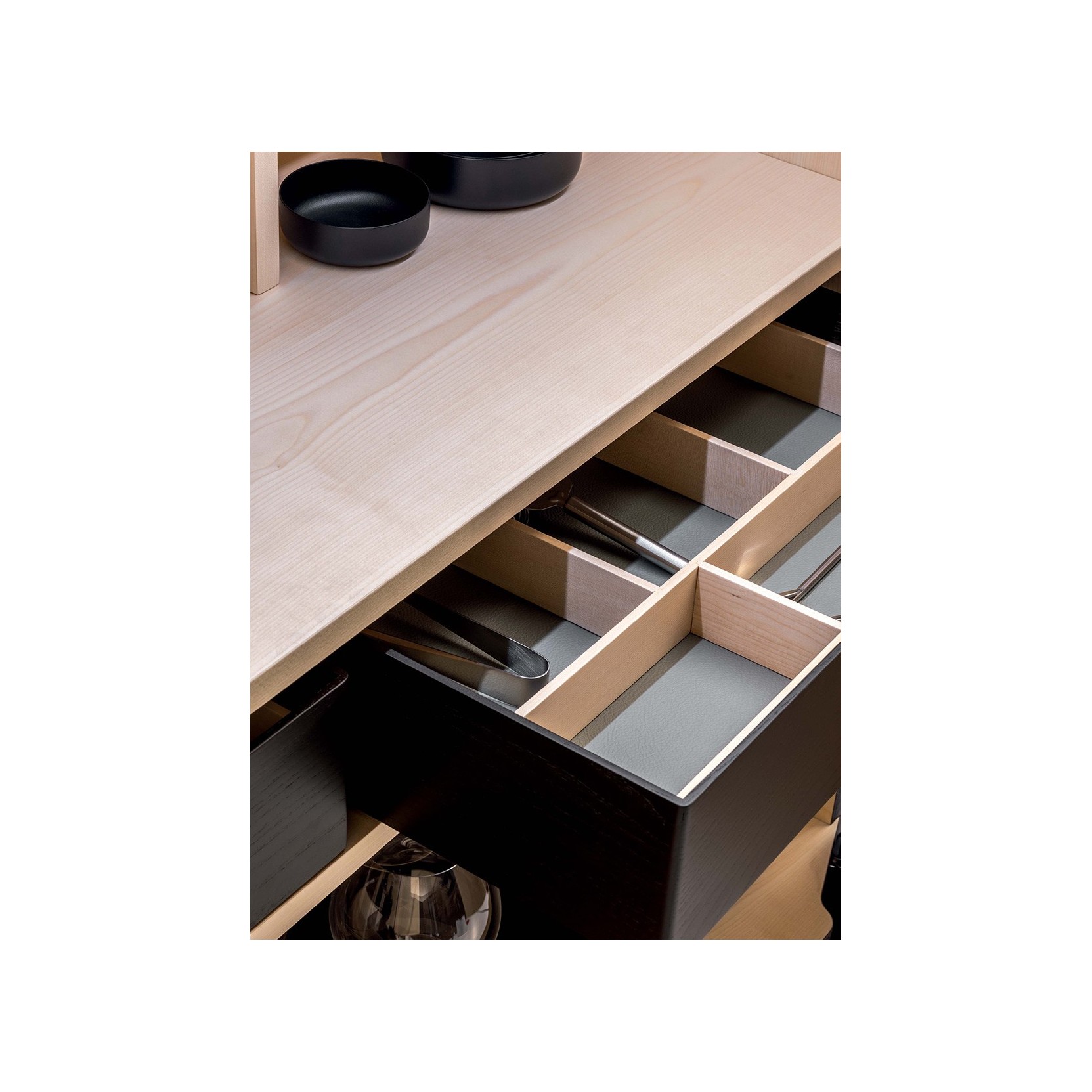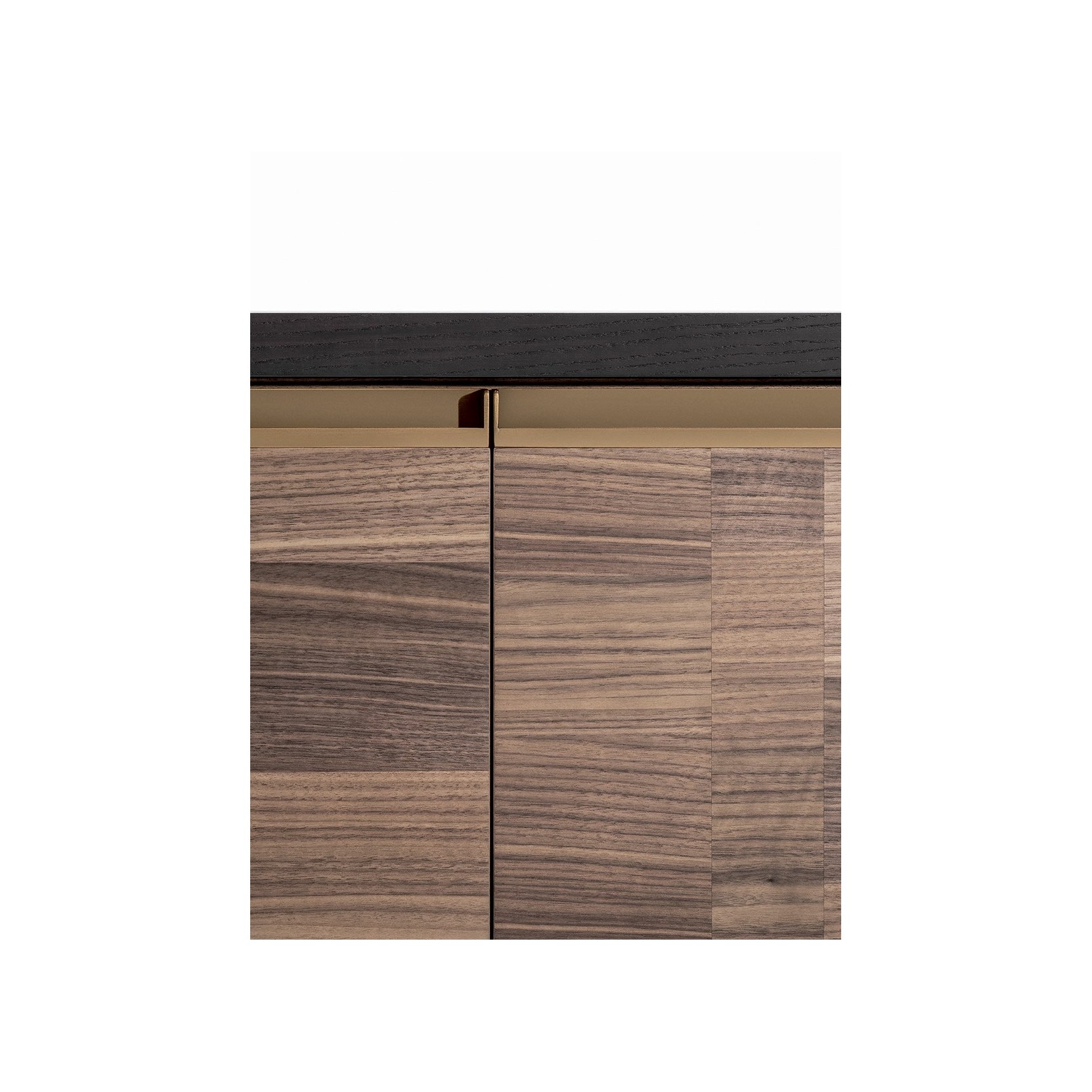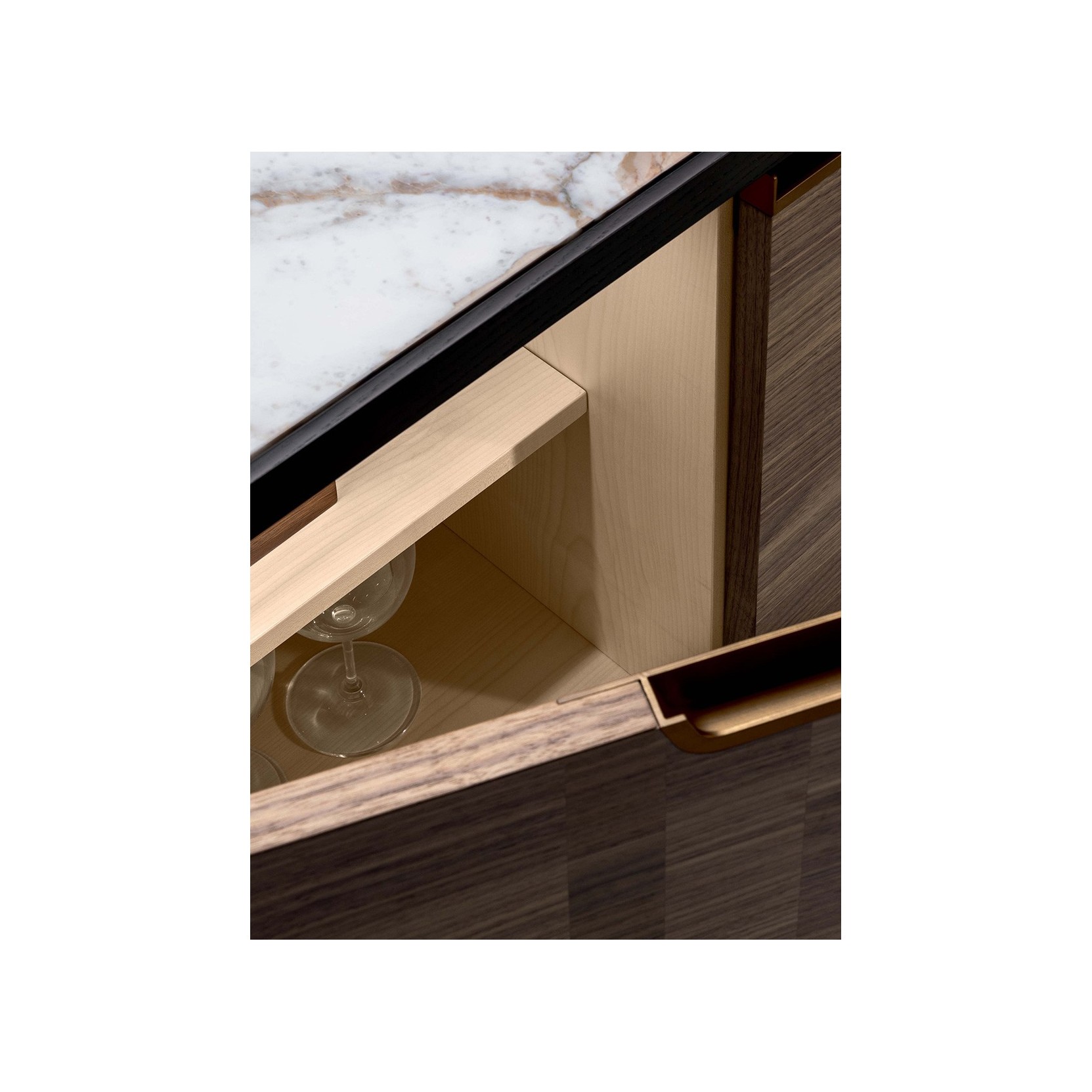 A piece that blends elegance and functionality, reinterpreting the concept of a sideboard with a modern and refined approach. The cabinet exterior is made of veneered poplar plywood panels, while the supporting structure is crafted from solid ash wood, with finishes available in wenge or moka stains. The top can be customized with back-painted glass or semi-gloss Calacatta marble. Inside, the cabinet offers a functional layout with the possibility to add trays, drawers, and solid wood dividers. The optional LED lighting further enhances the experience.