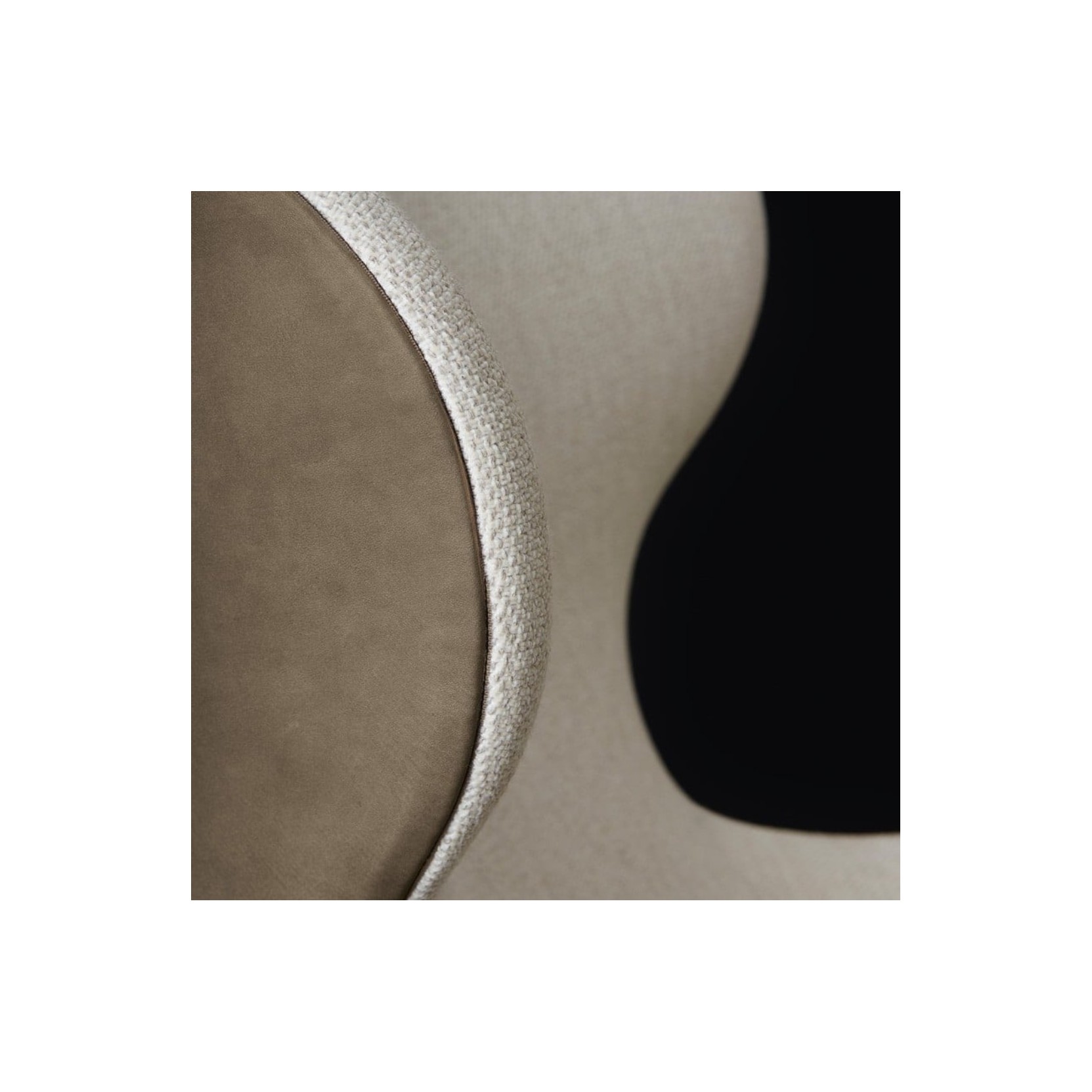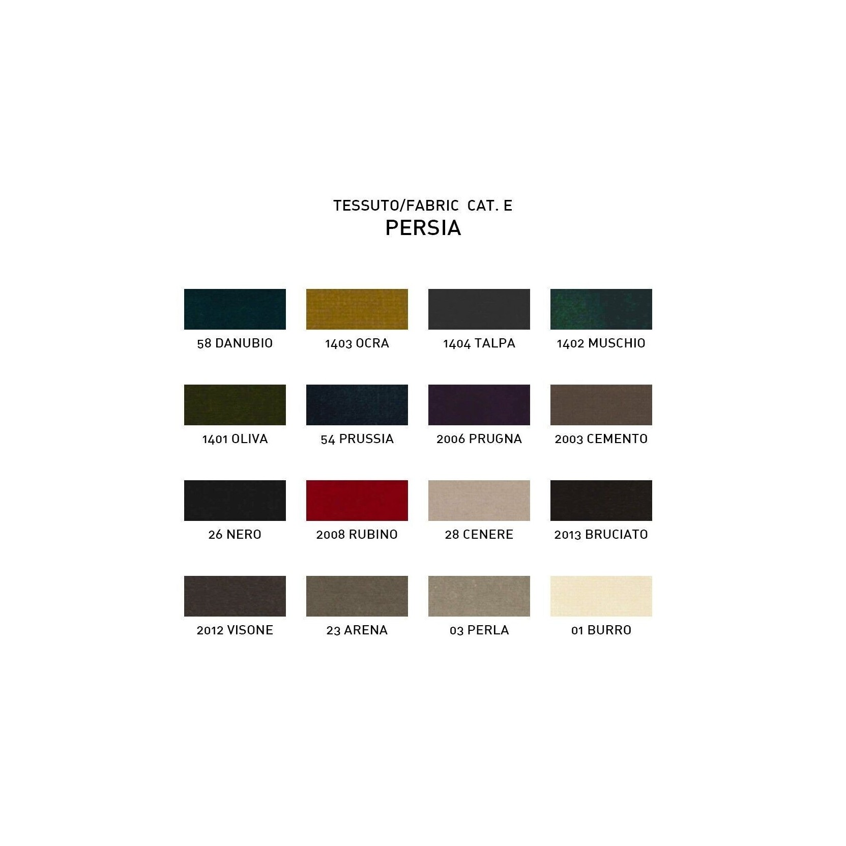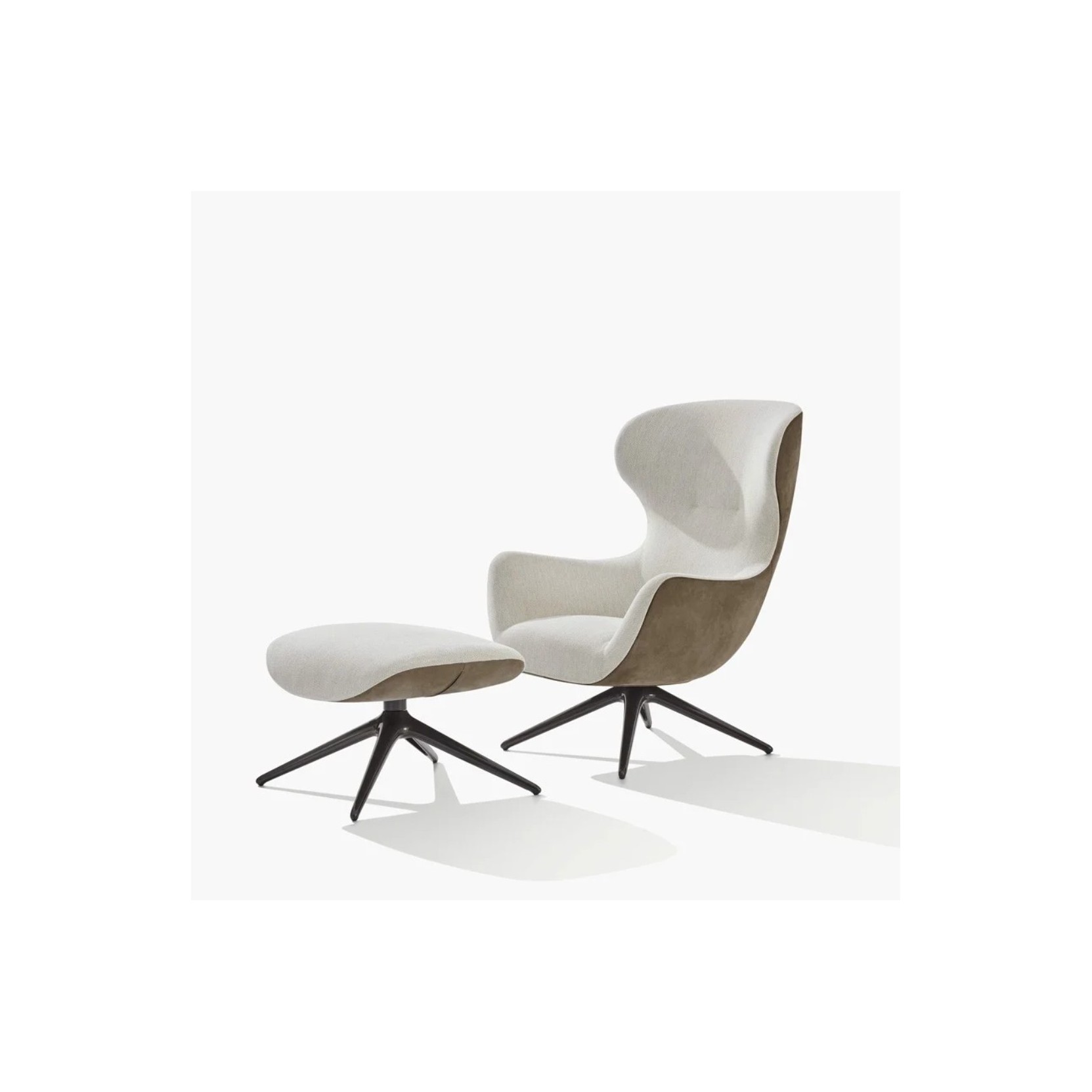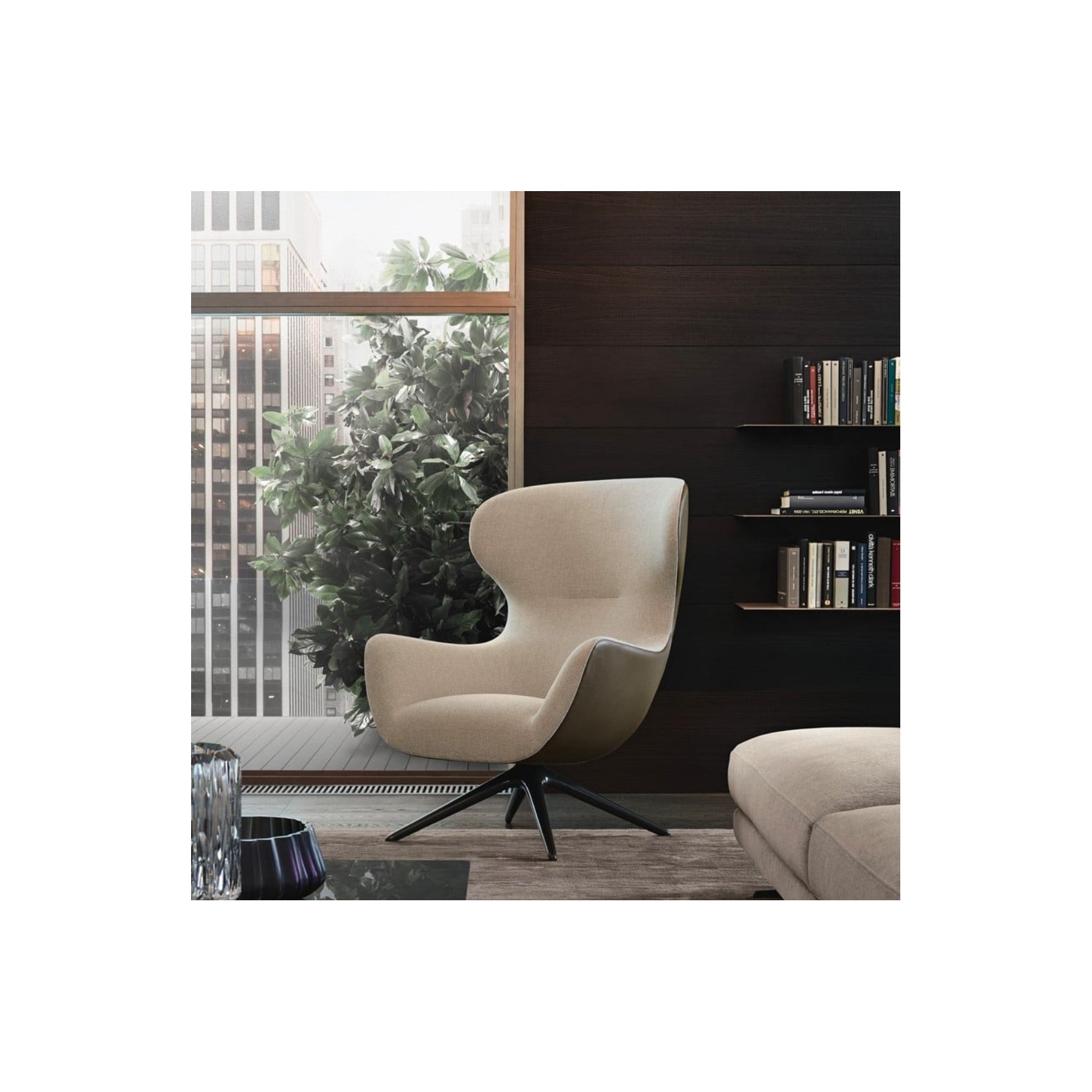 The Mad armchair features a body in flexible moulded polyurethane with pre-cover in polyester fibre and a non-removable cover available in fabric or leather. The inner and outer covers of the body can be in different materials. The legs are in spessart oak, cenere oak, or black elm, or the chair can be equipped with a swivel base with an automatic returning mechanism in painted brown nickel metal, available in both matte and glossy finishes.
