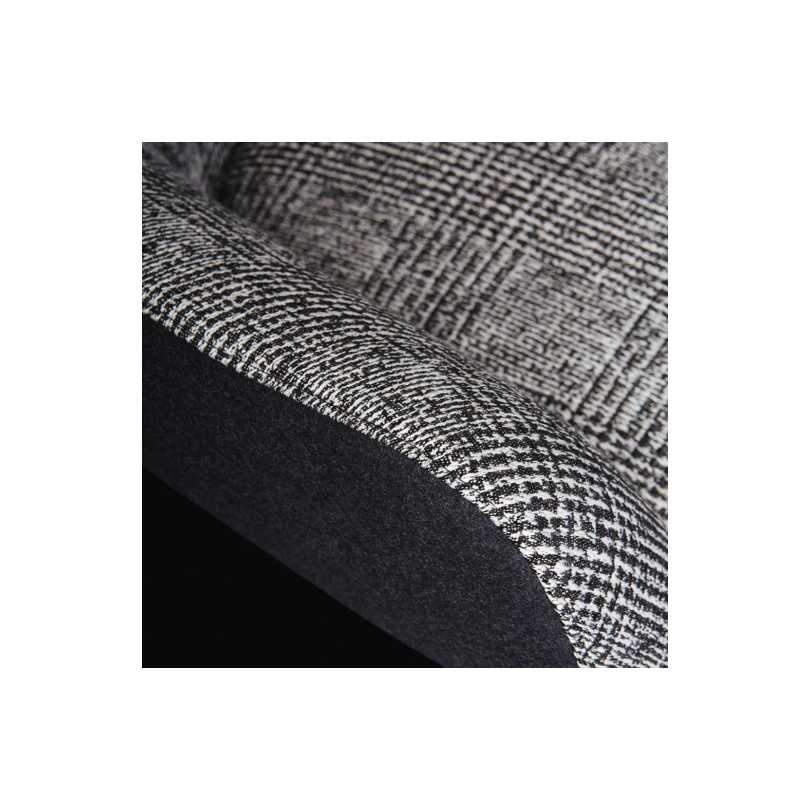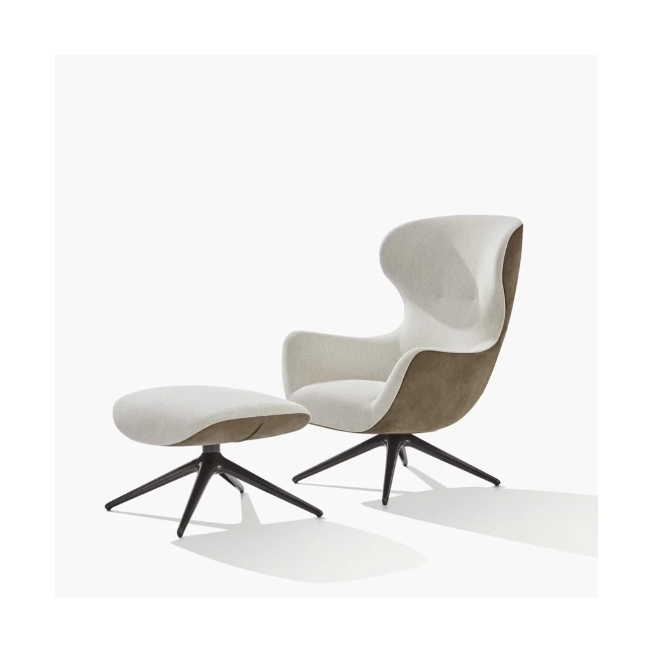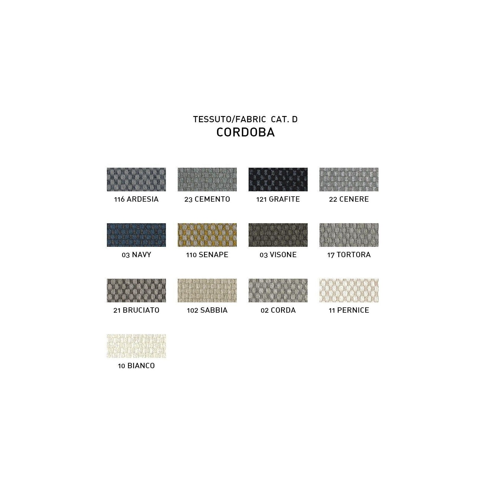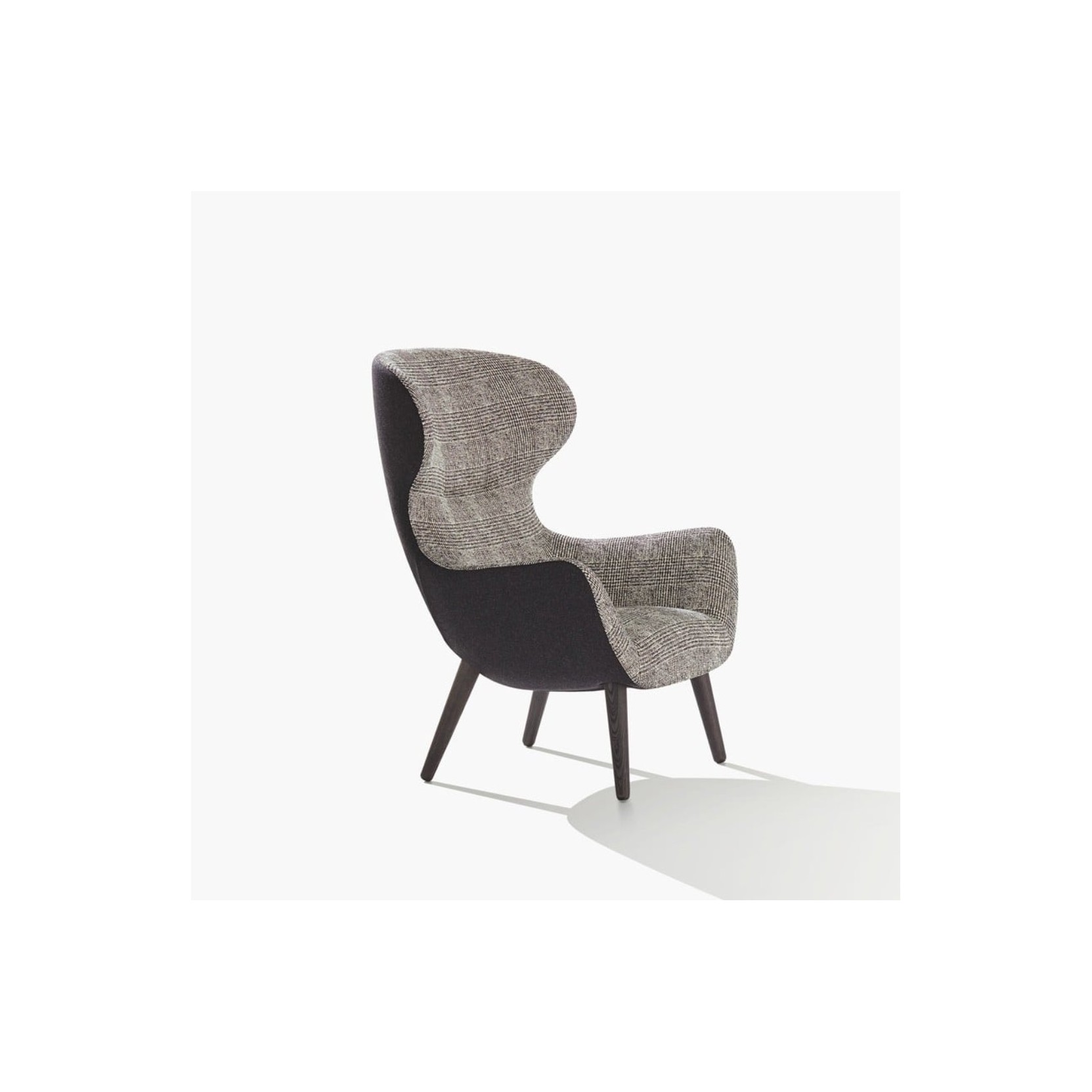 The Mad armchair features a body in flexible moulded polyurethane with pre-cover in polyester fibre and a non-removable cover available in fabric or leather. The inner and outer covers of the body can be in different materials. The legs are in spessart oak, cenere oak, or black elm, or the chair can be equipped with a swivel base with an automatic returning mechanism in painted brown nickel metal, available in both matte and glossy finishes.