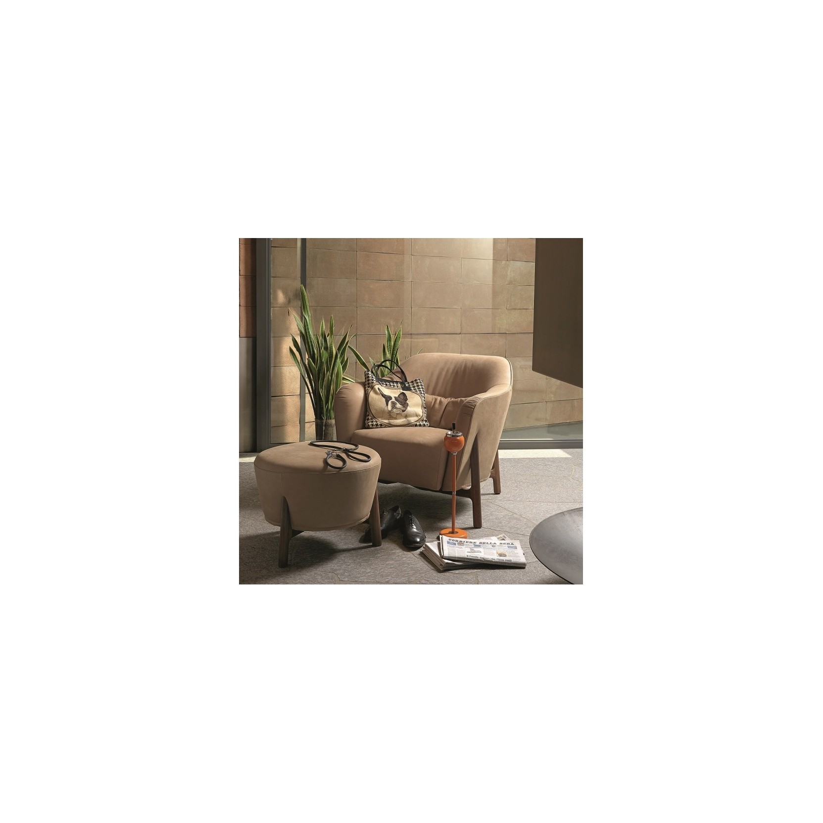 Inclined like the supports of a construction, the solid wooden legs grant stability to the soft heart of this armchair, creating a dialogue between what supports and what is supported, inside and outside. Pilotis becomes the protagonist of any living area, to create a cozy corner in a large space or a special area set aside for relaxation.
