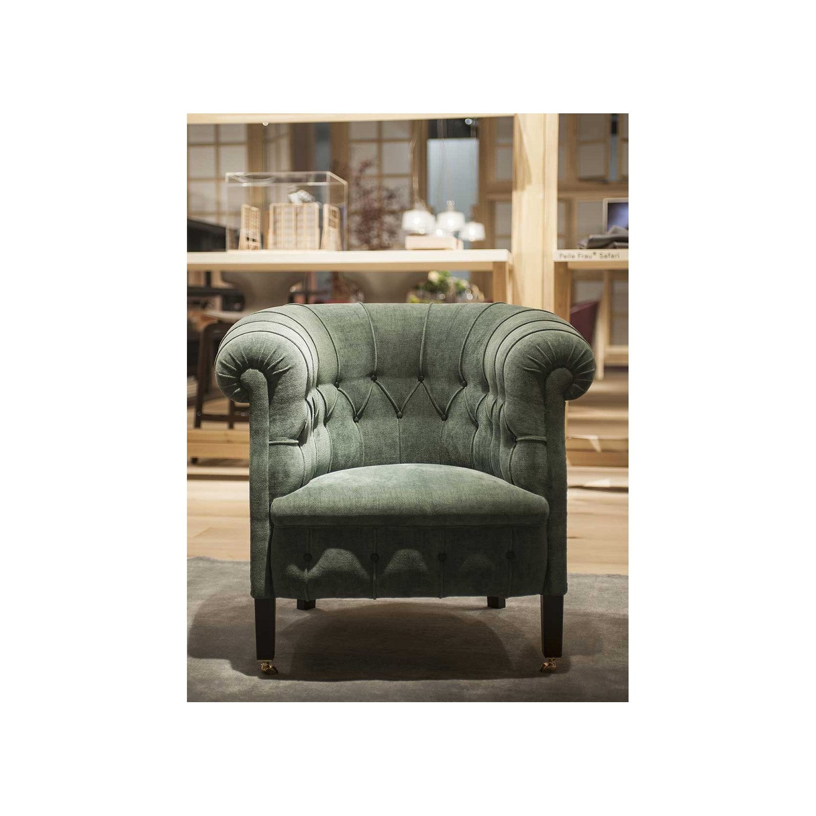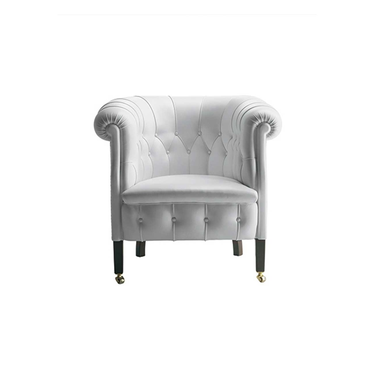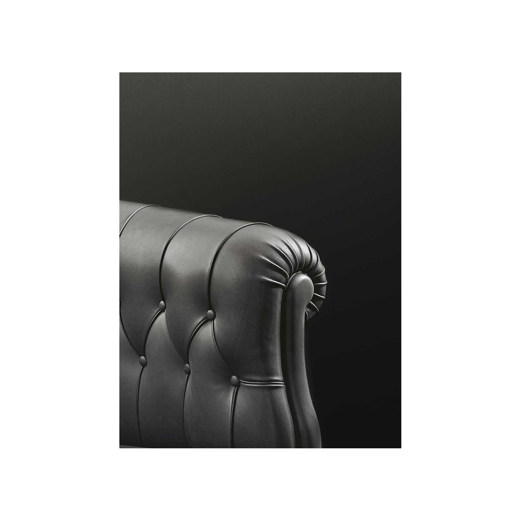The supporting structure is made of seasoned beech wood, with biconical steel springs hand-tied to jute belts and padding in rubberized horsehair. The dark walnut-stained beech wood feet feature brass wheels on the front feet. Upholstery is available in Pelle Frau® leather or various high-quality fabrics, including ColorSphere®, Heritage, and Soul. Aesthetic details such as handcrafted stitching and leather-covered buttons adorn the backrest, while a row of leather-covered tacks finishes the back and sides. The collection is part of a numbered series and includes a 24 Kt galvanic dipped golden plate, underscoring its craftsmanship and tradition.