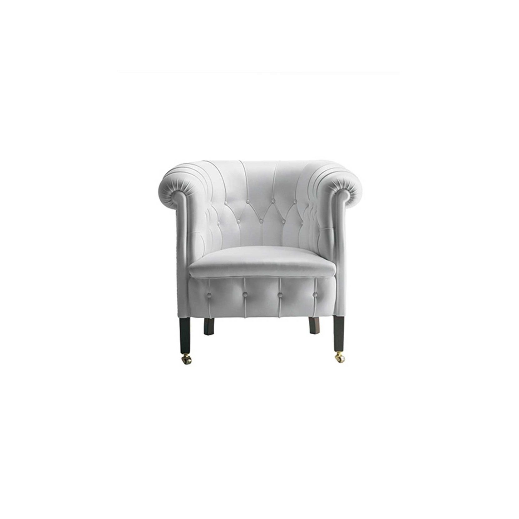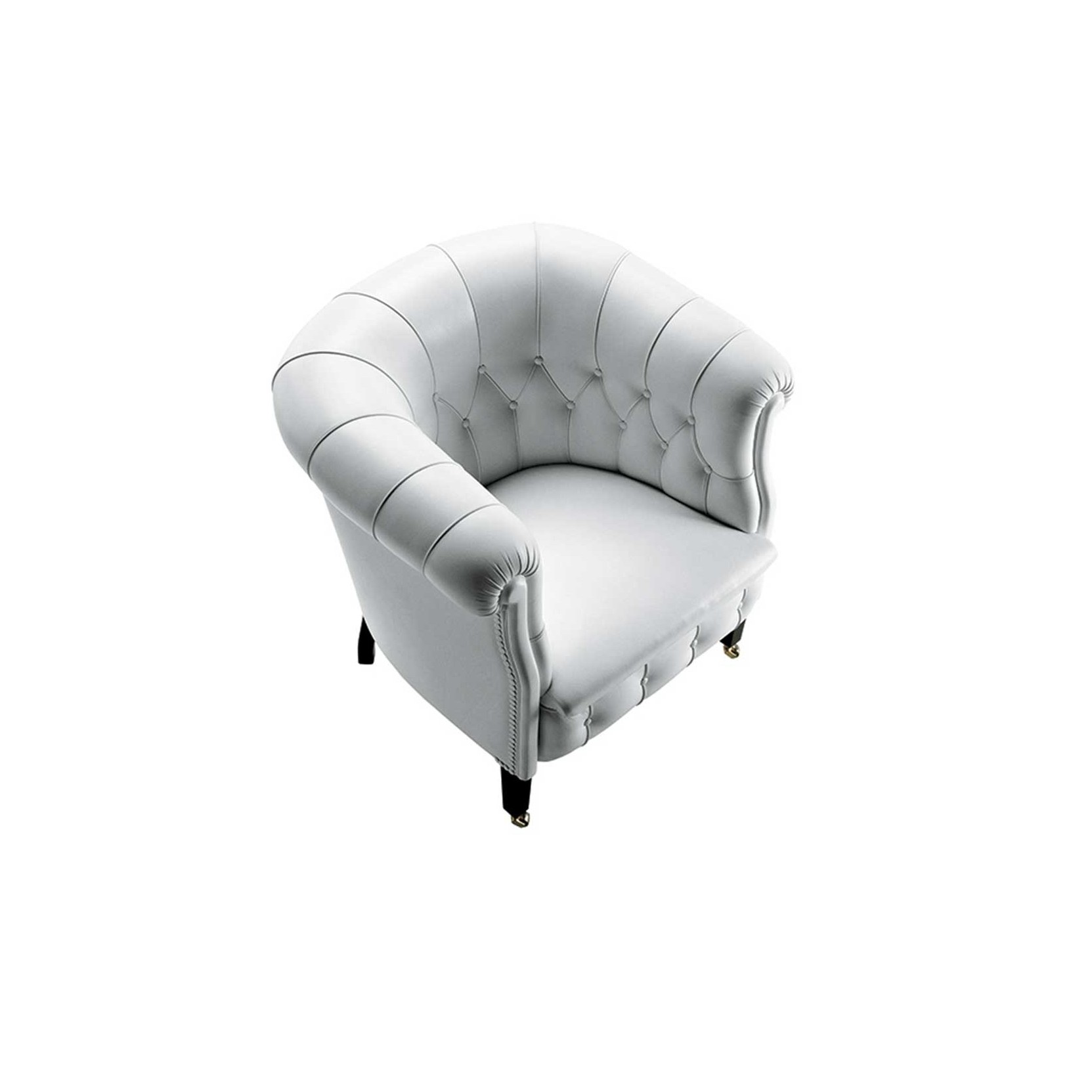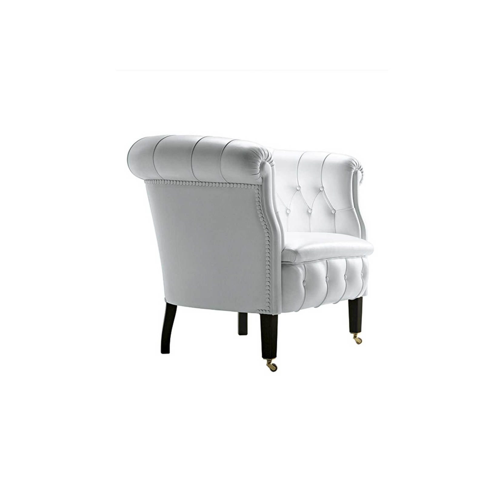 The supporting structure is made of seasoned beech wood, with biconical steel springs hand-tied to jute belts and padding in rubberized horsehair. The dark walnut-stained beech wood feet feature brass wheels on the front feet. Upholstery is available in Pelle Frau® leather or various high-quality fabrics, including ColorSphere®, Heritage, and Soul. Aesthetic details such as handcrafted stitching and leather-covered buttons adorn the backrest, while a row of leather-covered tacks finishes the back and sides. The collection is part of a numbered series and includes a 24 Kt galvanic dipped golden plate, underscoring its craftsmanship and tradition.