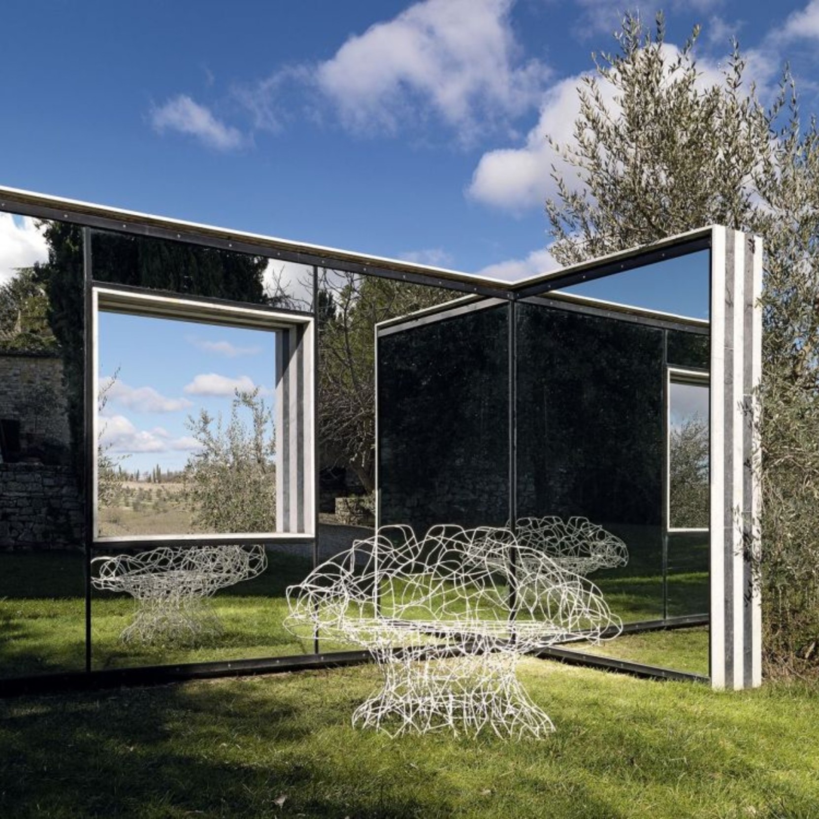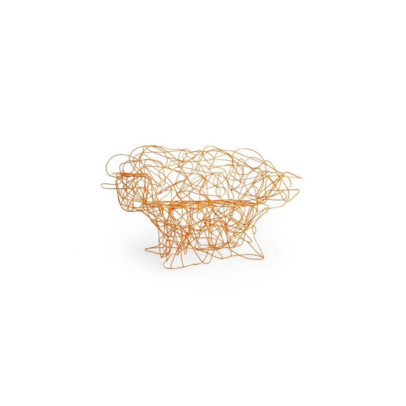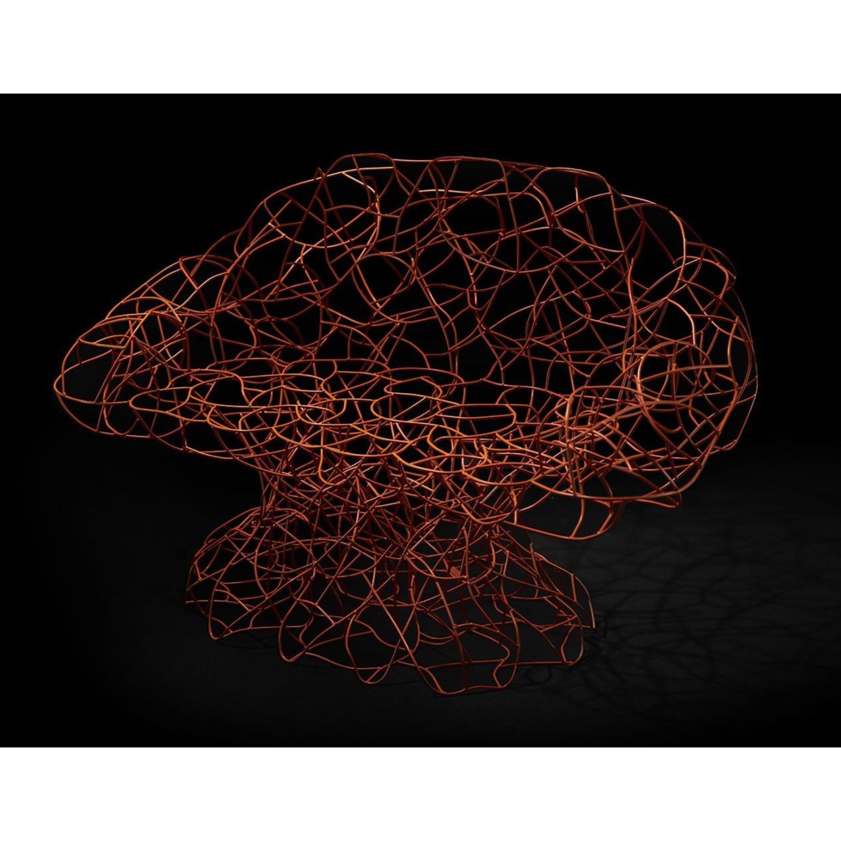 The self-supporting seat features a wide, welcoming design made from an irregular weave of hand-bent stainless steel wire. Each joint is formed by thousands of welds, all perfectly rounded and cleaned to eliminate any sharp edges and create a tactile softness. The construction of this intricate piece takes approximately one week. The finish, available in coral, white, and black, is achieved with epoxy coatings, making the seat suitable for outdoor use.