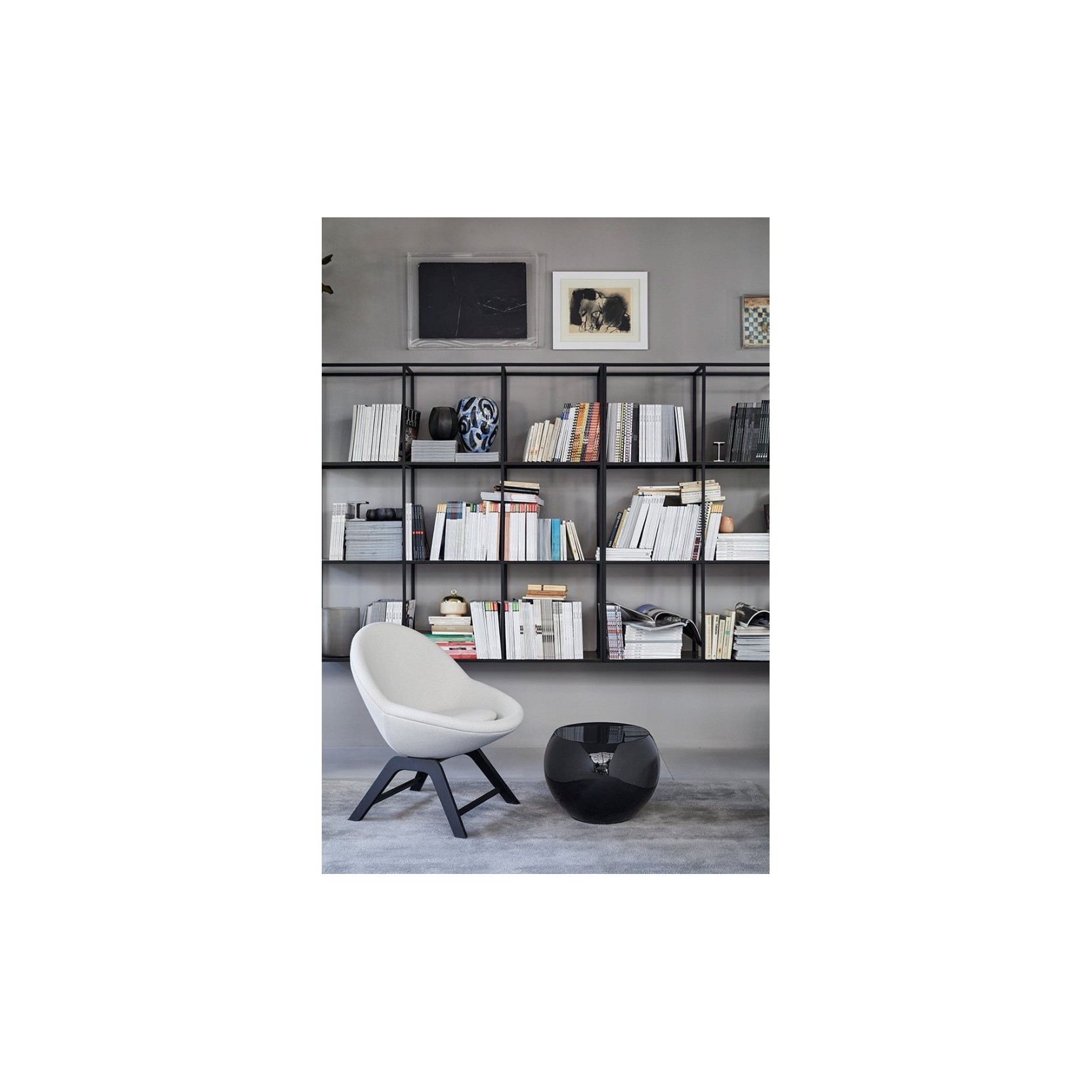- Padded small armchair with fixed cover and swivel metal base black matt varnished. - Small armchair with non-removable cover in fabric or leather and stained oak base.