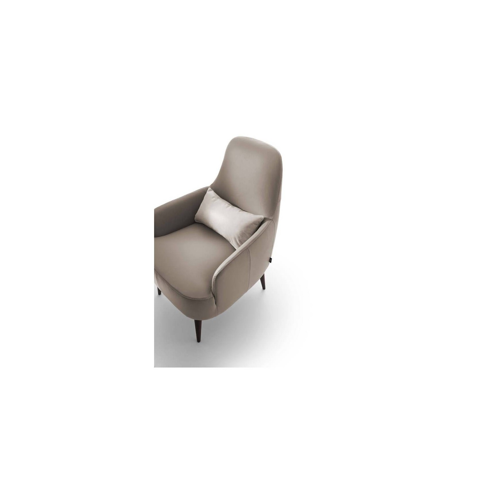 An armchair with allembracing and comfortable lines, with elegant wood feet that add sophisticated appeal, for a perfect balance of vintage and modern design.