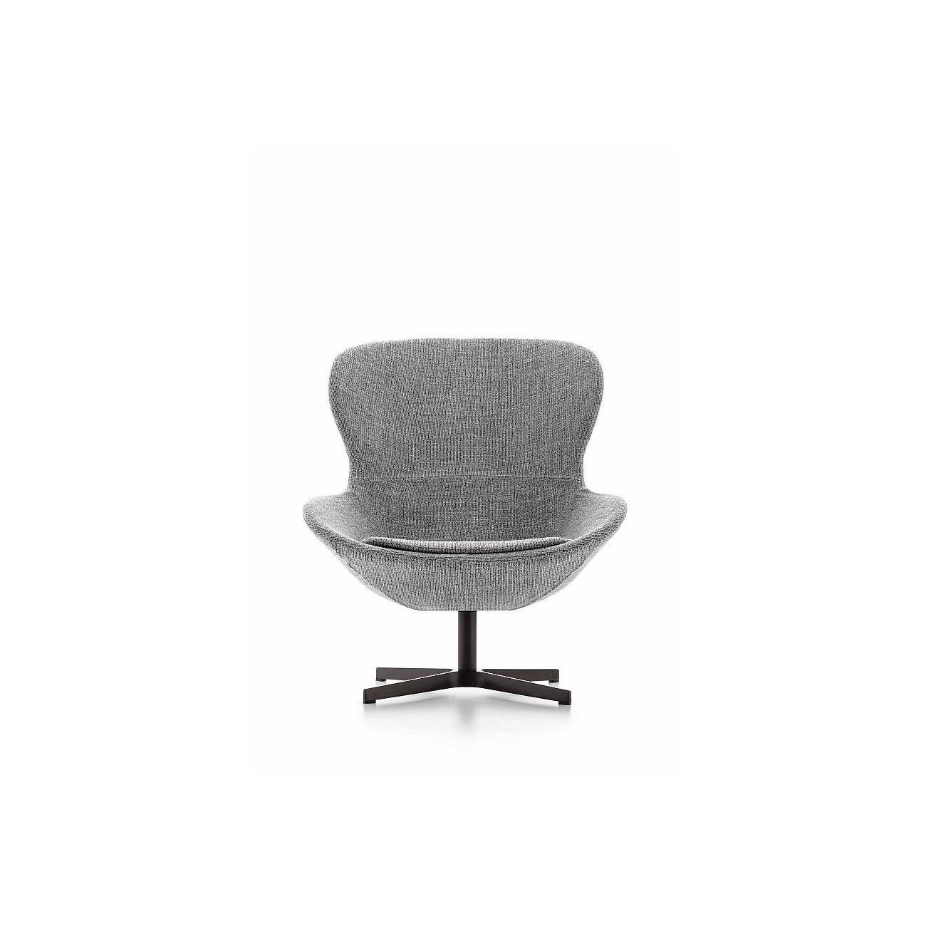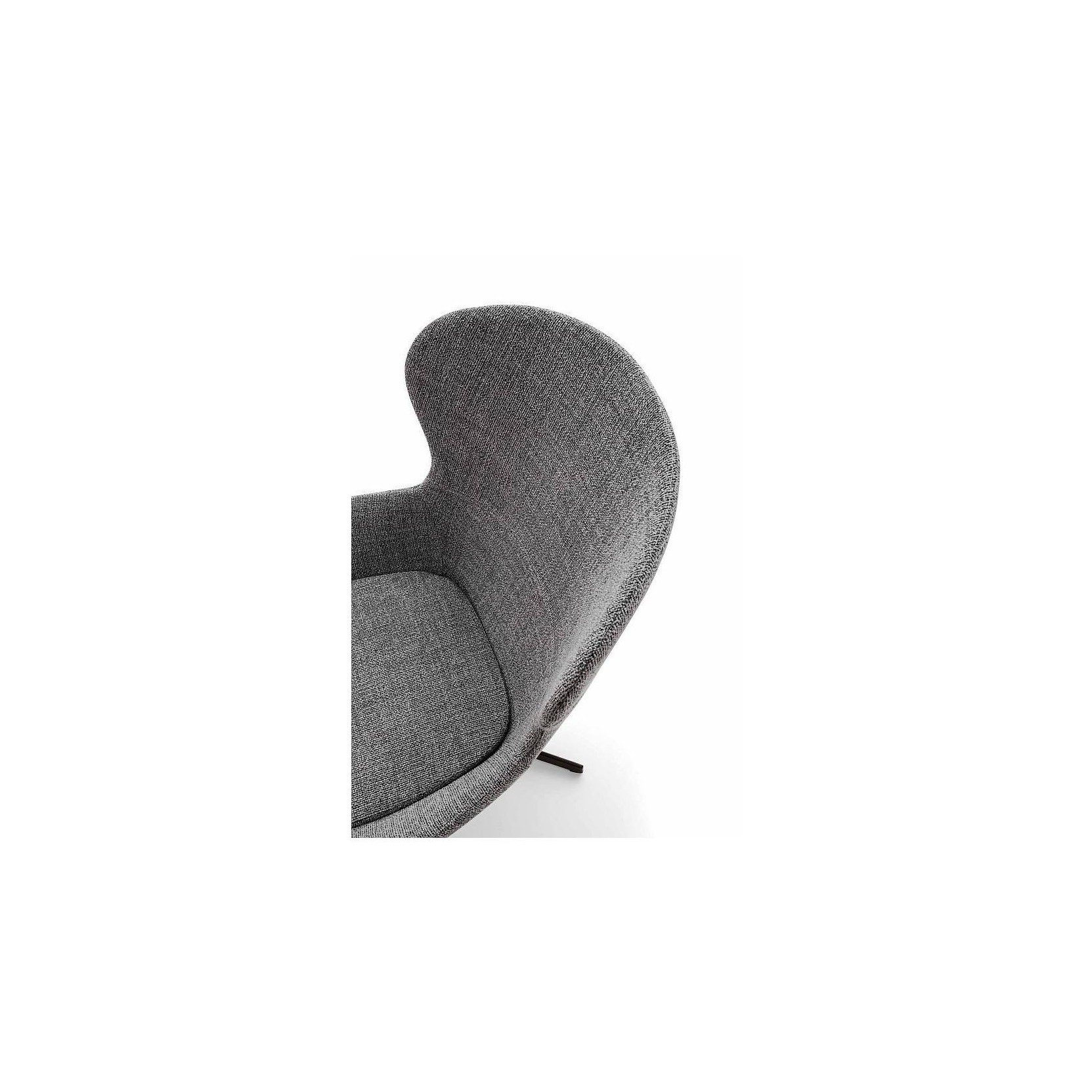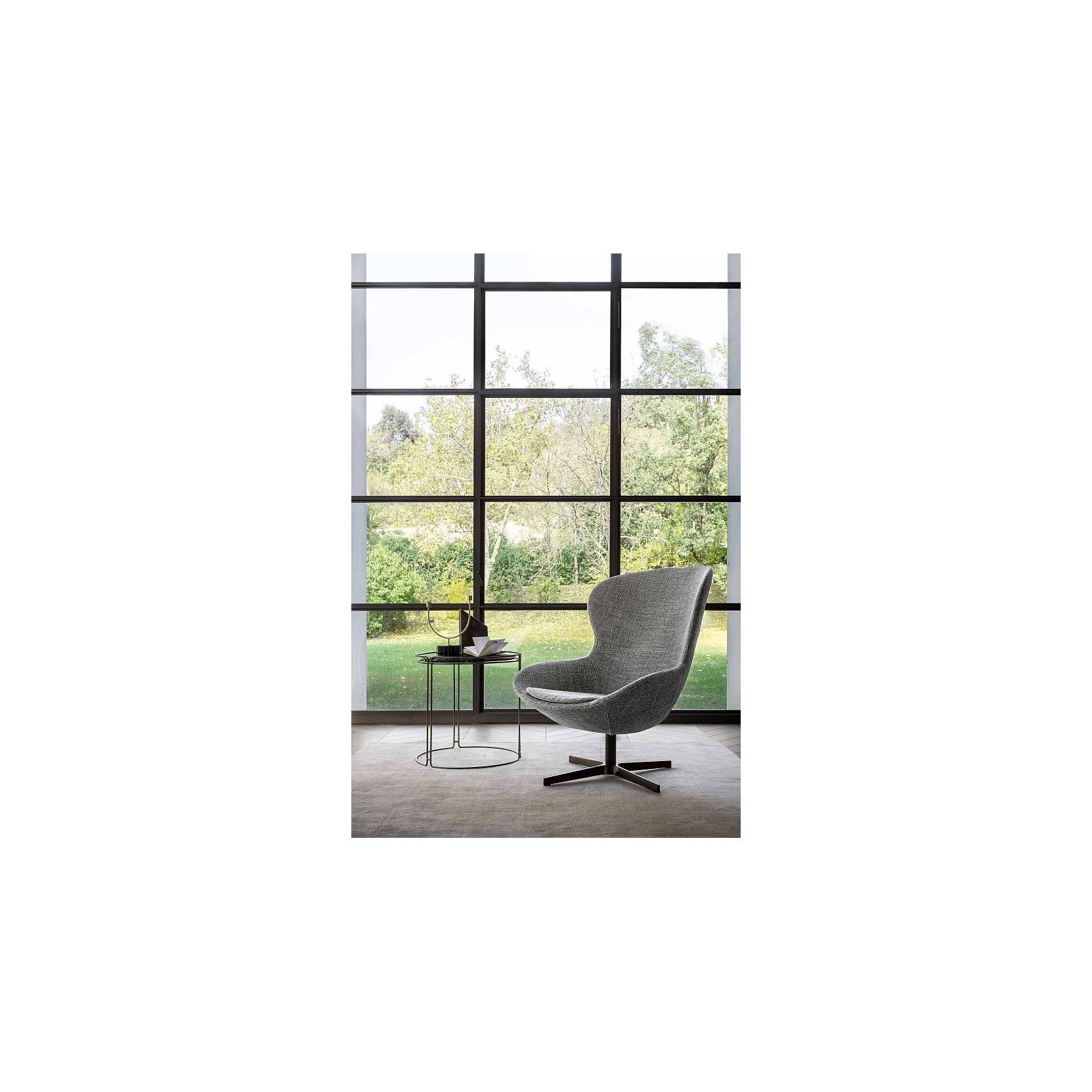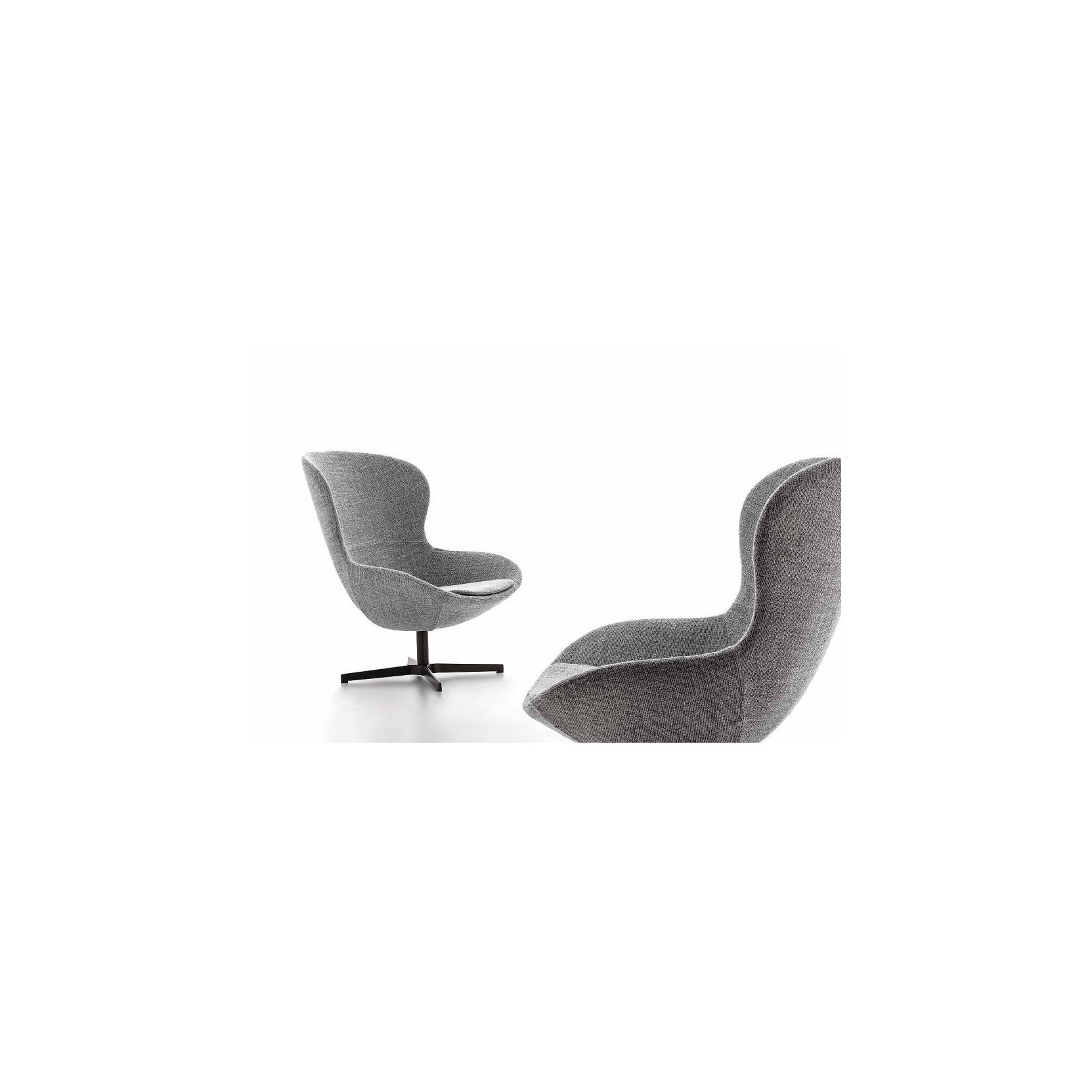 The Round chair has a wraparound shape with imposing but extremely well-balanced proportions that give it a very cosy appeal. It is available leather or fabric upholstered or in the special mixed version featuring fabric and leather together.