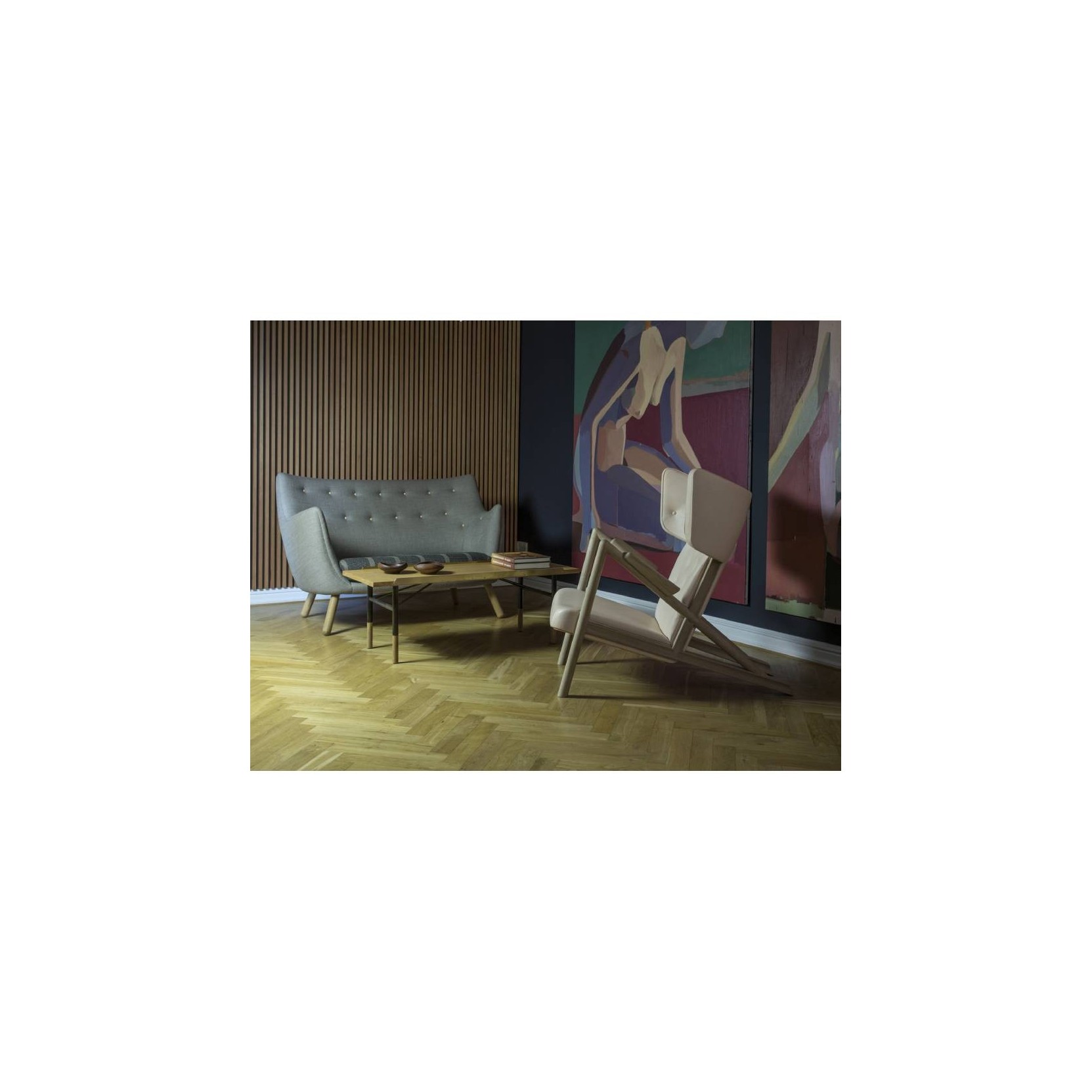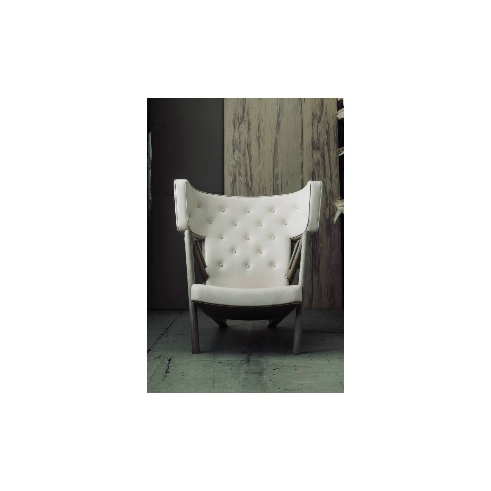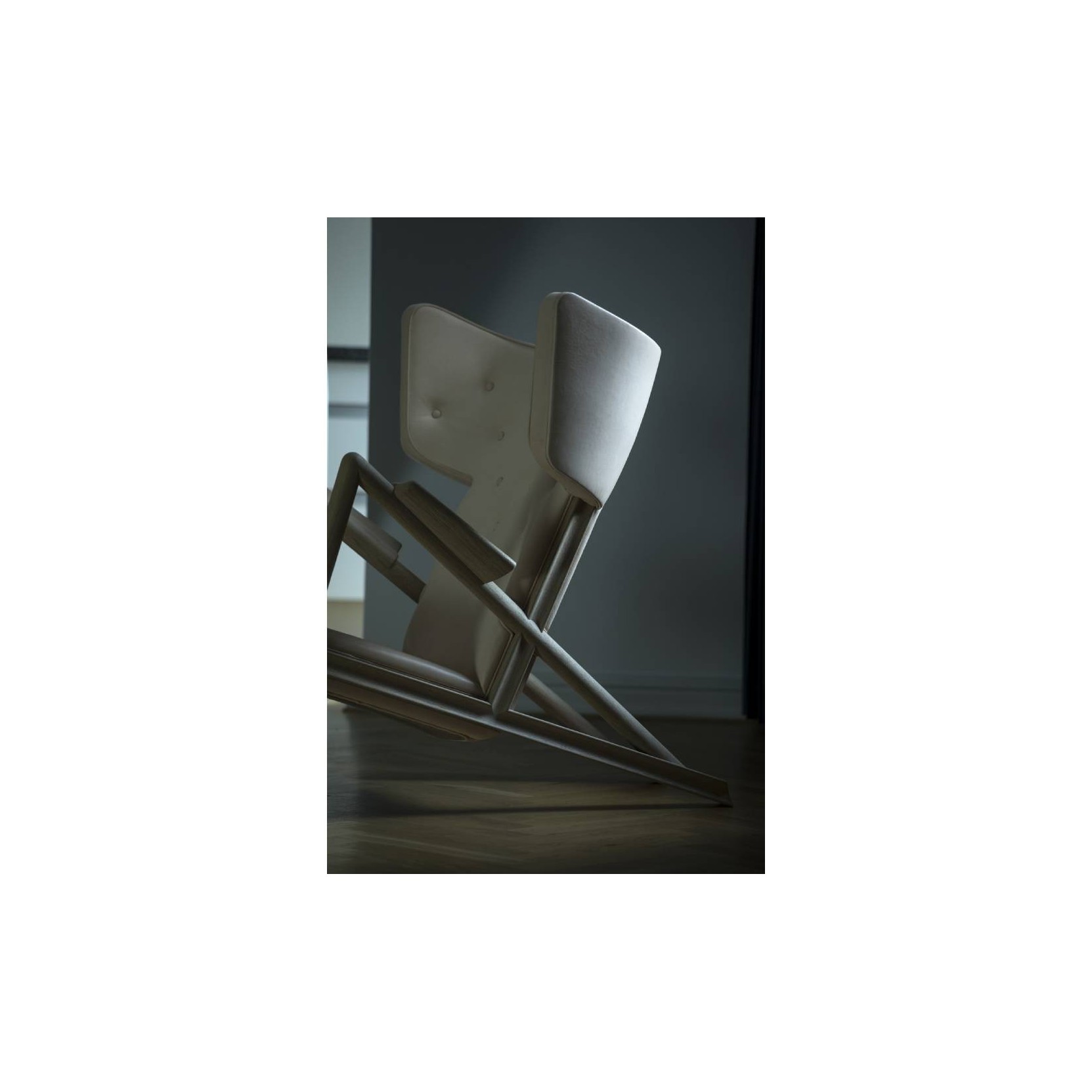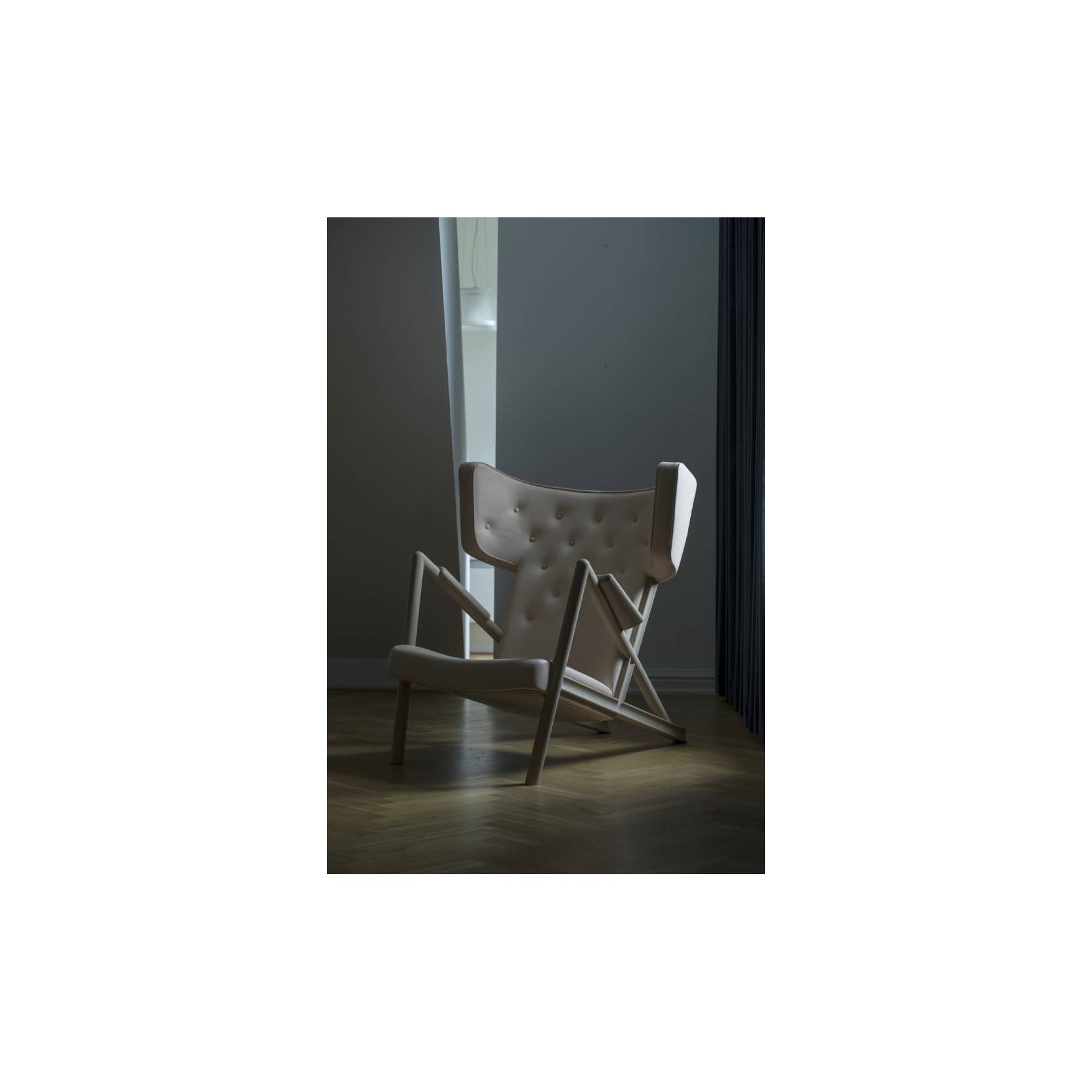 The Grasshopper was designed by Finn Juhl in 1938 and exhibited at Niels Vodder's stand at the guild exhibition. Two chairs were displayed alongside a mobile bar cabinet, with illustrations of exquisite cocktails hanging on the walls. This was quite a daring set-up and extravagant when compared to the otherwise "heavy" and traditional furniture that was presented at the time. However, people at the fair neither liked or understood the provocative exhibition. In order to help Niels Vodder avoid bigger loss, Finn Juhl bought the two chairs he had designed. The two Grasshopper Chairs from 1938 were the only ones to see the light of day. Until today.