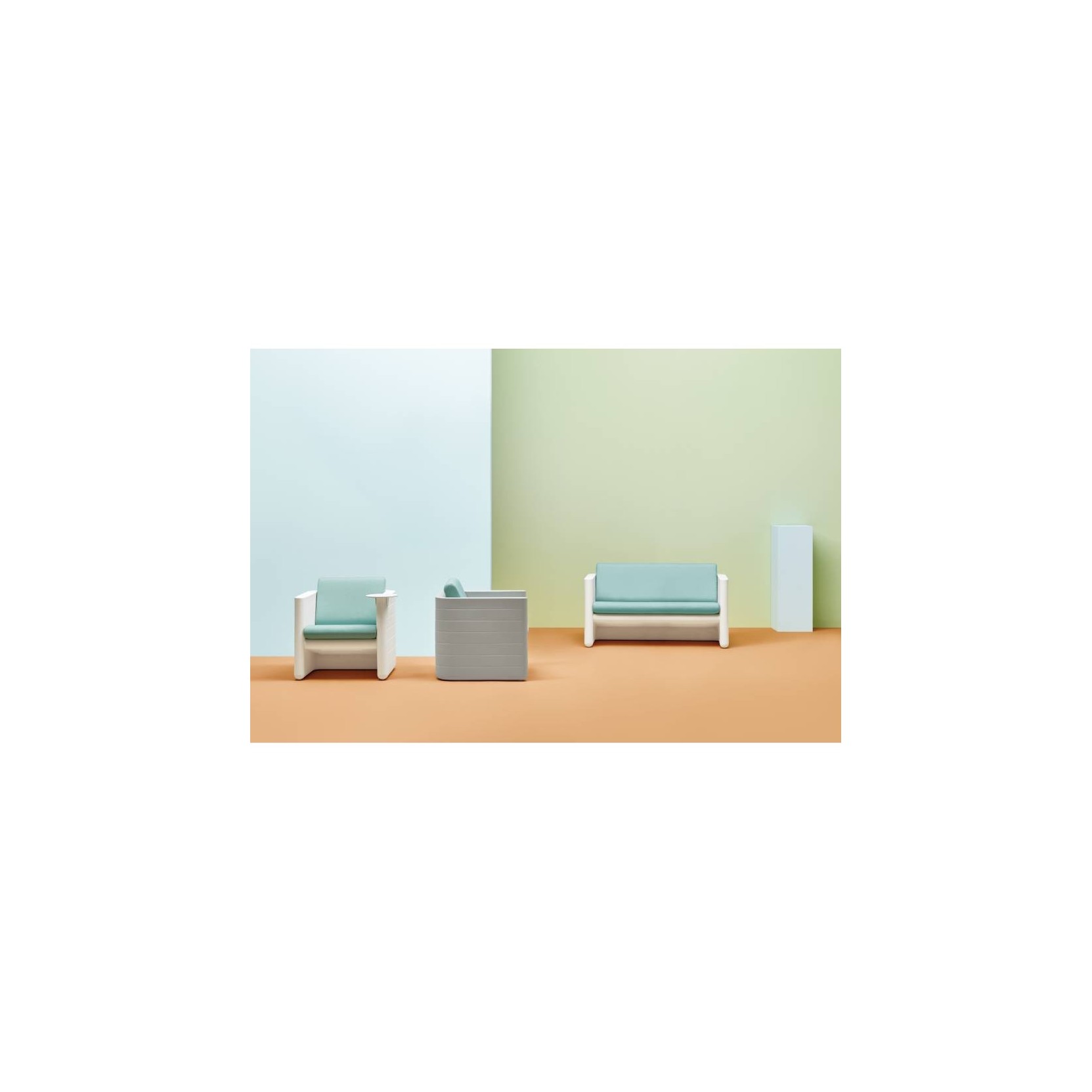 Sunset is a collection of lounge modular seating. Sunset armchair is perfect to enjoy sunny atmospheres. The squared volume in polyethylene embraces the wide seat while horizontal lines run along the outer profile. Available the cushion upholstered with water resistant fabric.