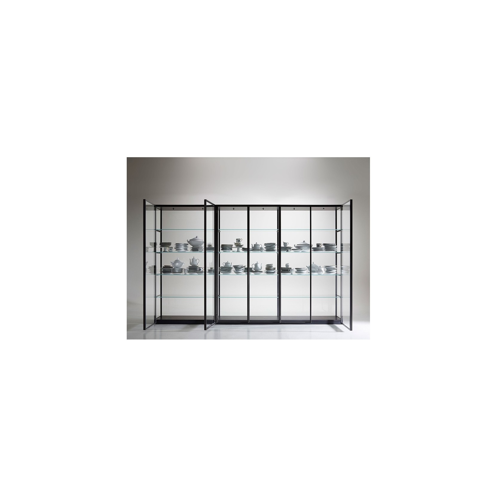 he self-standing structure consists of black painted uprights and melamine base unit and top in carbone oak. Side panels are in transparent or smoke glass while shelves are in extra-light transparent glass. Back panels are in melamine carbone oak or in transparent or smoke glass. The composition is closed with the Iron doors in transparent or smoke glass, with a metal profile painted in iron. To light up the composition it is possible to place on the top 1 or 2 spots each module.