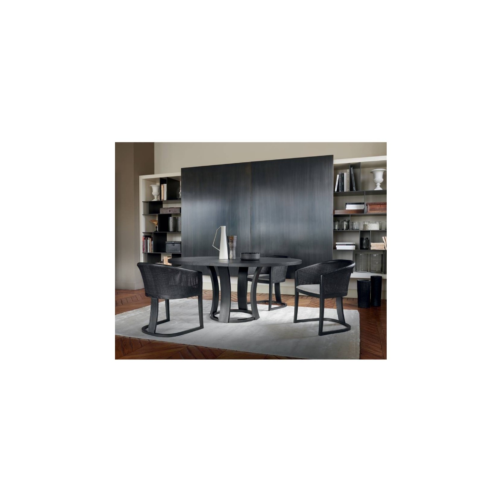 With its wraparound shape, the tub chair is distinguished by the precious weave of the cane backrest with an artisan flavor that perfectly combines with the elegant architecture of the table of the main collection. This products’ family includes chairs, armchairs, lounge chair and a sofa.