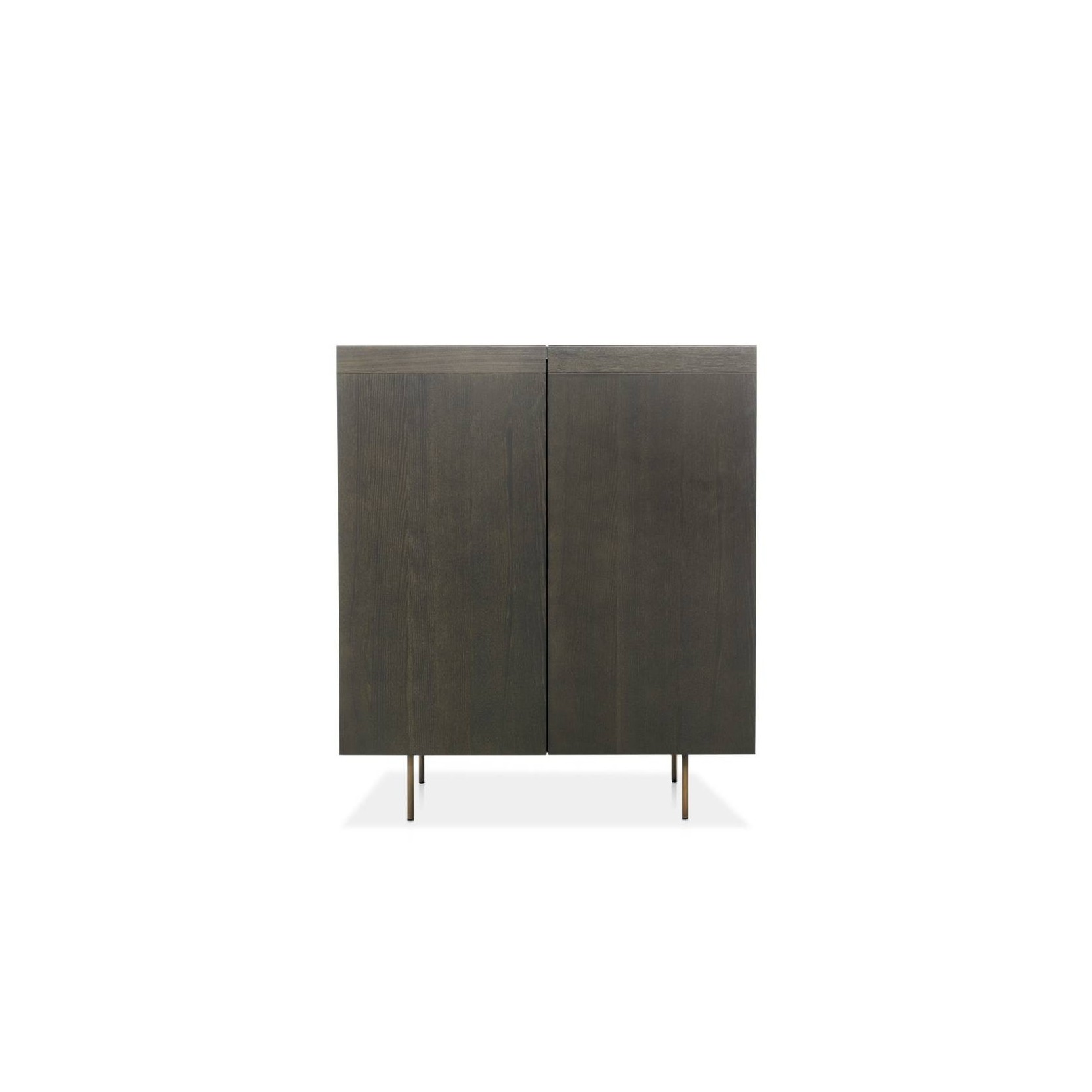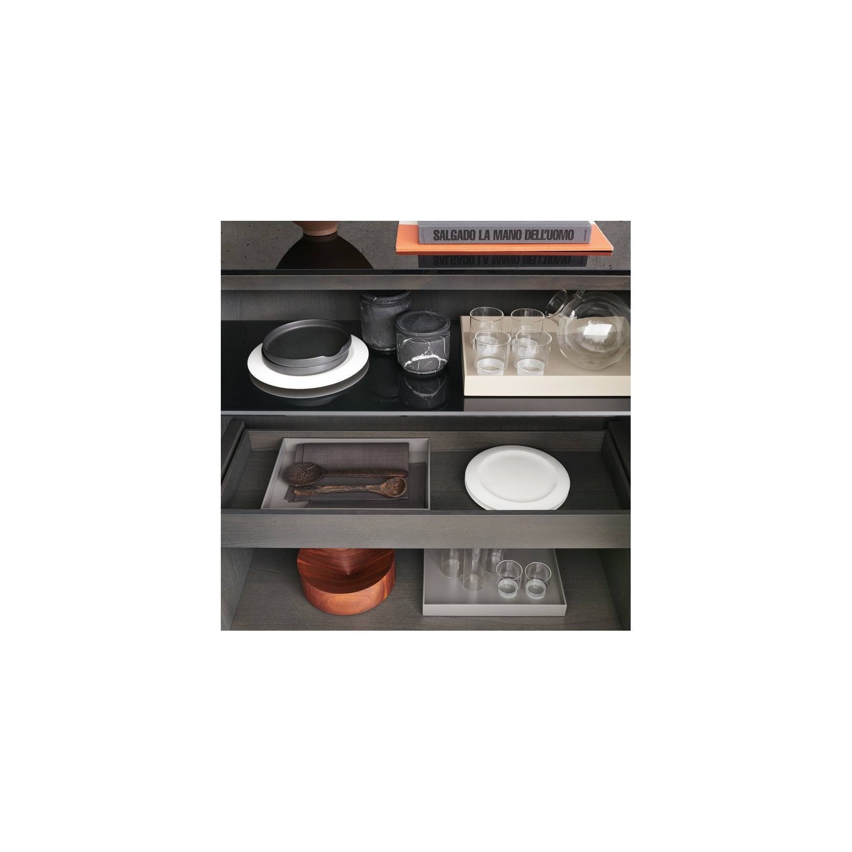 The top is available in marble or back-painted glass. Inside there are shelves in black back-painted glass and, on request, drawers. The project is completed by the detail of the burnished brass legs and the soft-closing hinges.