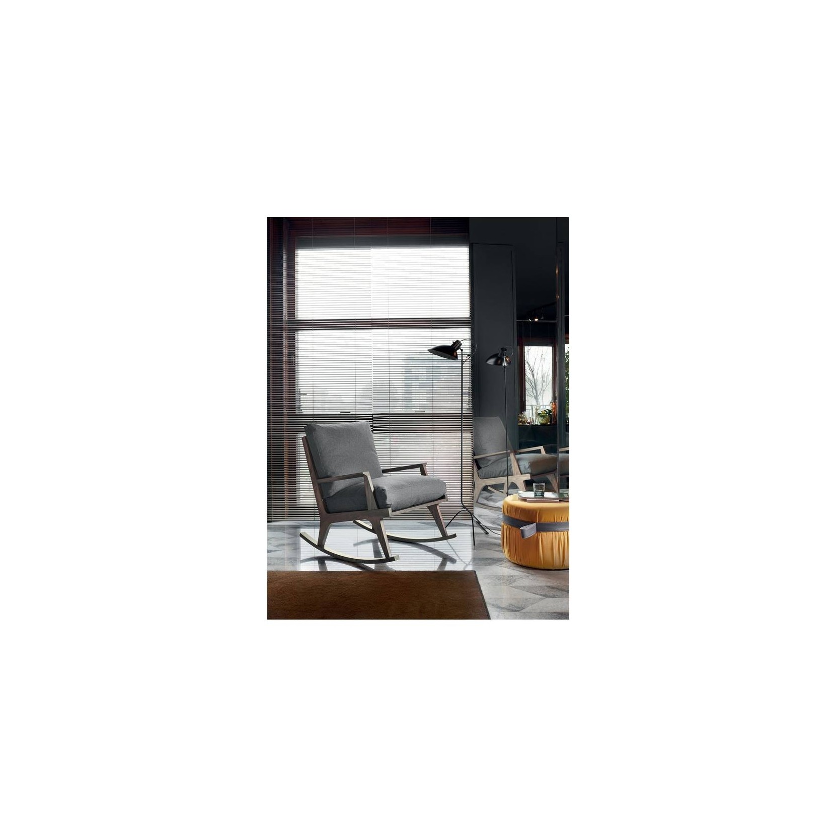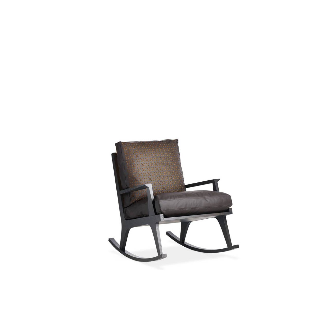 Ego is a rocking chair in solid ash, in the finishes as per collection, with large cushions upholstered in fire retardant polyurethane foam and polyester bow, removable. Two leather belts support the back cushion.