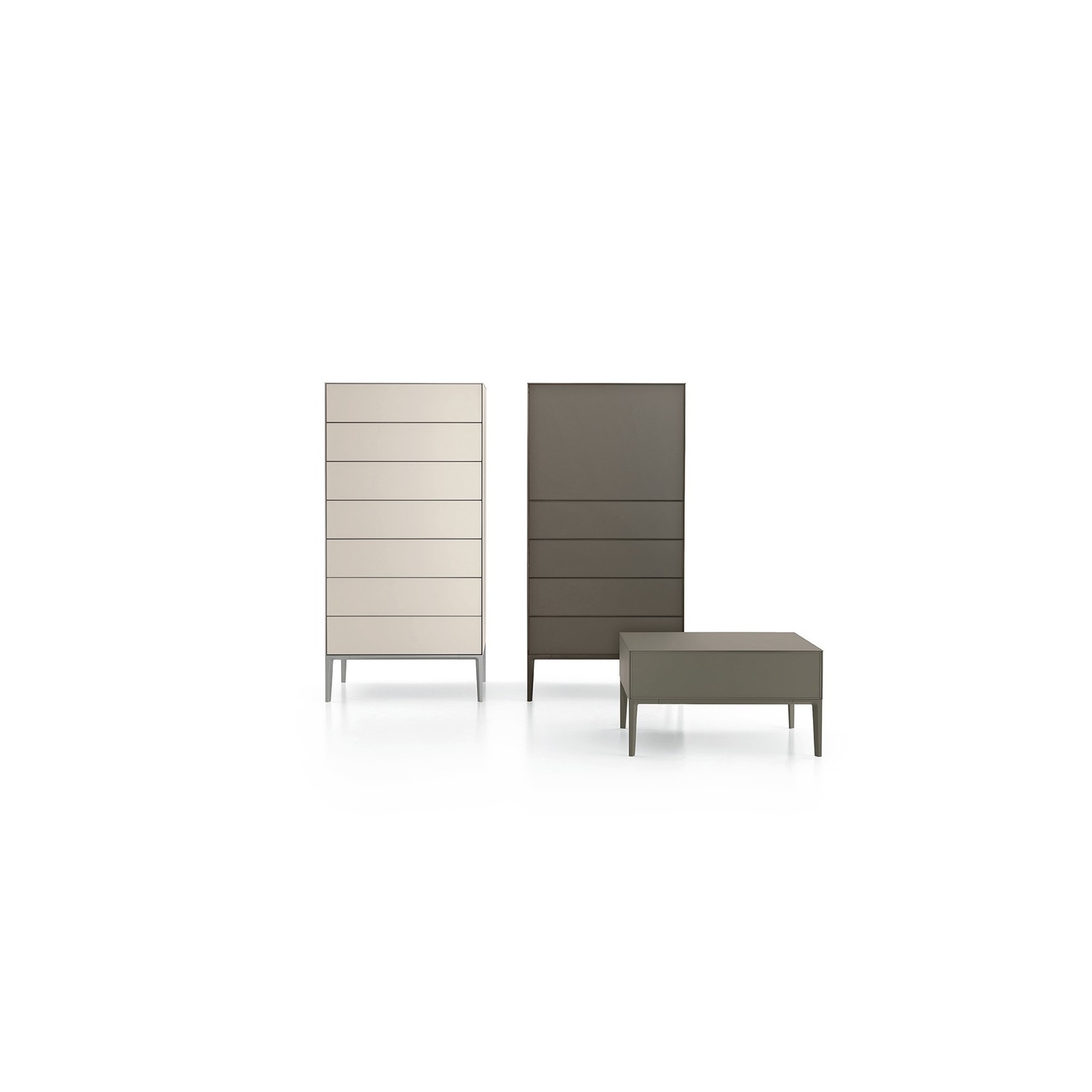 The legs, available in two heights and finished in aluminum, brown, or lacquered in 46 Ecolorsystem shades, coordinate seamlessly with the collection’s lacquered glass surfaces. Configurations include storage units with hinged doors, flap doors, and drawers in two heights, all equipped with push-to-open and soft-closing systems. The Self Up collection also features a bookcase solution, maintaining geometric modularity and stylistic consistency. Compositions can be freestanding or wall-mounted via a wall bracket with integrated LED lighting, ensuring versatility and uniformity across various living spaces.