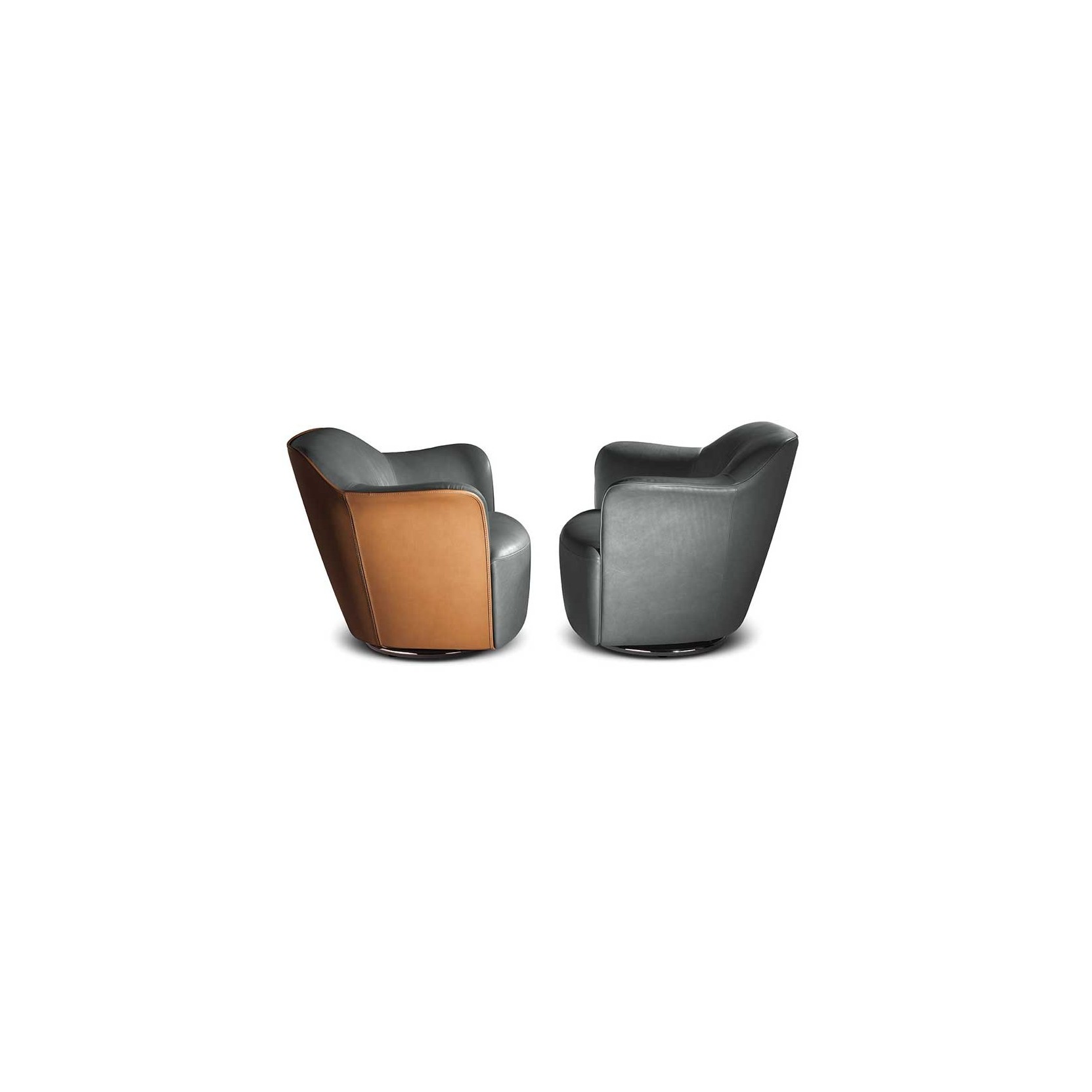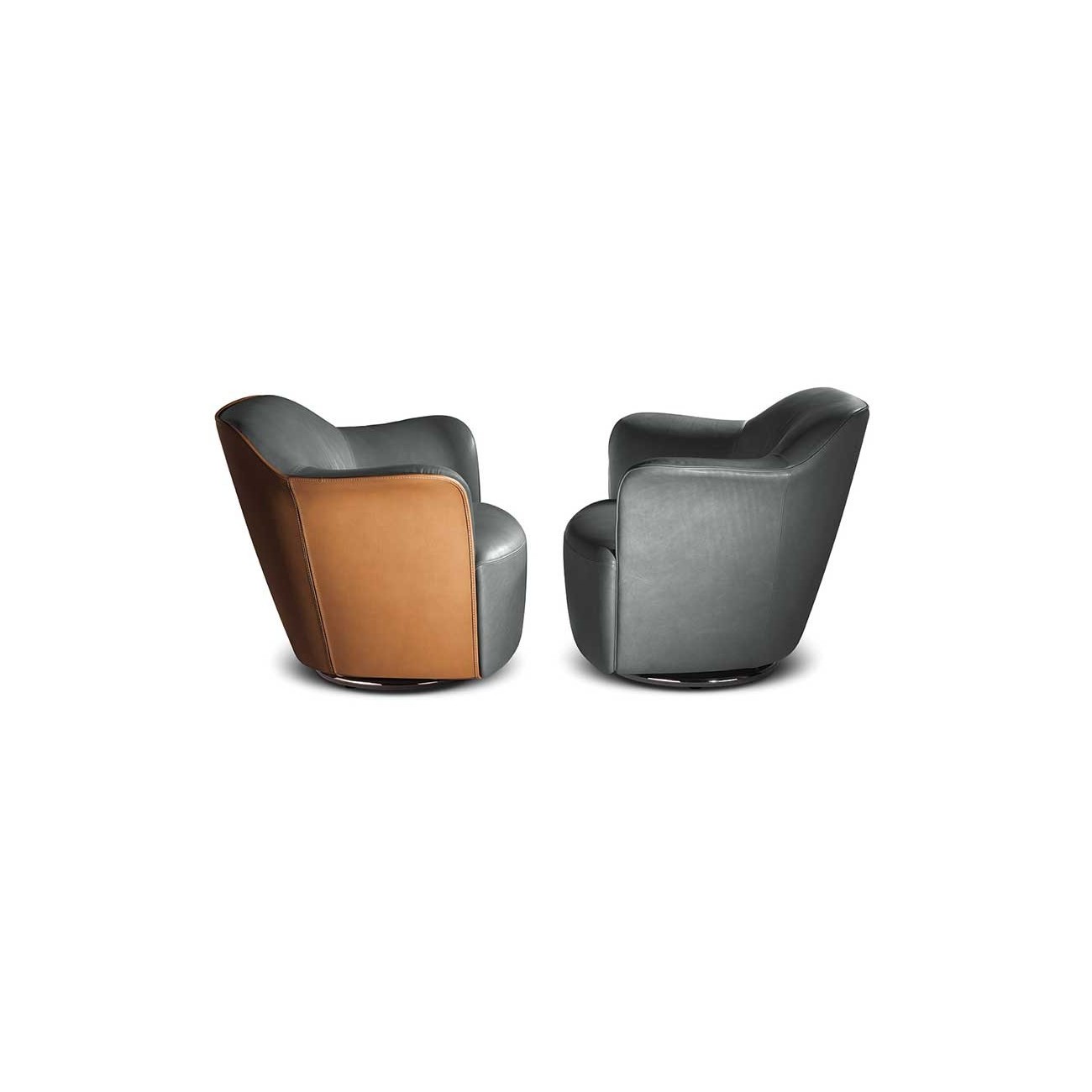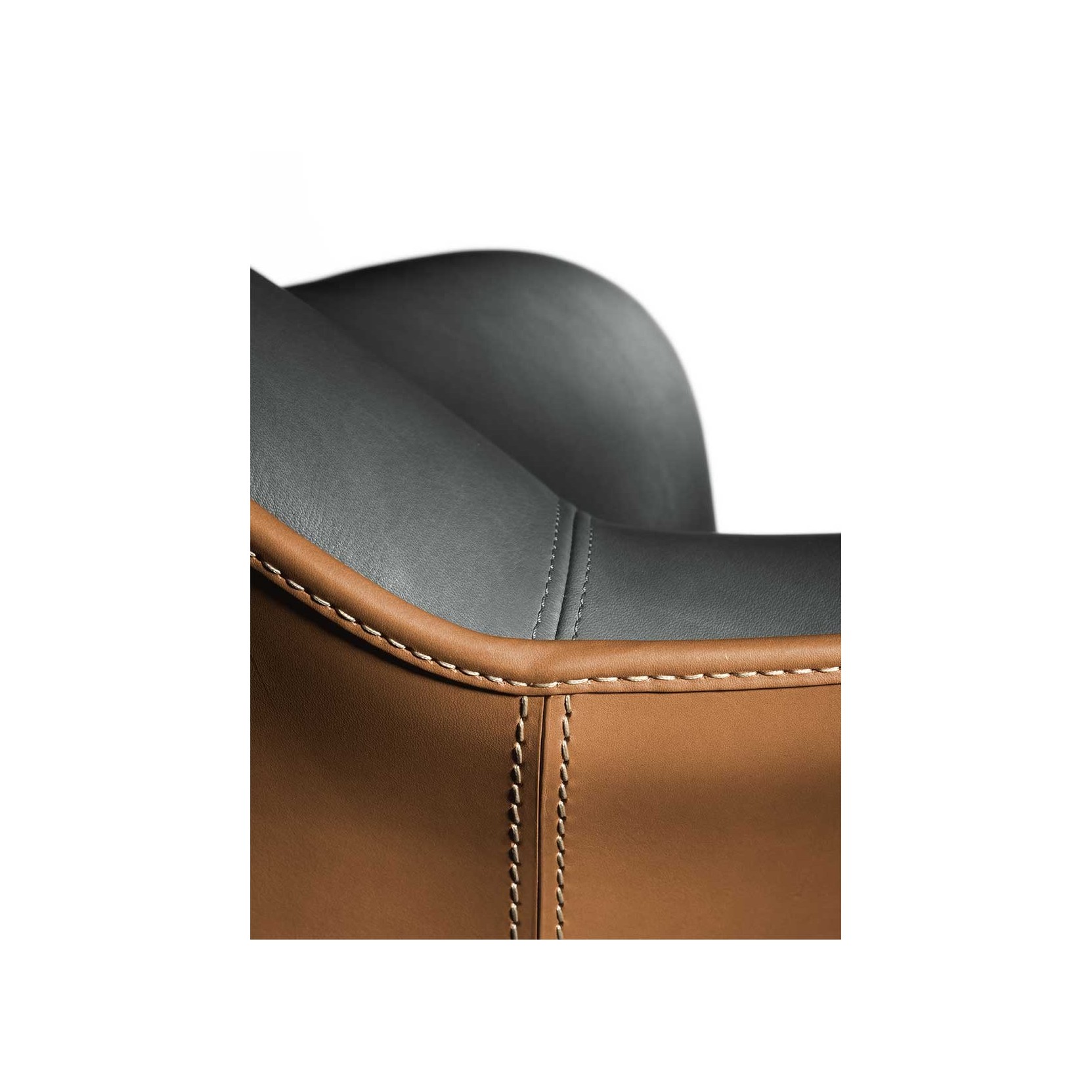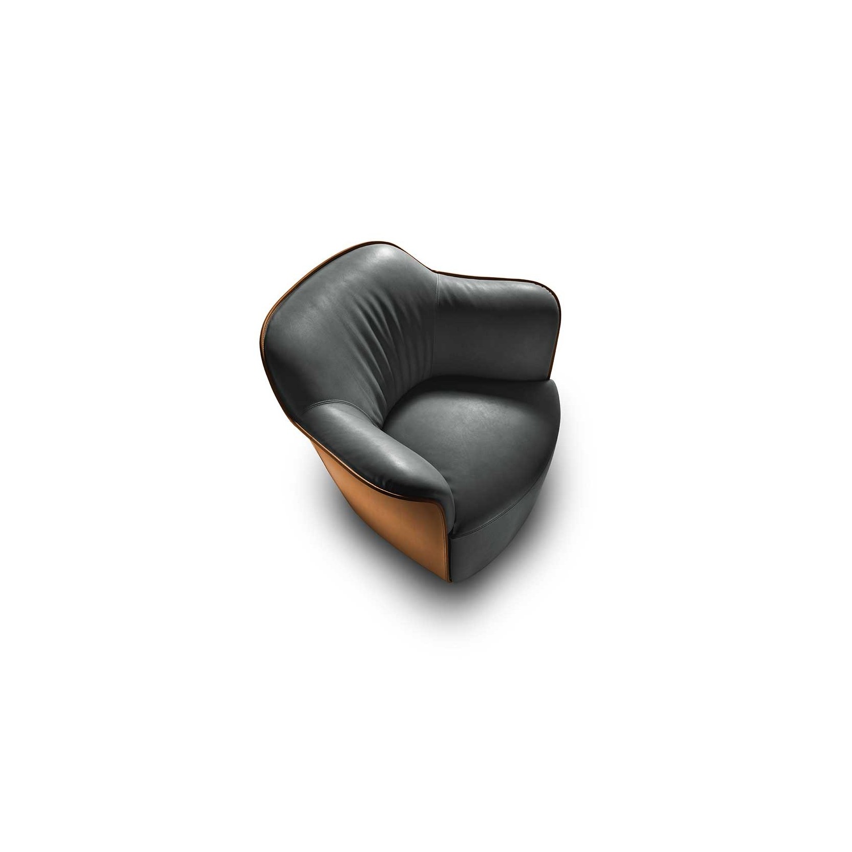 The backrest shell is made of moulded polyurethane foam. The seat structure is made of seasoned beech wood and birch plywood. The suspension consists of hand-tied biconical steel springs fixed to jute belts. The seat cushion, integrated into the structure, is made of moulded polyurethane foam. The base is available in fixed or swivel versions, made of wood or metal. The fixed wooden base has an MDF structure with a black textured finish, while the fixed metal base has a birch plywood structure and an external cover made of shaped steel sheet with a gunmetal grey finish. The swivel wooden base has a birch plywood structure with a black textured finish, while the swivel metal base has a birch plywood structure and an external cover made of shaped brass sheet with a gunmetal grey finish. The swivel mechanism allows the armchair to rotate 360° and return automatically to the starting position. The upholstery is fully in Pelle Frau® leather (SC and Nest also in a two-colour version) or in a combination of materials, with the first upholstery applied to the external shell and the second to the internal surface. The upholstery is not removable. The edges are finished with a perimeter piping in the same material chosen for the internal surface, with two exceptions: in the fully upholstered version in Pelle Frau®, the perimeter piping is also available in gros-grain, and when the external shell is in leather, the piping is always in leather.