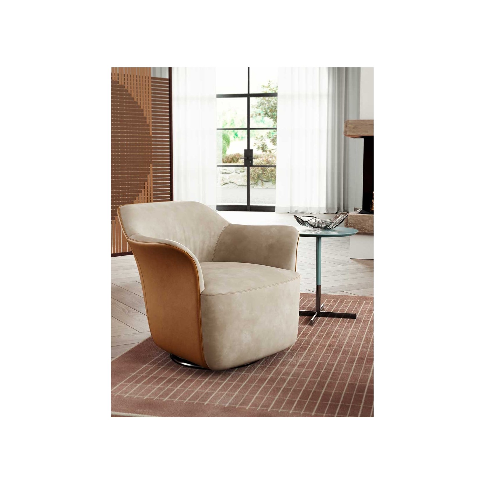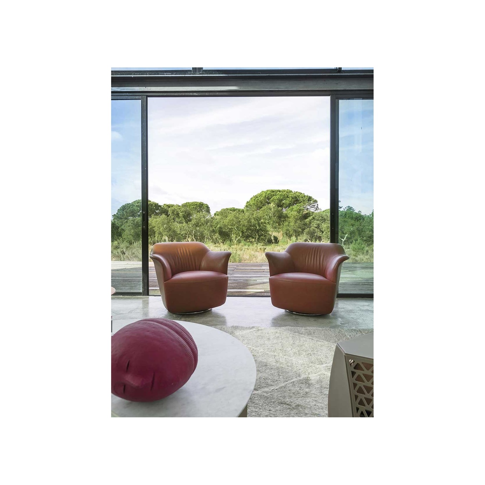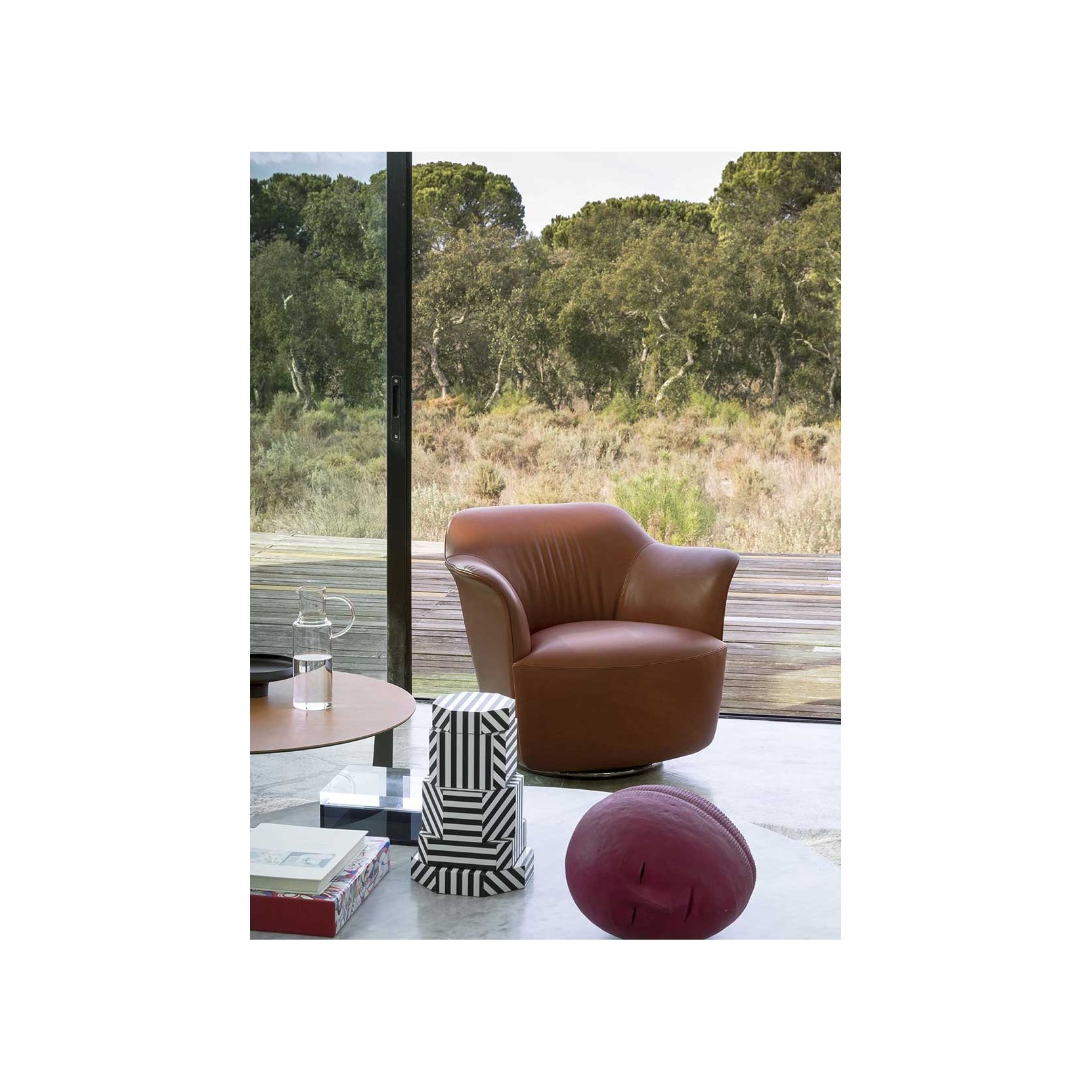 The backrest shell is made of moulded polyurethane foam. The seat structure is made of seasoned beech wood and birch plywood. The suspension consists of hand-tied biconical steel springs fixed to jute belts. The seat cushion, integrated into the structure, is made of moulded polyurethane foam. The base is available in fixed or swivel versions, made of wood or metal. The fixed wooden base has an MDF structure with a black textured finish, while the fixed metal base has a birch plywood structure and an external cover made of shaped steel sheet with a gunmetal grey finish. The swivel wooden base has a birch plywood structure with a black textured finish, while the swivel metal base has a birch plywood structure and an external cover made of shaped brass sheet with a gunmetal grey finish. The swivel mechanism allows the armchair to rotate 360° and return automatically to the starting position. The upholstery is fully in Pelle Frau® leather (SC and Nest also in a two-colour version) or in a combination of materials, with the first upholstery applied to the external shell and the second to the internal surface. The upholstery is not removable. The edges are finished with a perimeter piping in the same material chosen for the internal surface, with two exceptions: in the fully upholstered version in Pelle Frau®, the perimeter piping is also available in gros-grain, and when the external shell is in leather, the piping is always in leather.