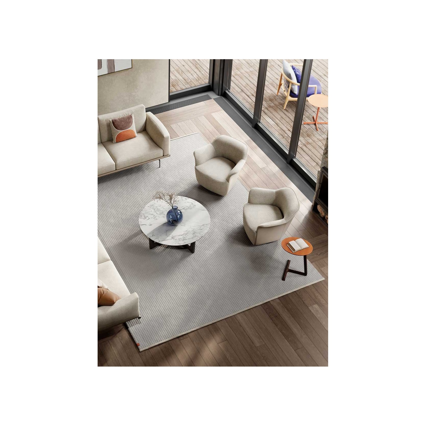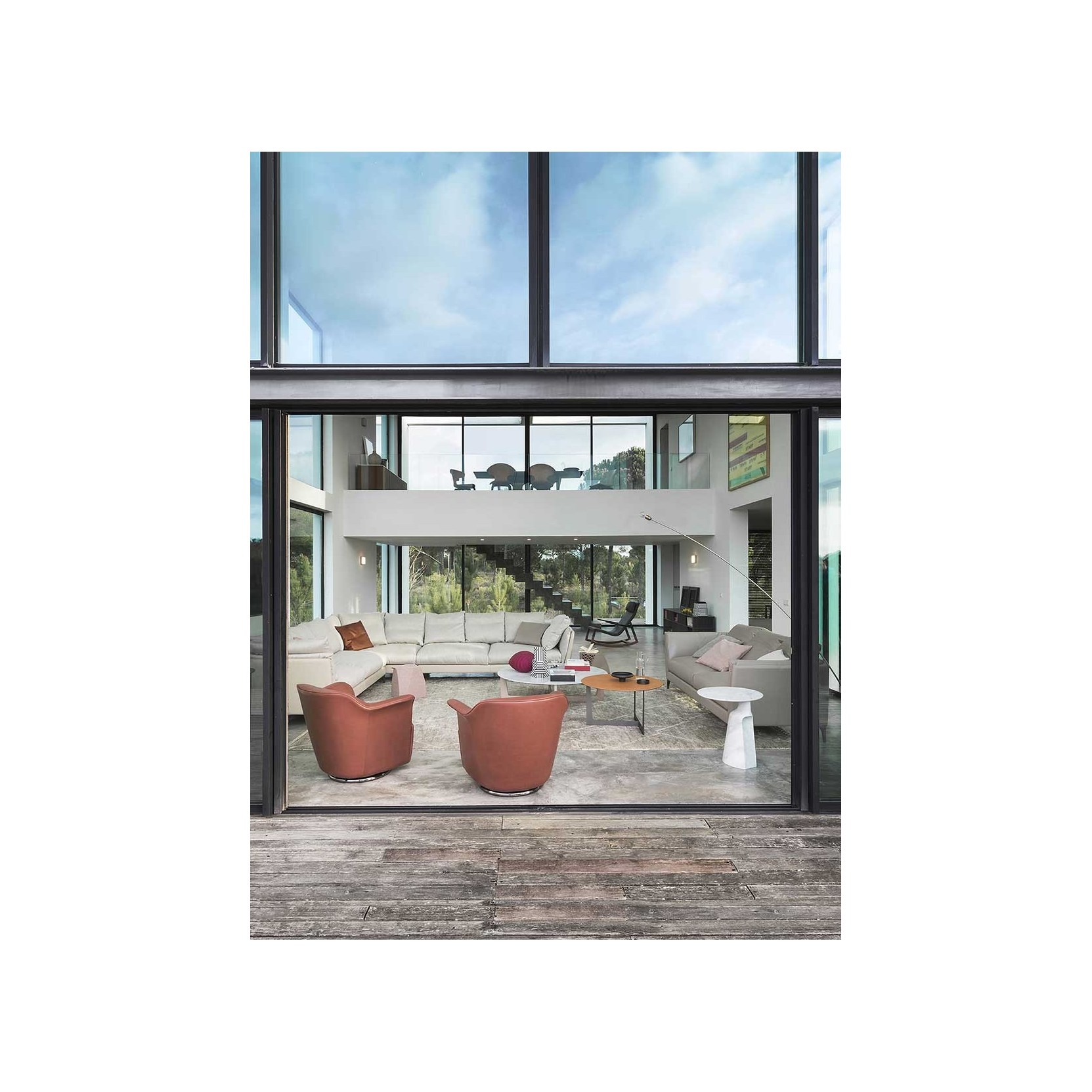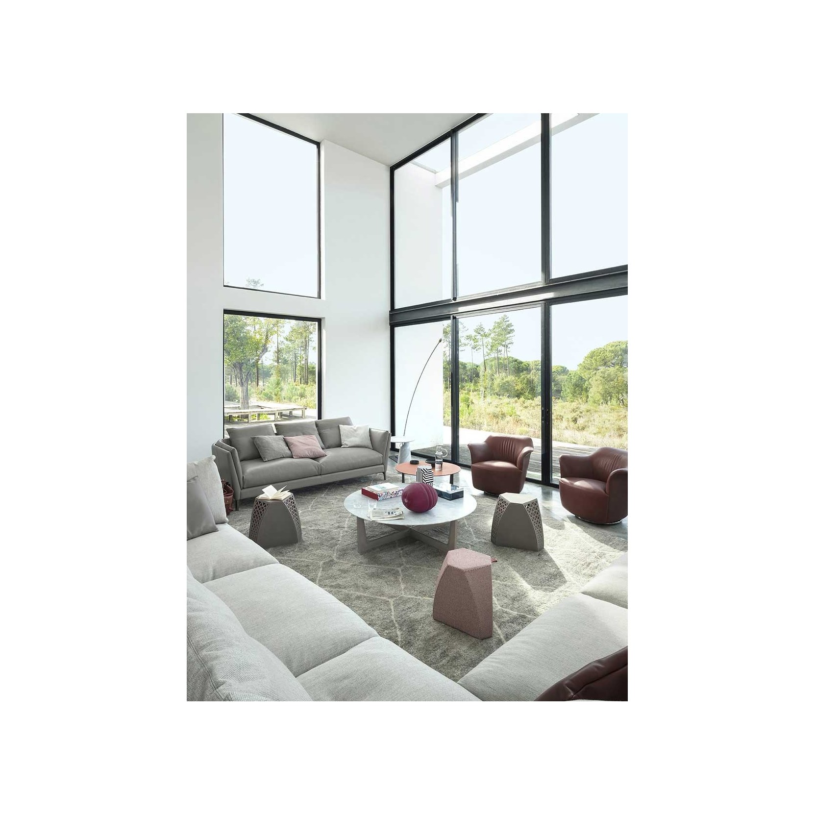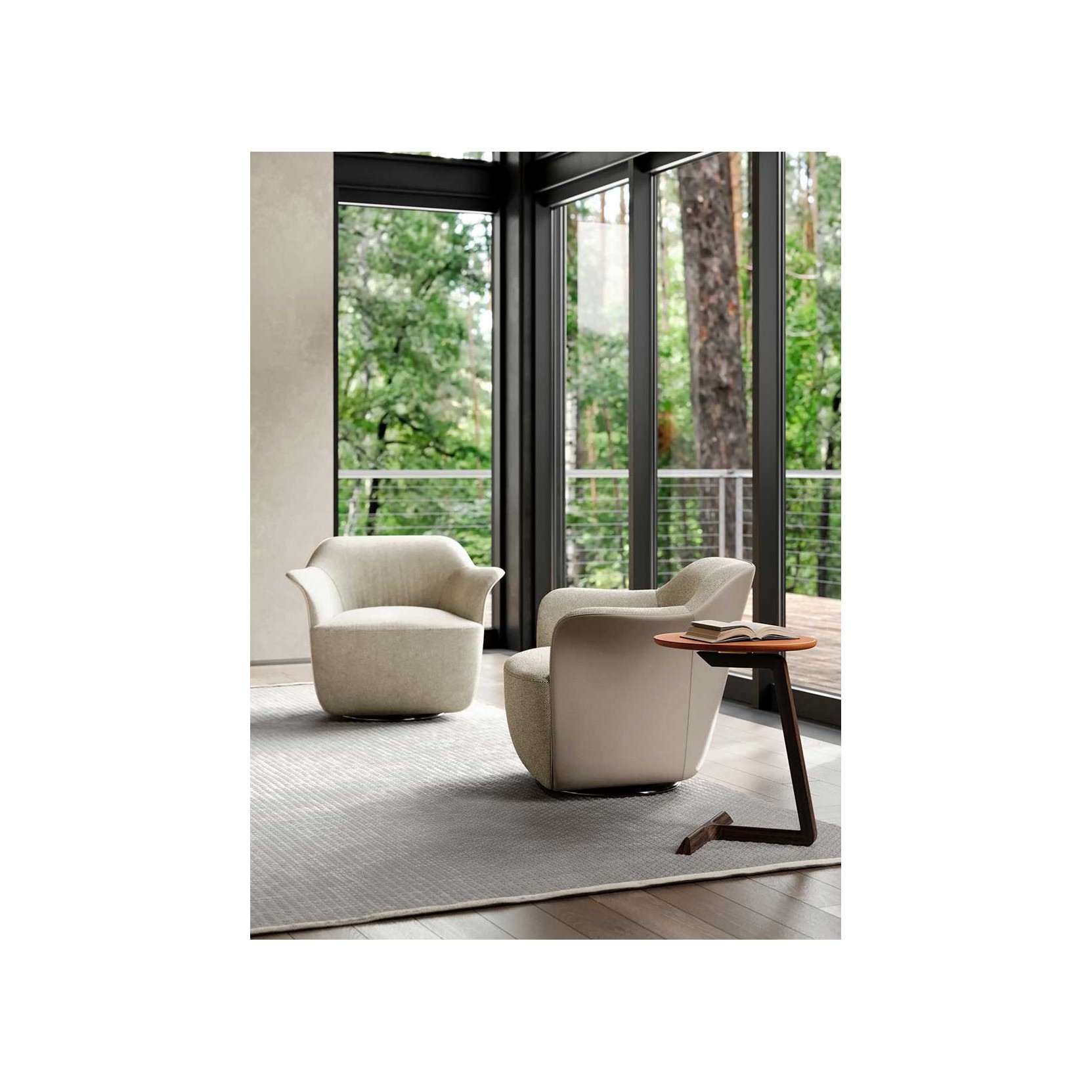 The backrest shell is made of moulded polyurethane foam. The seat structure is made of seasoned beech wood and birch plywood. The suspension consists of hand-tied biconical steel springs fixed to jute belts. The seat cushion, integrated into the structure, is made of moulded polyurethane foam. The base is available in fixed or swivel versions, made of wood or metal. The fixed wooden base has an MDF structure with a black textured finish, while the fixed metal base has a birch plywood structure and an external cover made of shaped steel sheet with a gunmetal grey finish. The swivel wooden base has a birch plywood structure with a black textured finish, while the swivel metal base has a birch plywood structure and an external cover made of shaped brass sheet with a gunmetal grey finish. The swivel mechanism allows the armchair to rotate 360° and return automatically to the starting position. The upholstery is fully in Pelle Frau® leather (SC and Nest also in a two-colour version) or in a combination of materials, with the first upholstery applied to the external shell and the second to the internal surface. The upholstery is not removable. The edges are finished with a perimeter piping in the same material chosen for the internal surface, with two exceptions: in the fully upholstered version in Pelle Frau®, the perimeter piping is also available in gros-grain, and when the external shell is in leather, the piping is always in leather.