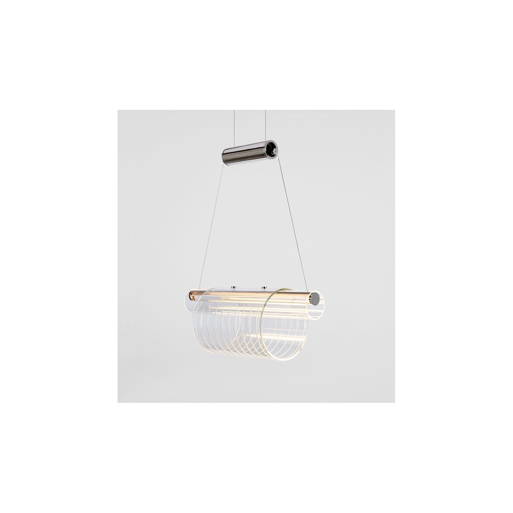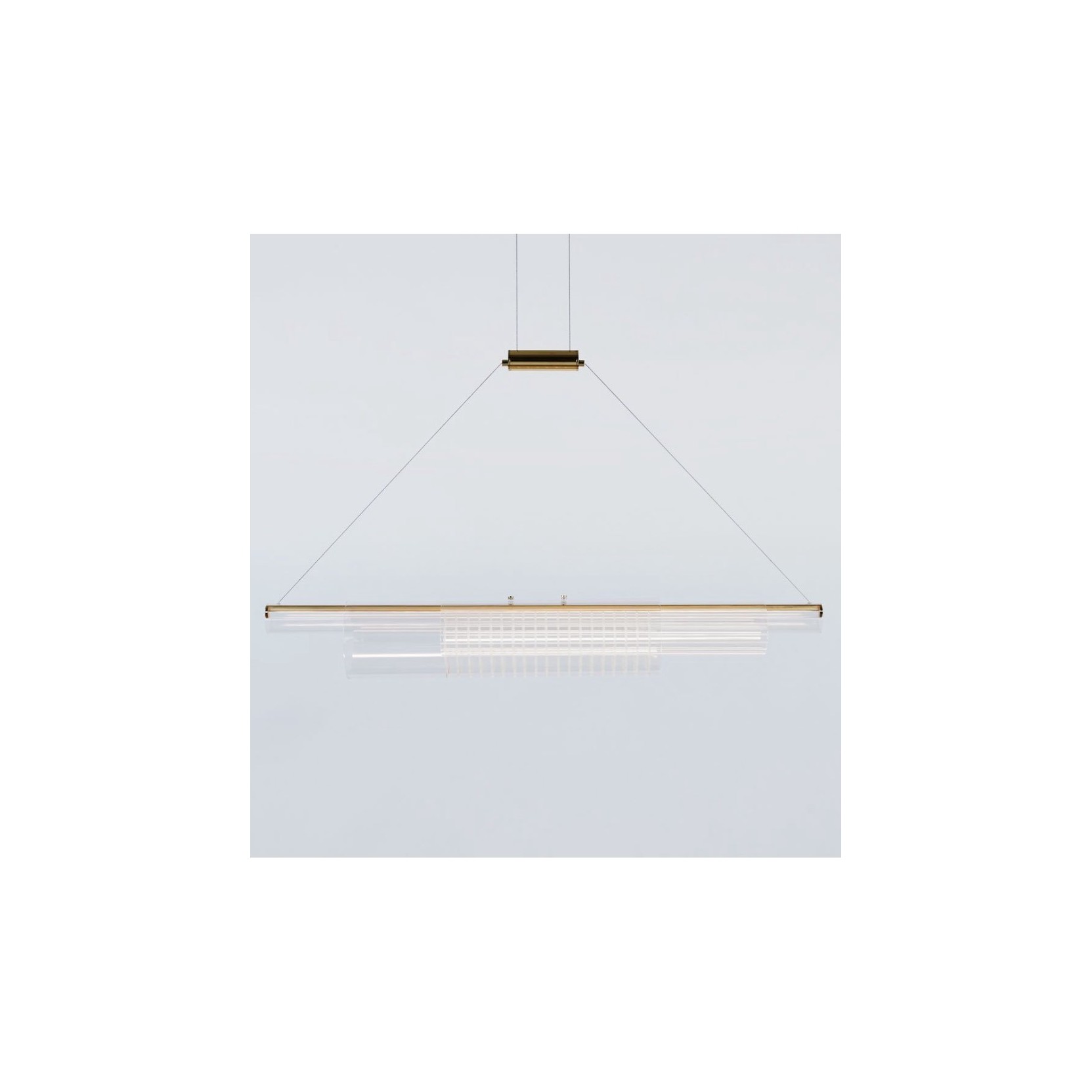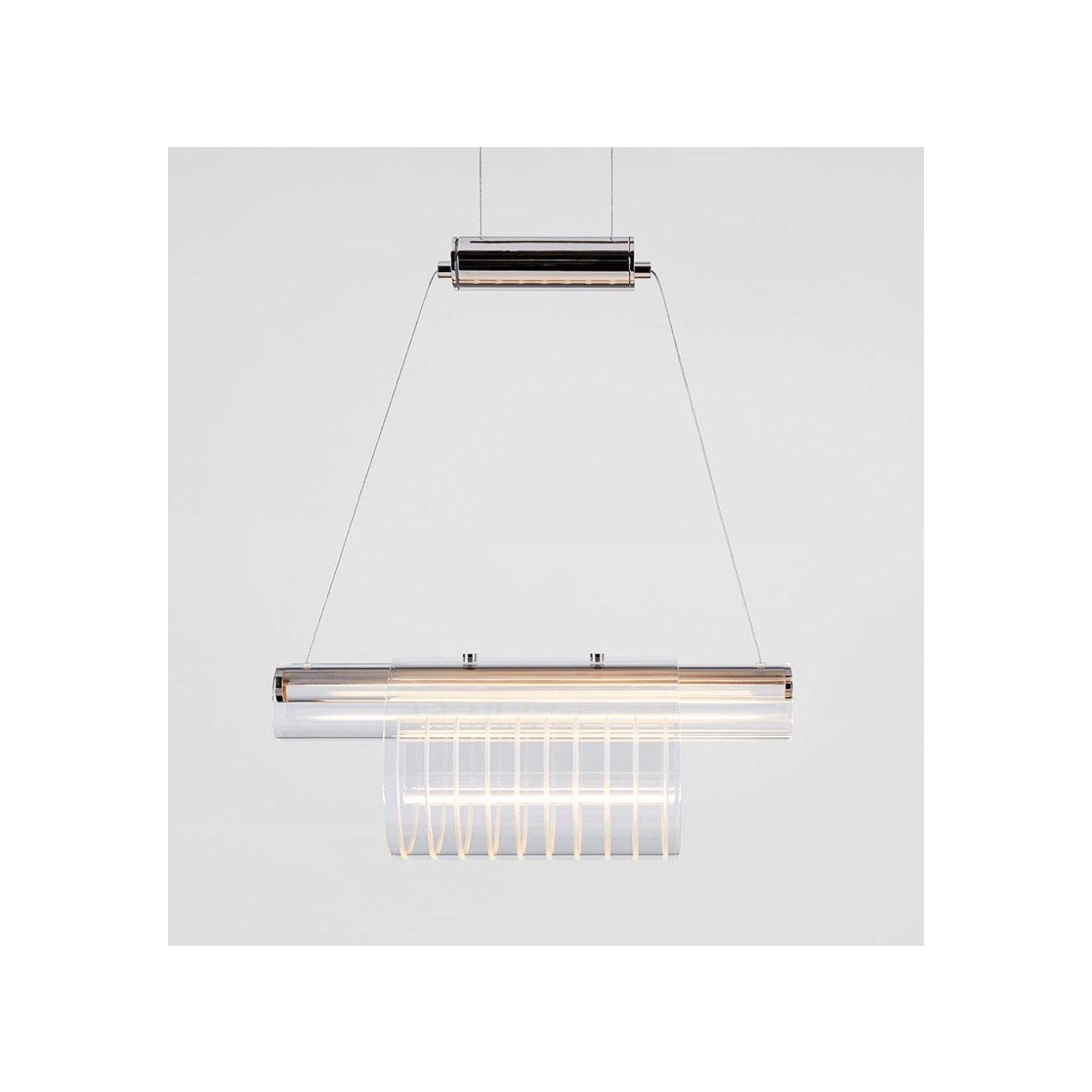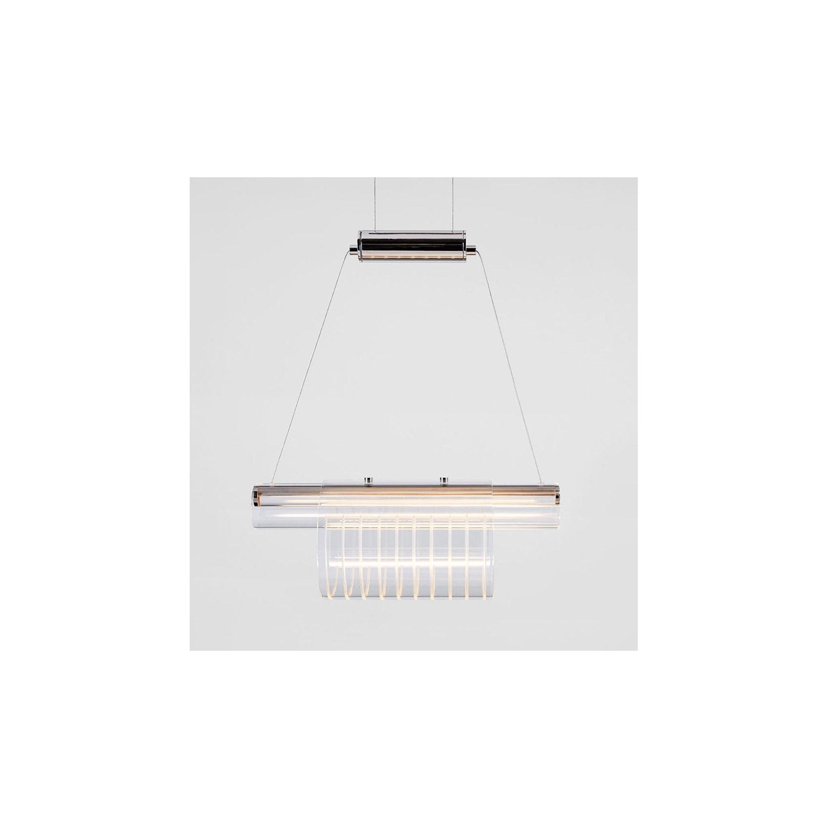 Coax is a coalescence of metal, glass, and light. The materials hang serenely, appearing weightless against each other. Cylindrical echoes of transparent glass surround a tube of light suspended in air.