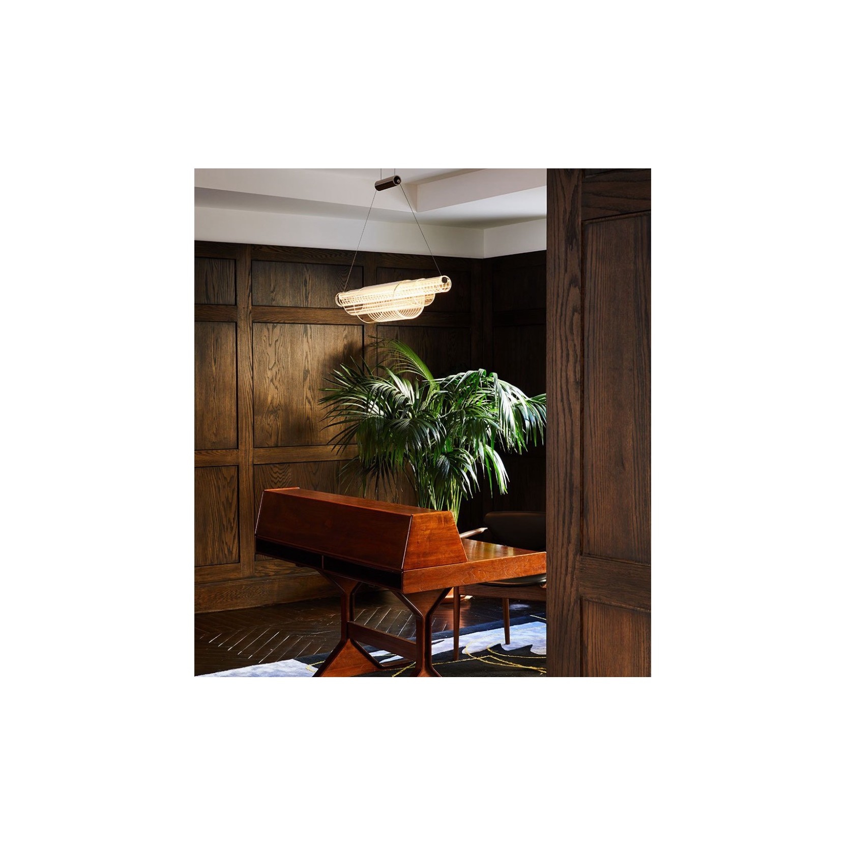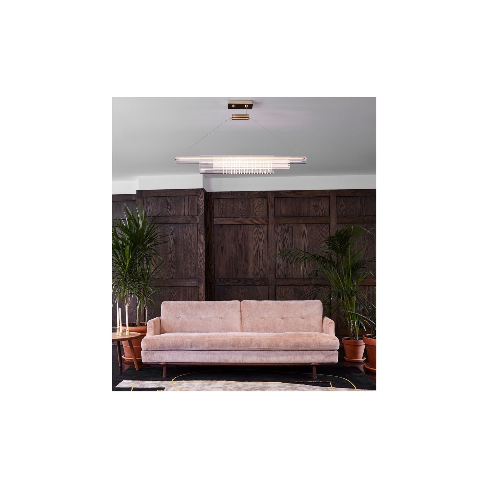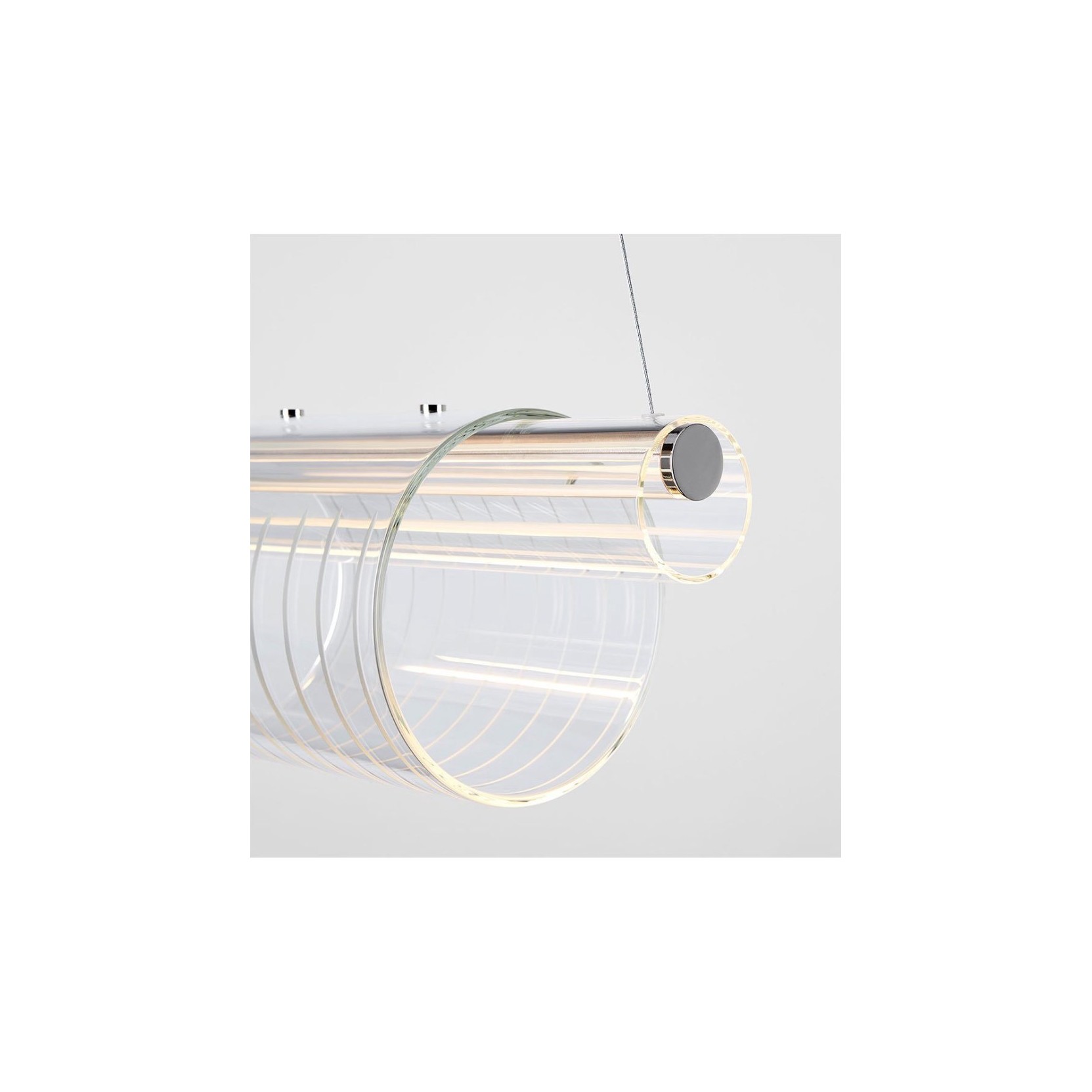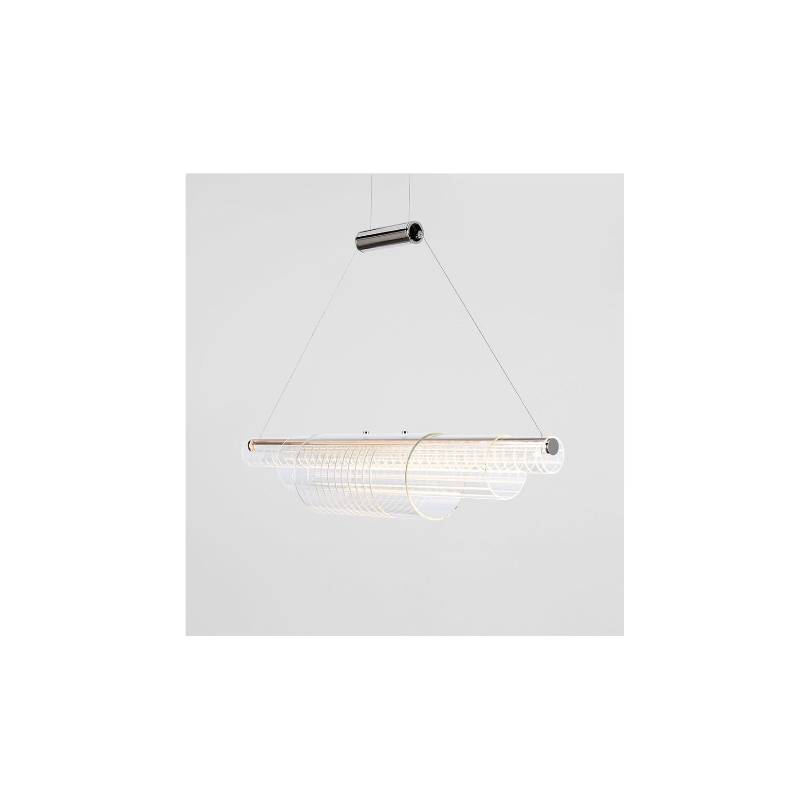 Coax is a coalescence of metal, glass, and light. The materials hang serenely, appearing weightless against each other. Cylindrical echoes of transparent glass surround a tube of light suspended in air.