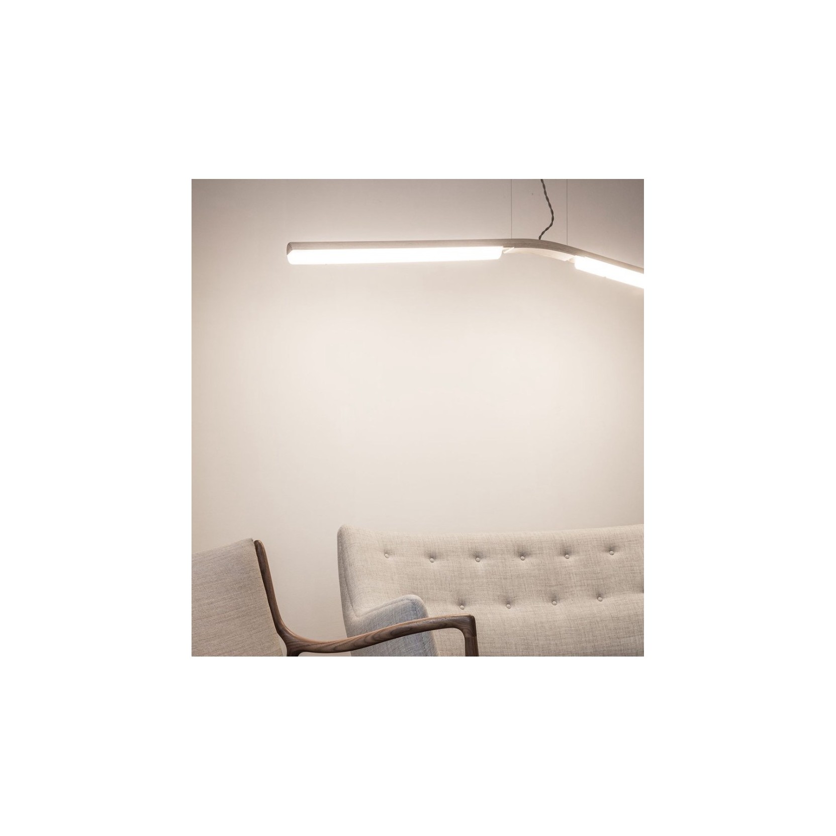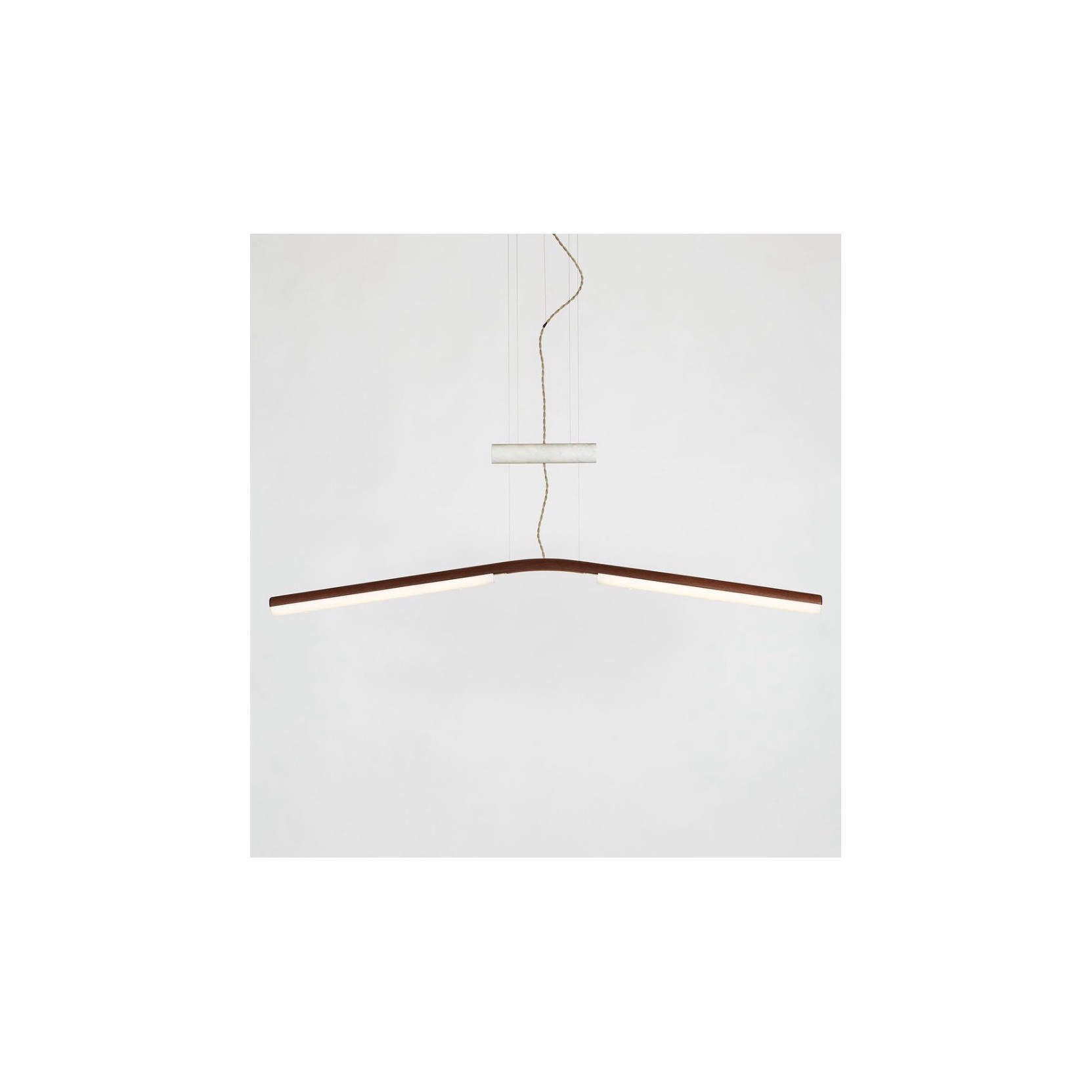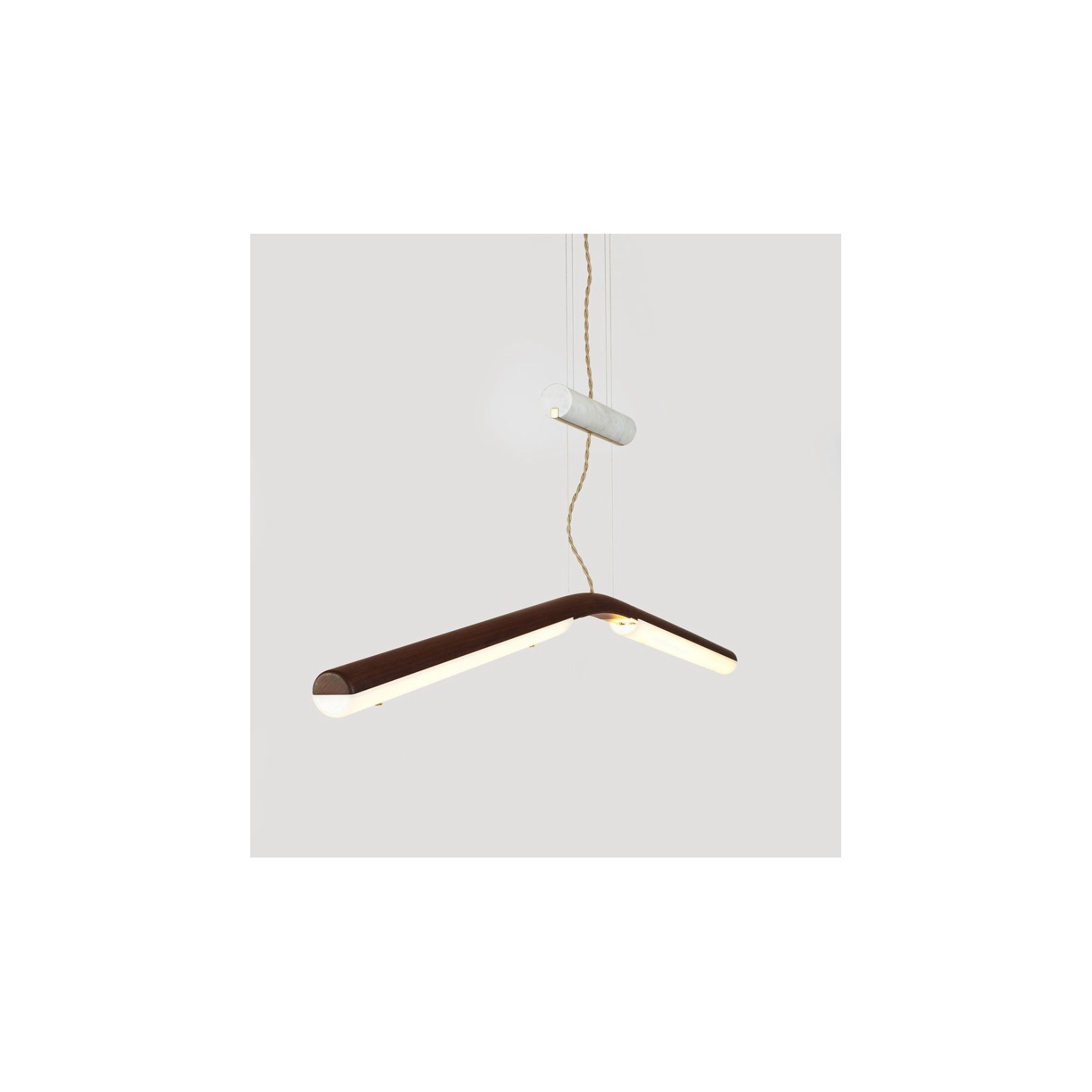 Counterweight is a series of LED fixtures made of gently arching, steam-bent wood that uses marble and brass as ballasts. Whether acting to cantilever the arms of the mobile light, or fixed as the base of the floor lamp, the mass of the stone and metal acts as a foil to the otherwise lightweight frames.