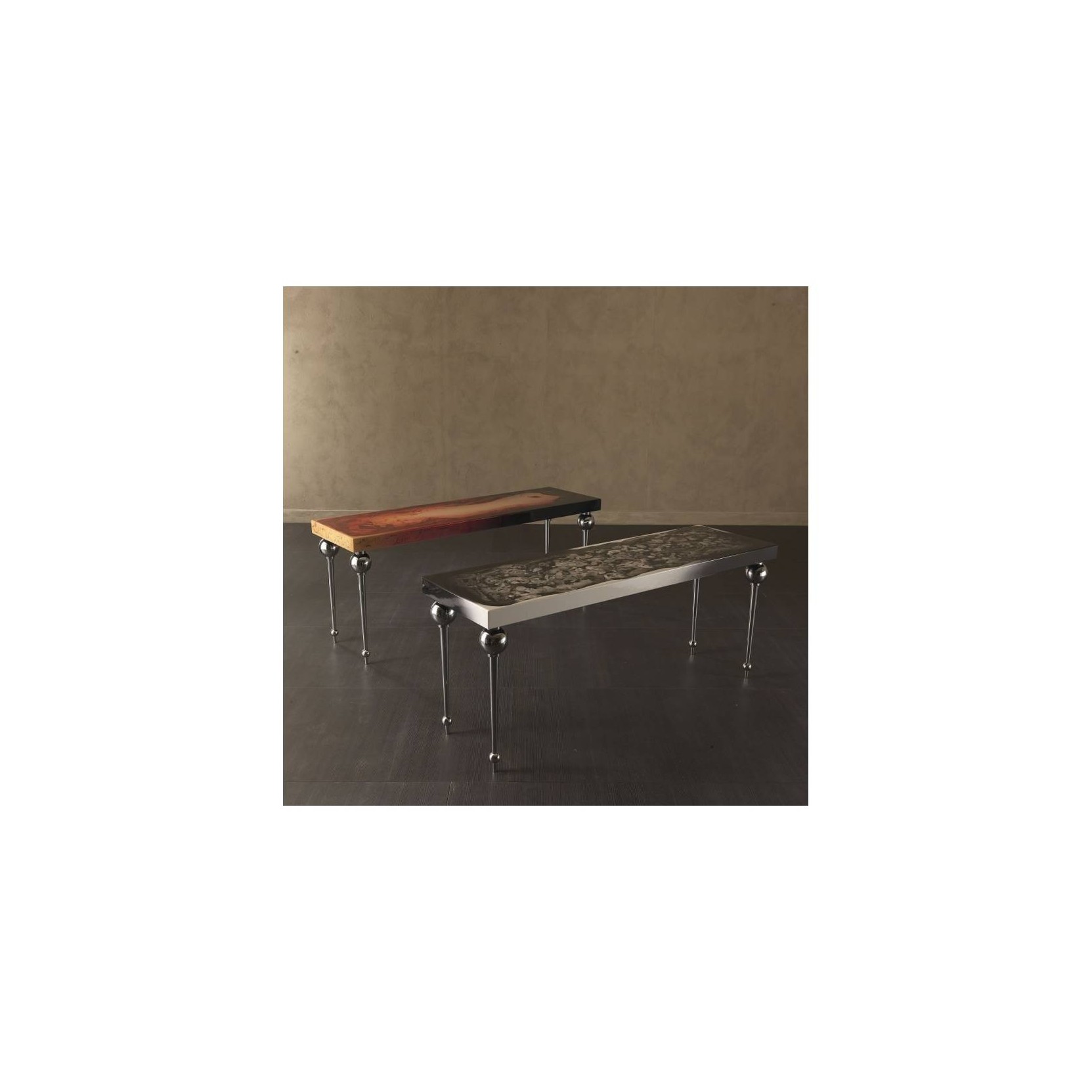 Marilyn designed by Rugiano is a consoles collection with top in leather, painted or lacquered. Legs in steel or bronze.