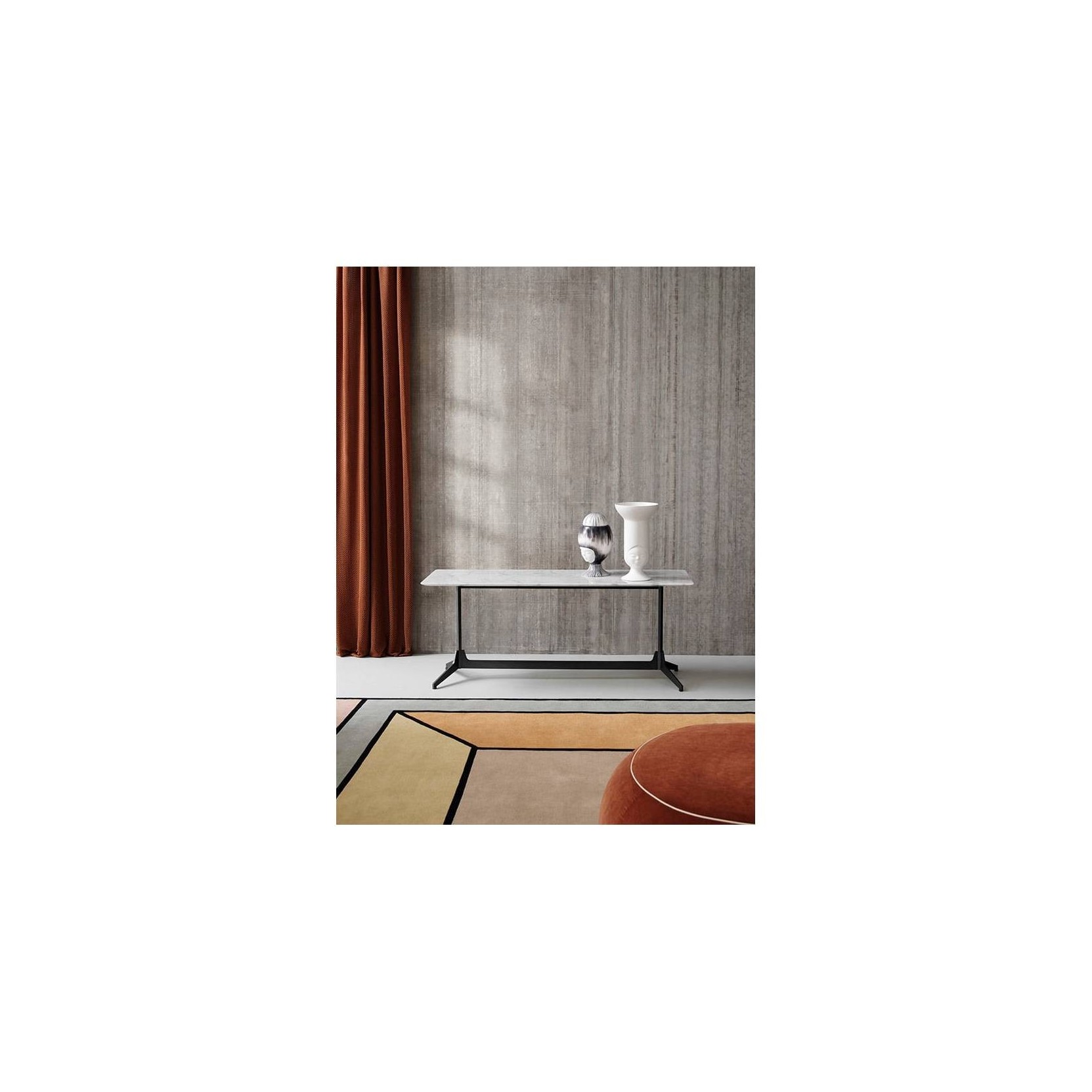The project takes its inspiration from the concept of our memory, reimagining simple and iconic forms with echoes from the past. Central to the design is the upright hexagonal structure typically used in building construction that, in this particular context, is interpreted as a joint onto which the feet are attached perpendicularly. This style detail is reminiscent of 1950’s furniture design. The base of the table is painted finished metallic wire drawn.