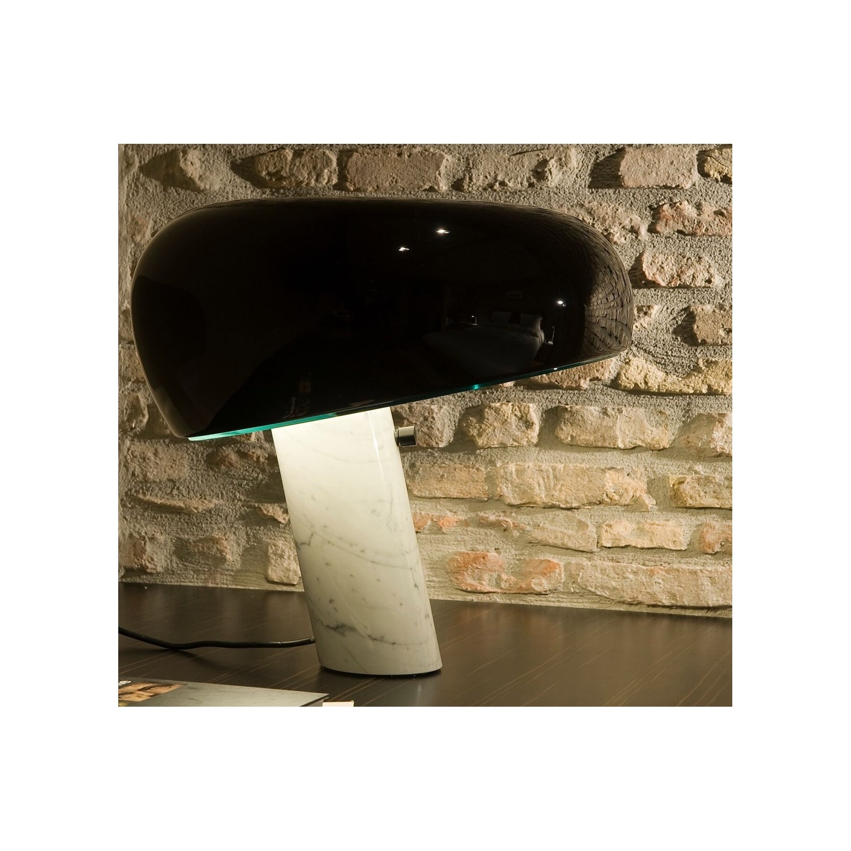 The Snoopy provides direct light through a thick glass disk and an enameled reflector, both resting in perfect balance on a white marble base. There is an internal dimmer and switch.
