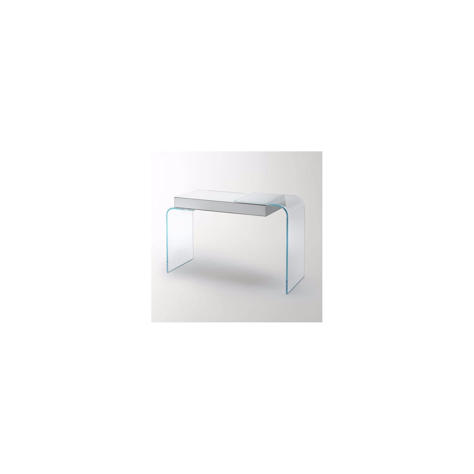 Strata has curved bent mm.15 crystal legs and top supplied with push-pull drawer, completely covered in tempered glass, glossy or matt lacquered, 45 ° fused. The bottom of the drawer is in the same finish as the outside. In the top there is a milled cable duct, in which a double-sided mirror can be inserted, transforming the desk into a modern toeletta.