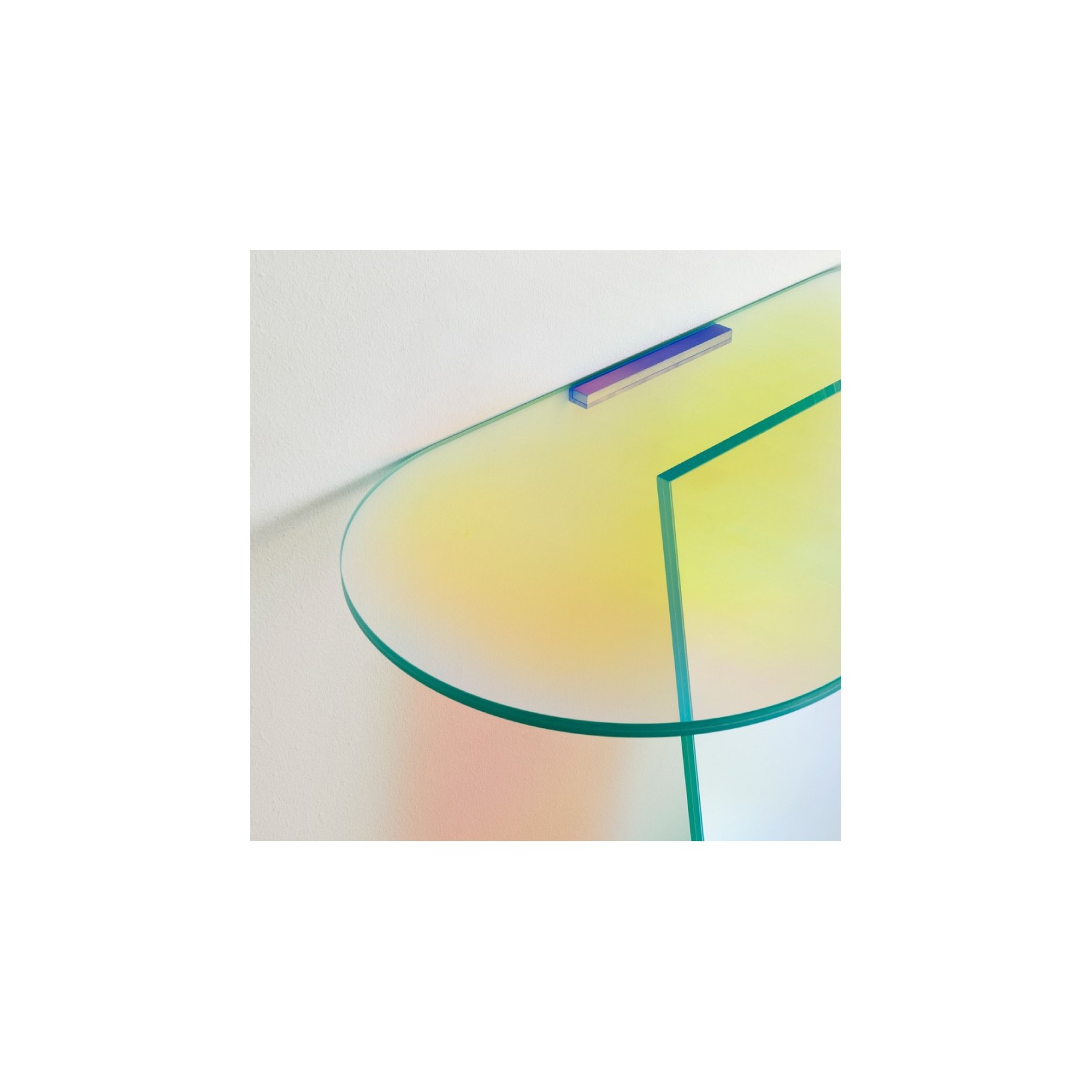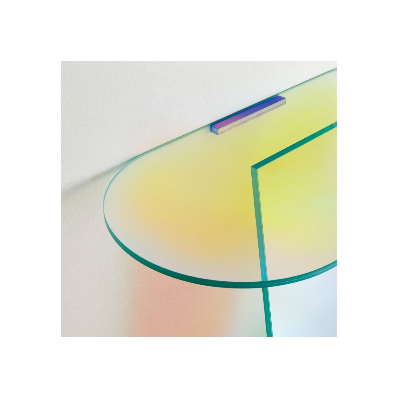 Desk in clear glass or in a new extra-special extra-sided etched glass, tempered and heat-sealed. A footrest bar is fixed to the sides of the desk, using aluminum plates with satin finish stainless steel, inserted into the thickness of the crystal. In the version of the bar is etched aluminum with satin finish stainless steel, in transparent natural wood ash. The great attention to detail and calibrated proportions give this desk a matter of great style and elegance and make it a unique piece capable of furnishing qualuqnue space.