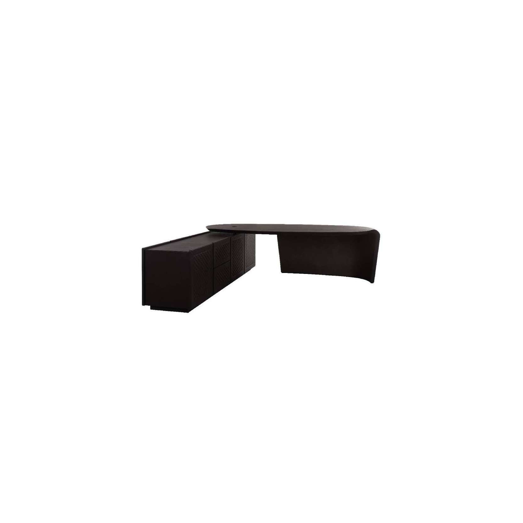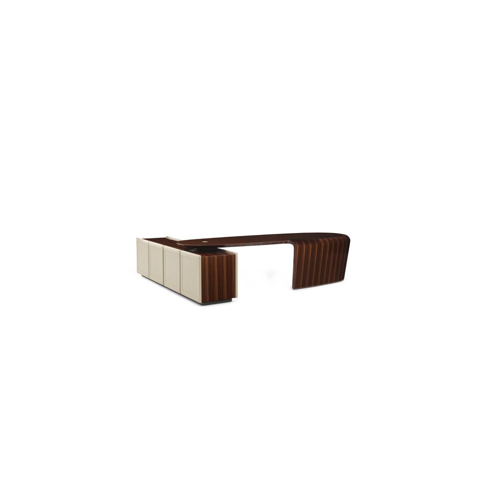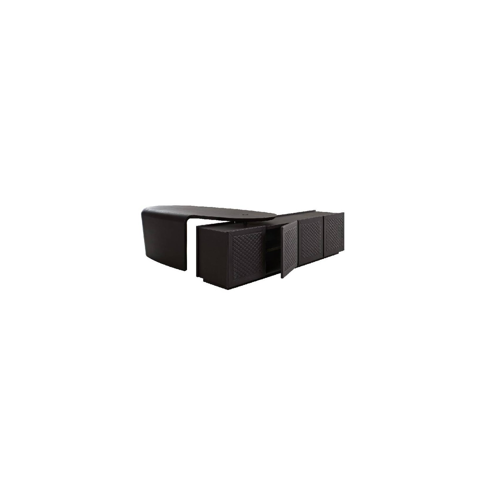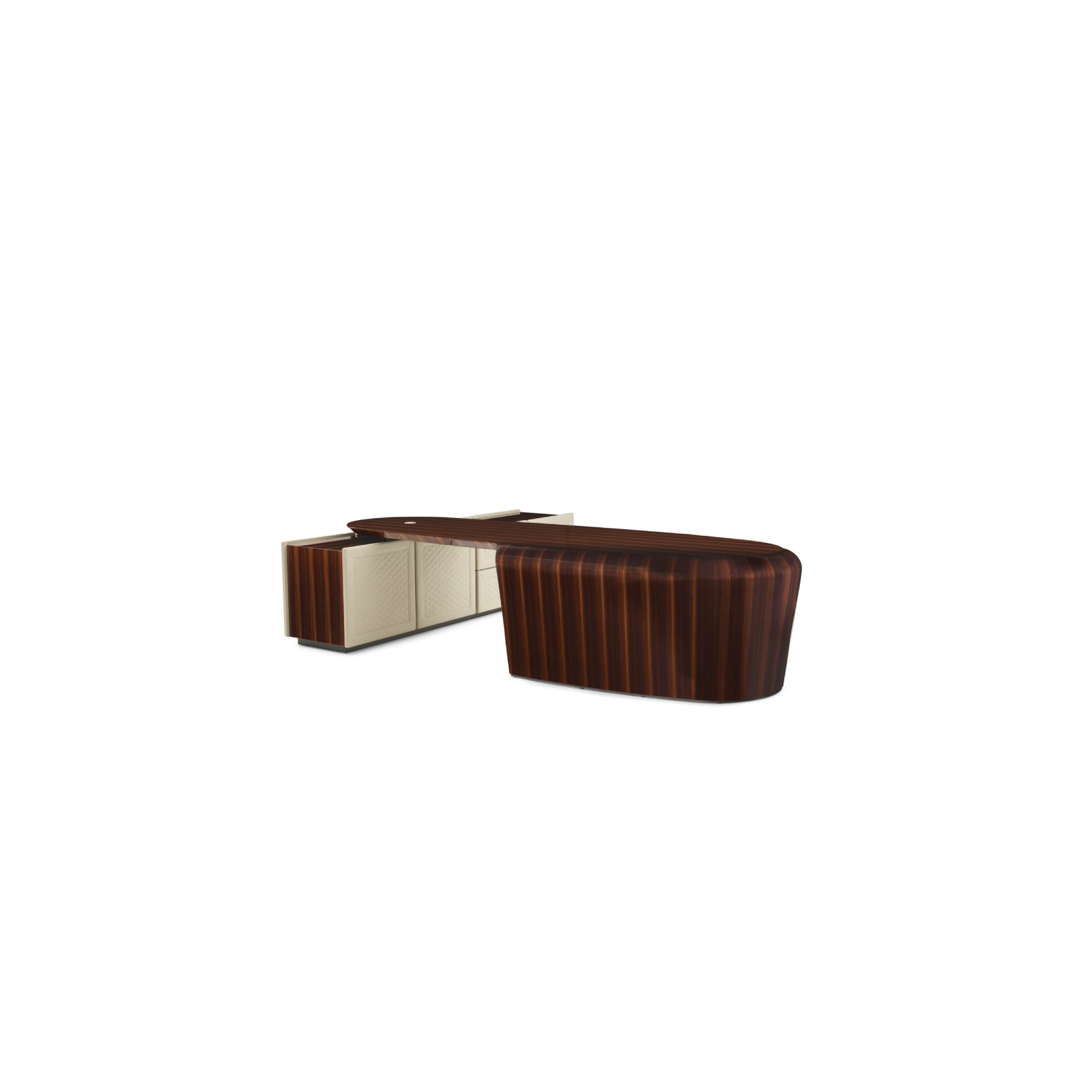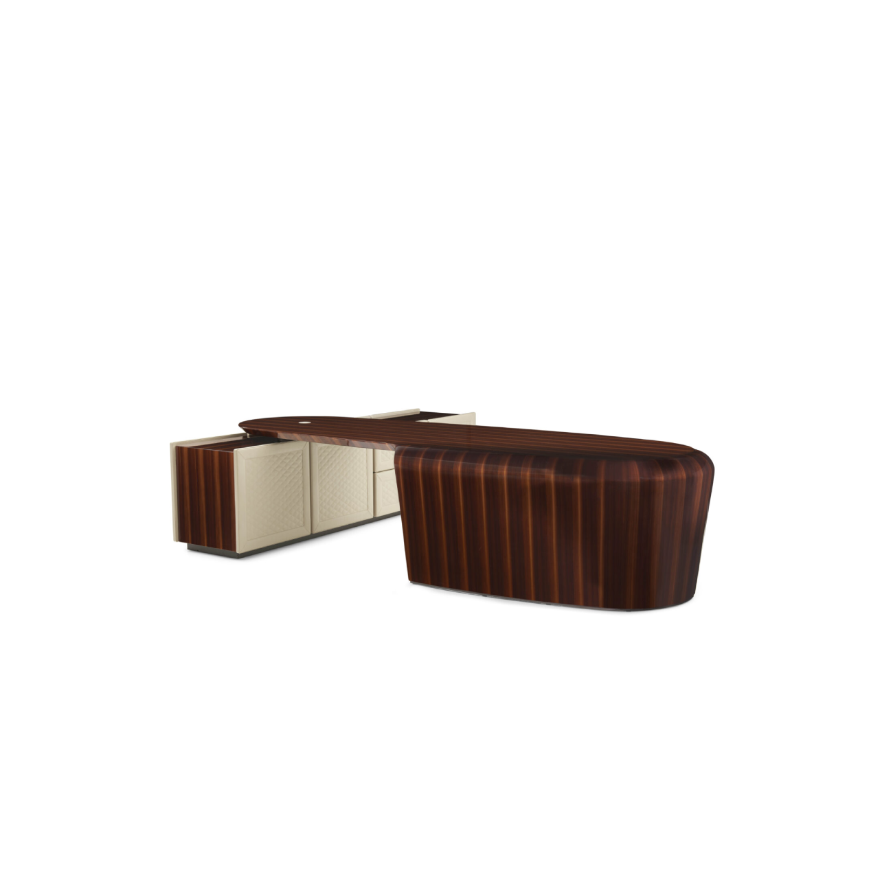 Unique and evocative design for the President writing desk defined by full, harmonious proportions. The aerodynamic style of the silhouette is an exact reference of the world of automobiles, in the movement of full and curvy volumes of the structure, entirely covered in leather. Wooden top covered in leather, with tempered extraclear glass, veneered Warm Grey Fiddleback Sycamore, Toffee Brown Smoked Larch, Smoked Liquidambar or Burr Walnut briar-root.