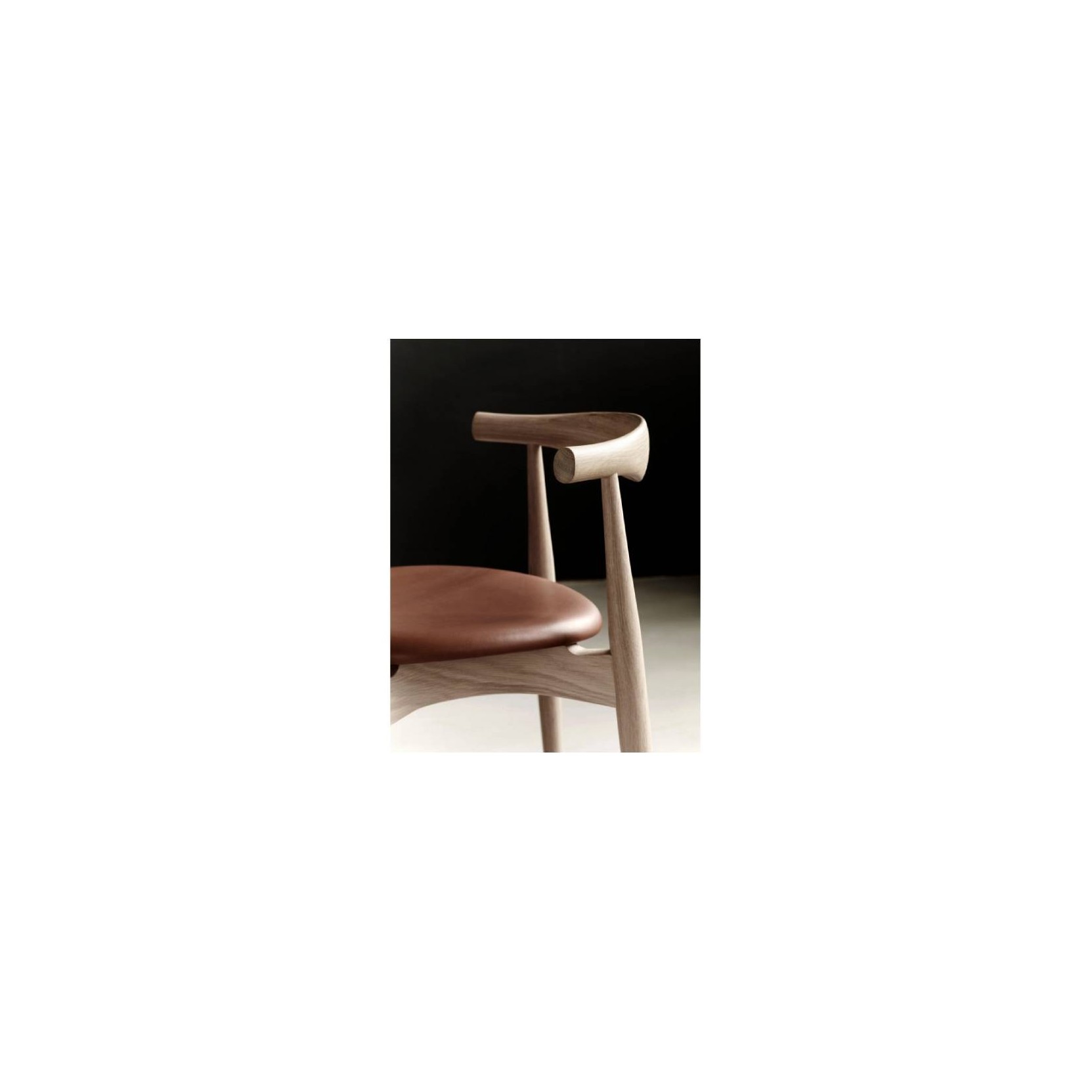Elbow is a chair by Hans J Wegner for Carl Hansen & Son, solid wood frame in various finishes: beech, oak lacquered black, seat cover in fabric or leather.