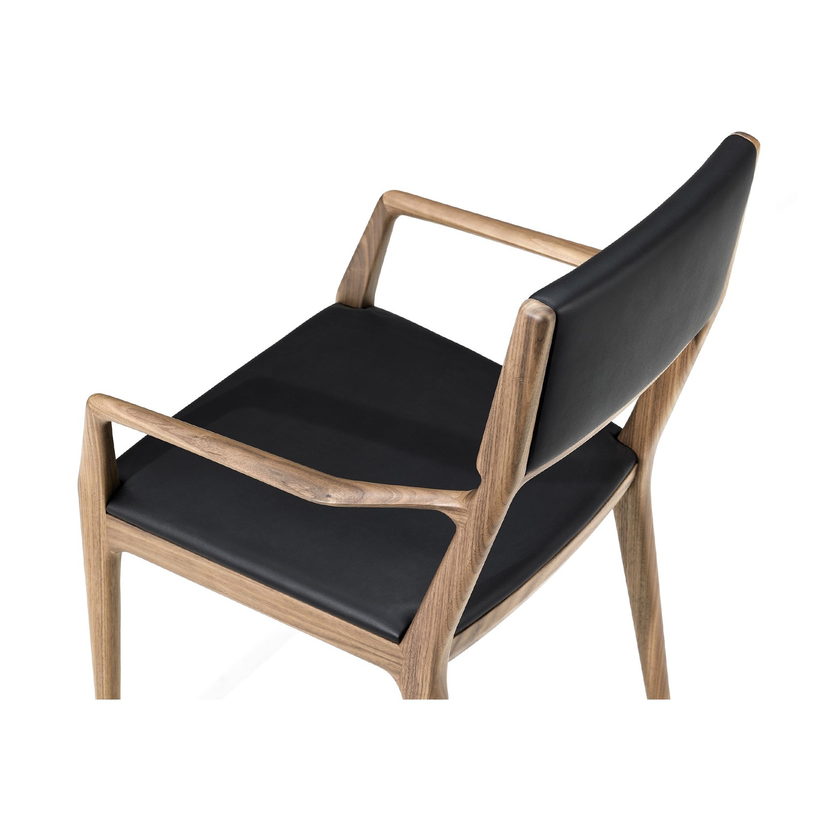 Crafted entirely from solid American walnut or ash, its frame is defined by clean, geometric lines. The straight sides flare gently upward to seamlessly embrace the upholstered backrest, built with a plywood poplar frame and elastic webbing to ensure maximum ergonomic comfort.
