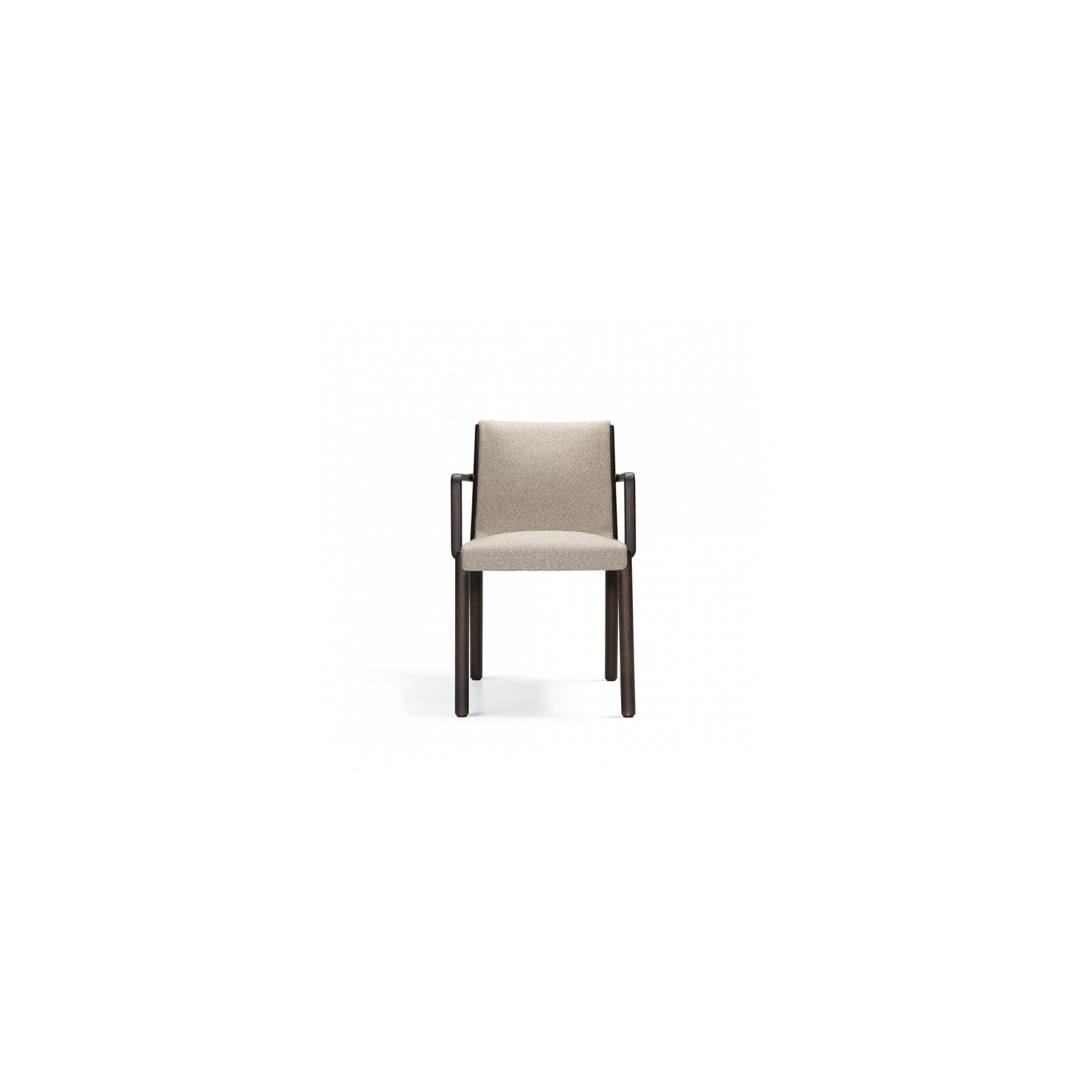 Janet is a chair available with or without armrests, designed to make a strong impression with its solid wood frame. Its elegant lines make it versatile, allowing it to complement a variety of tables while adding a distinctive touch to any setting. The structure features rounded elements, crafted through a precise and meticulous woodworking process, creating a harmonious and refined look. The shell, made from plastic and ergonomically shaped with a thin layer of polyurethane, attaches seamlessly to the upper and lower crossbars of the frame. This results in an integrated seating and backrest system that flows continuously, offering exceptional comfort due to the careful attention to detail and ergonomic design. Janet is available with upholstery in fabric or leather from the Molteni&C collection. In some versions, the upholstery is removable, with the caveat that it must be done by qualified personnel. Additionally, upon request, the chair is available in a fire-retardant version, compliant with BS 5852 and TB 117-2013 standards. It is the buyer's responsibility to ensure the product meets local regulations and specifications for its intended use.