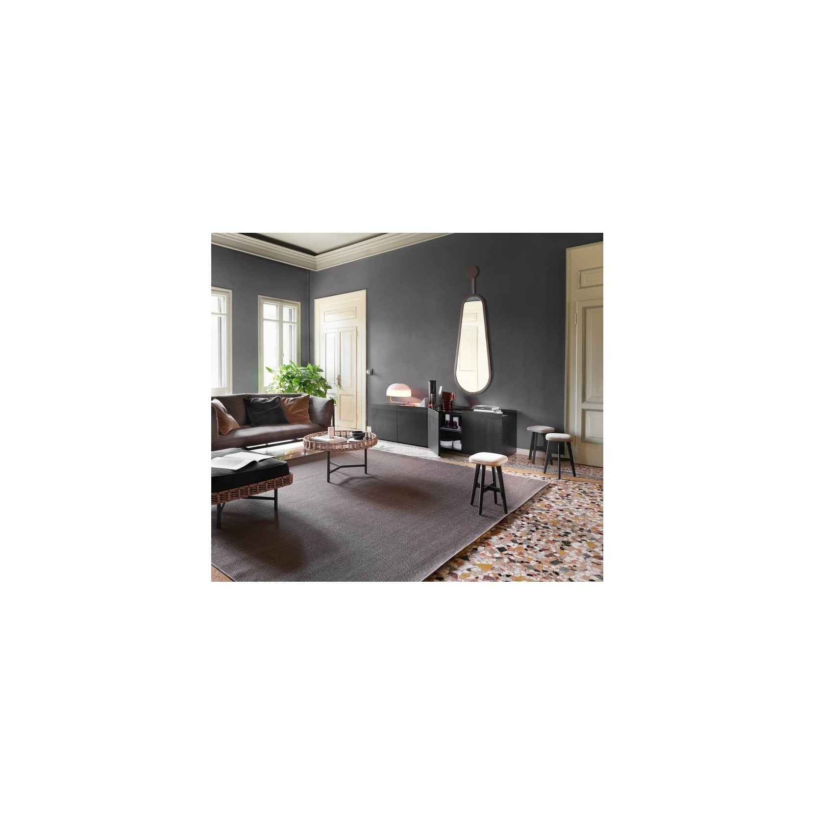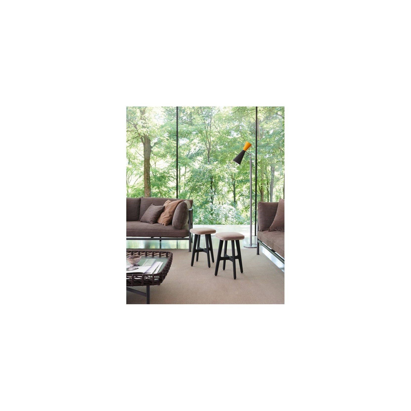 The Gypsy stool reinterprets with an ironic twist a classic furniture item, revealing through its name its nomadic nature with a versatility slant that makes it suitable for different domestic environments. The minimalist padded seat, available in all the coverings from the collection, is supported by a four legs crossed base in matte black lacquer finish beech.